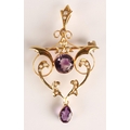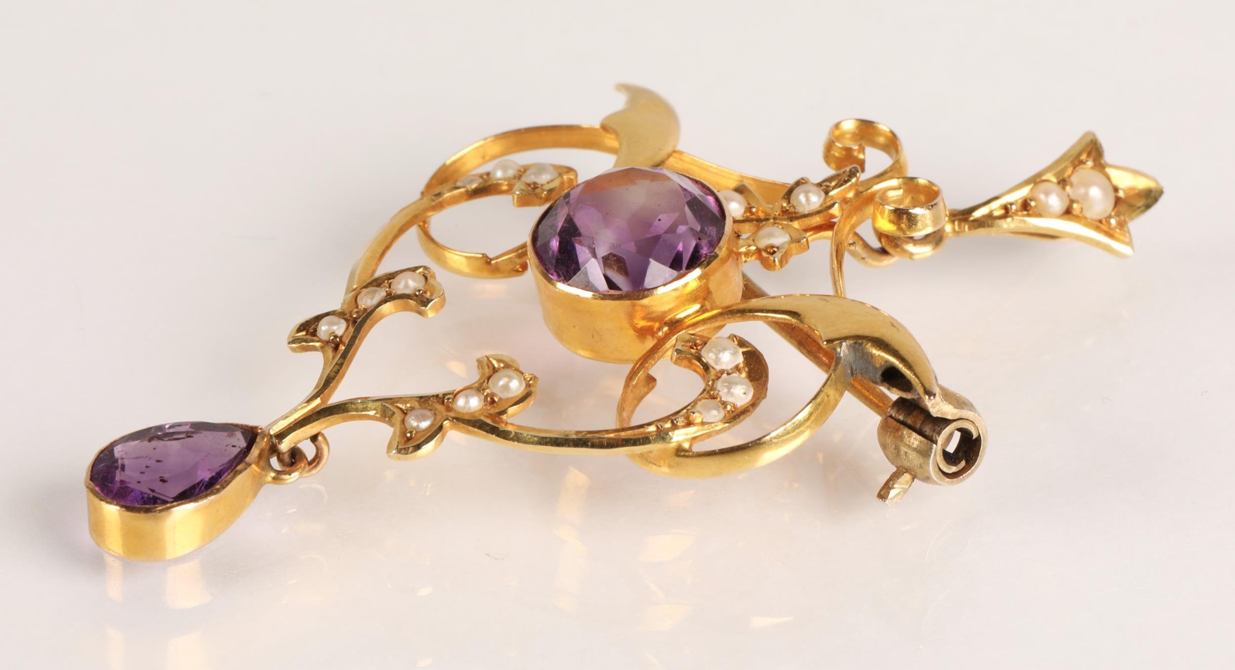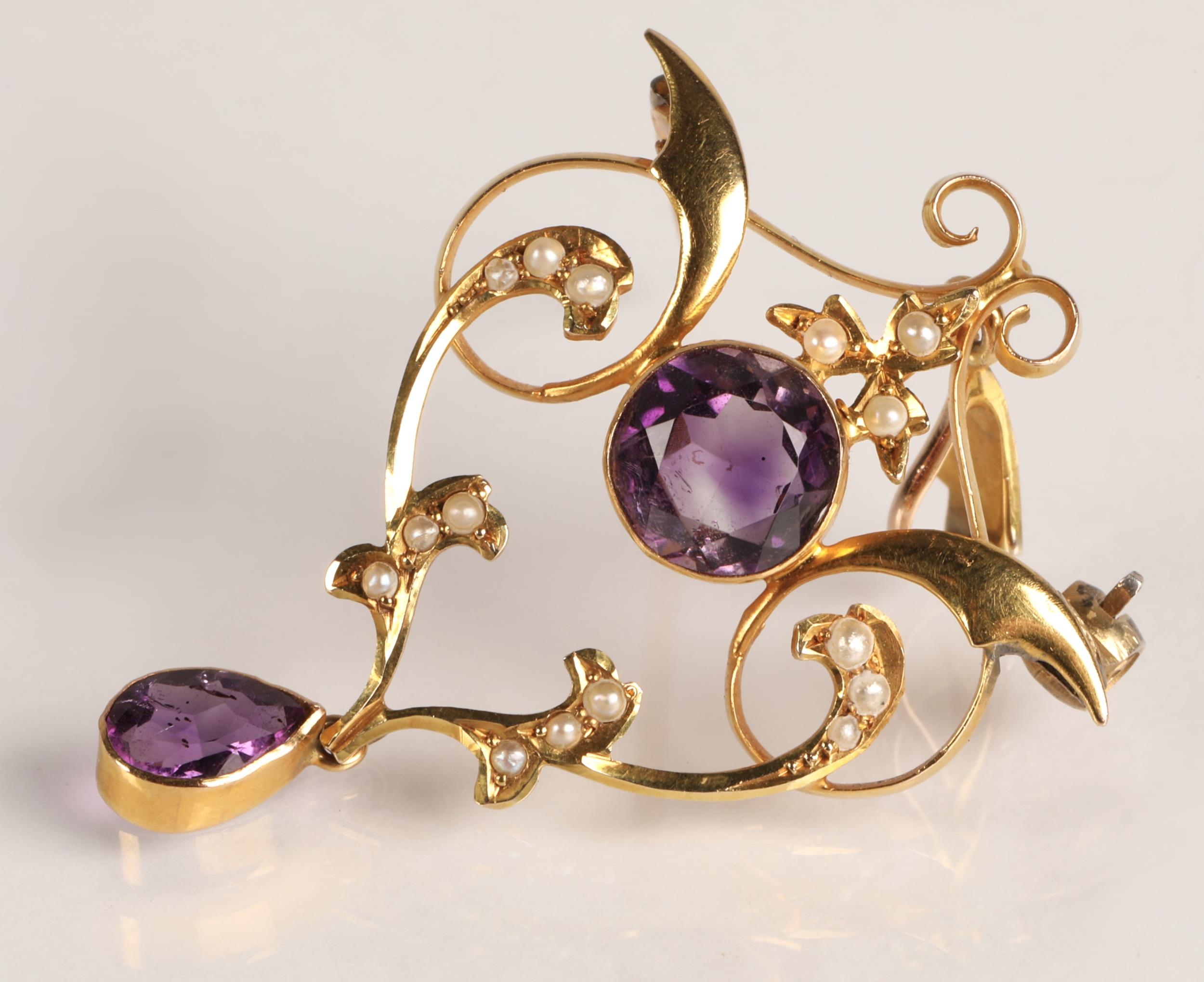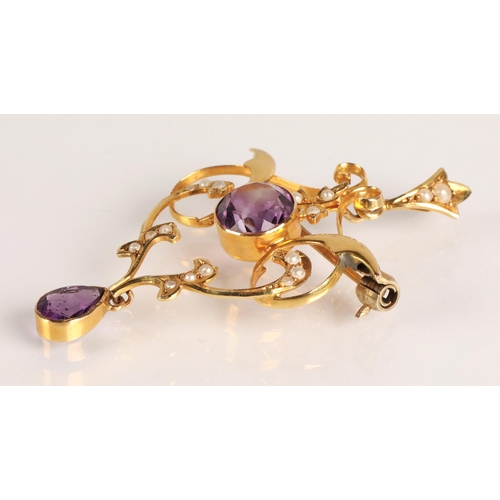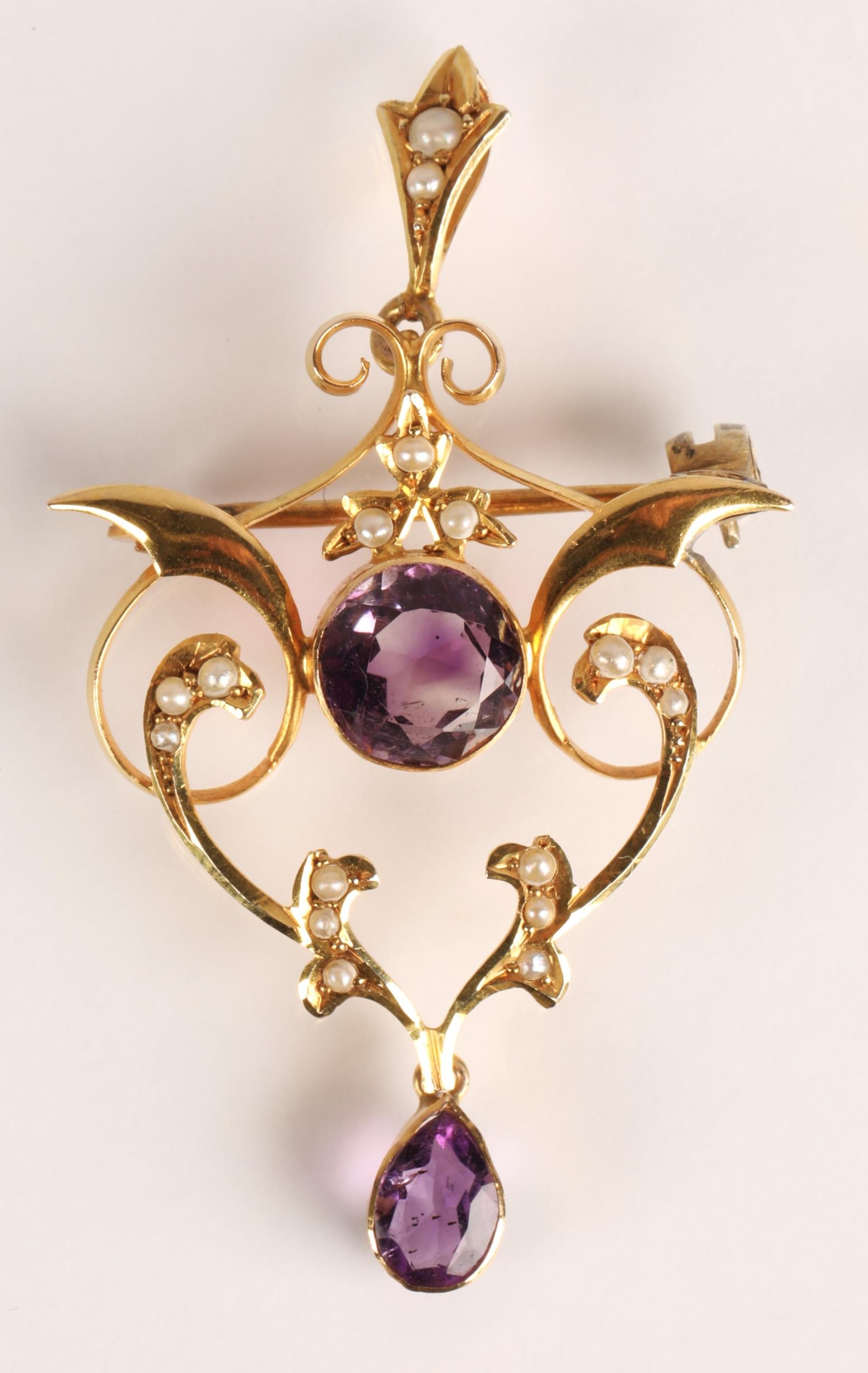 Edwardian 9ct gold pendant brooch set with amethyst and seed pearls, gross weight 3.7g