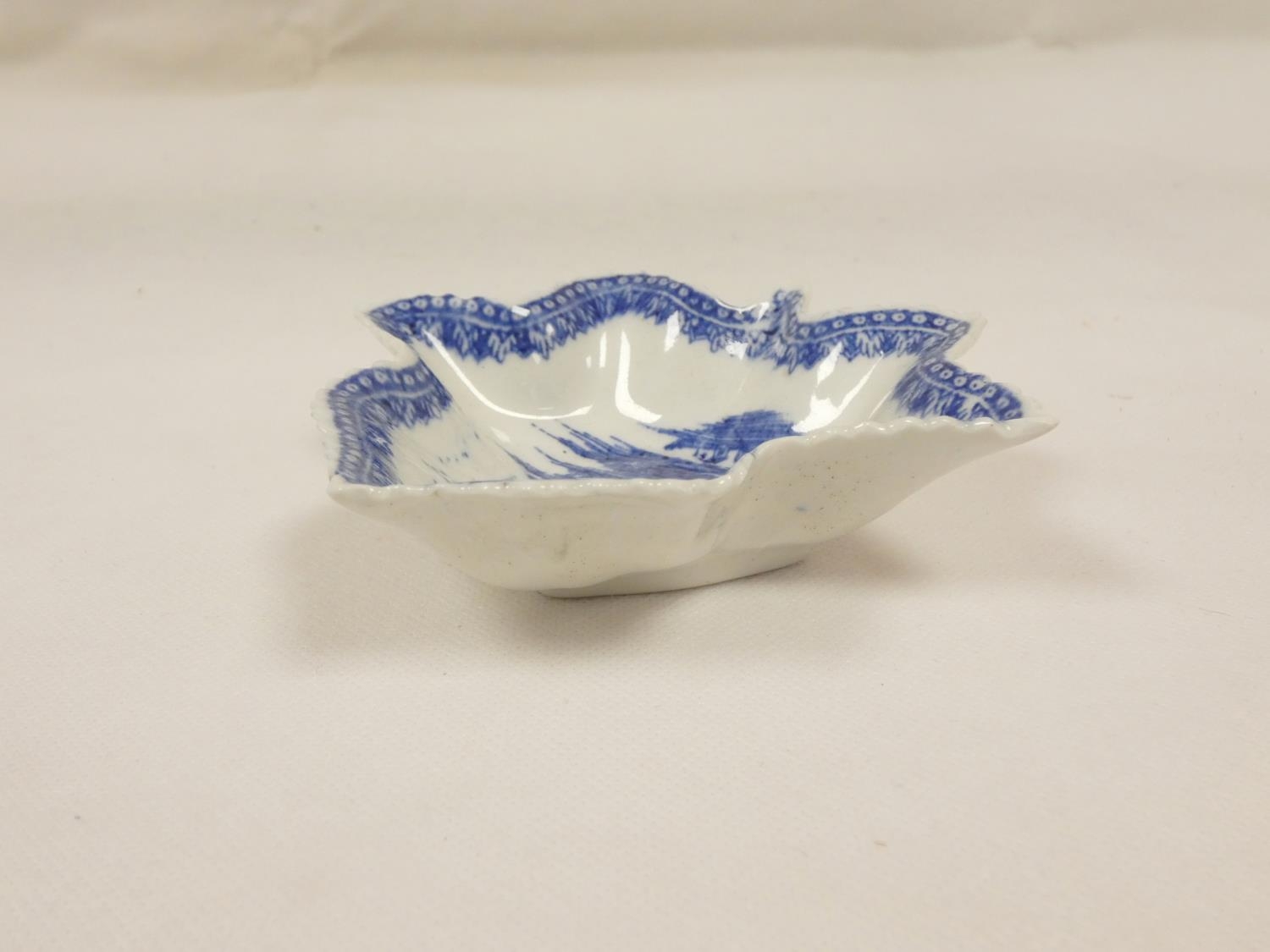 New Hall pickle dish of leaf form, blue printed with "Gazebo" pattern, light rock version. 12cm x 12cm, c.1785.
