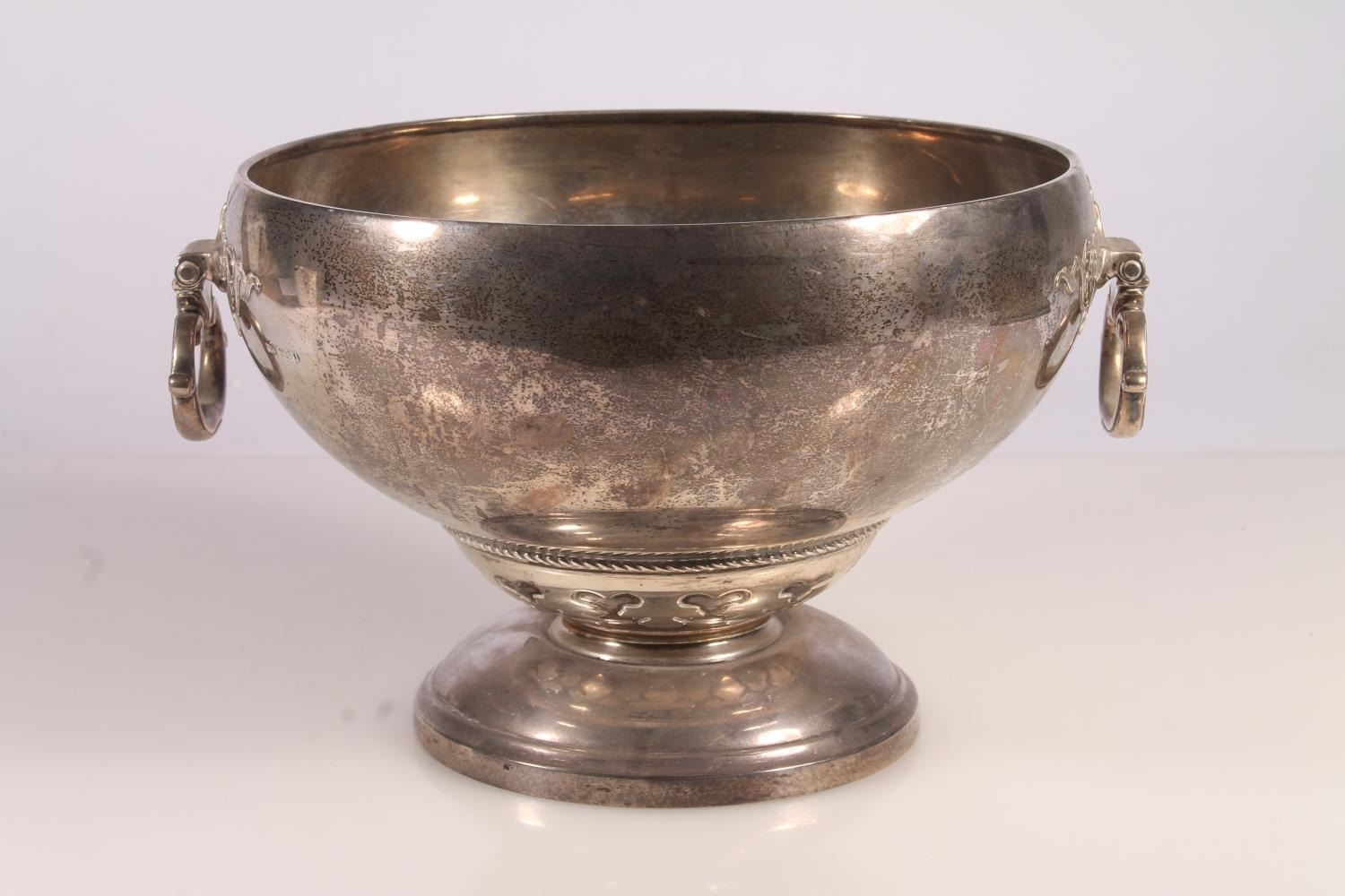 Geo. V silver pedestal fruit bowl, the round bowl with hinged loop handles, tapering to a cast trefoil belt and raised on a round pedestal base, Mappin and Webb Sheffield 1928, 1.158kg, W25cm.