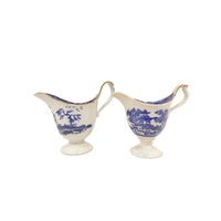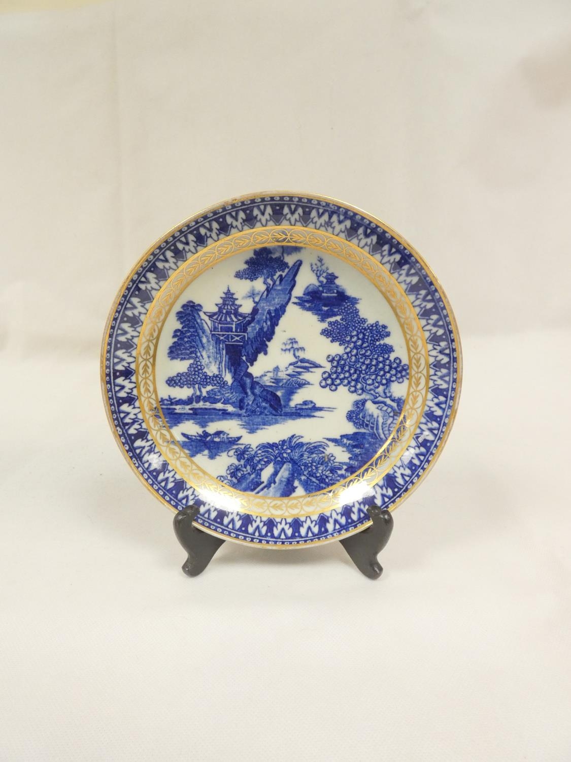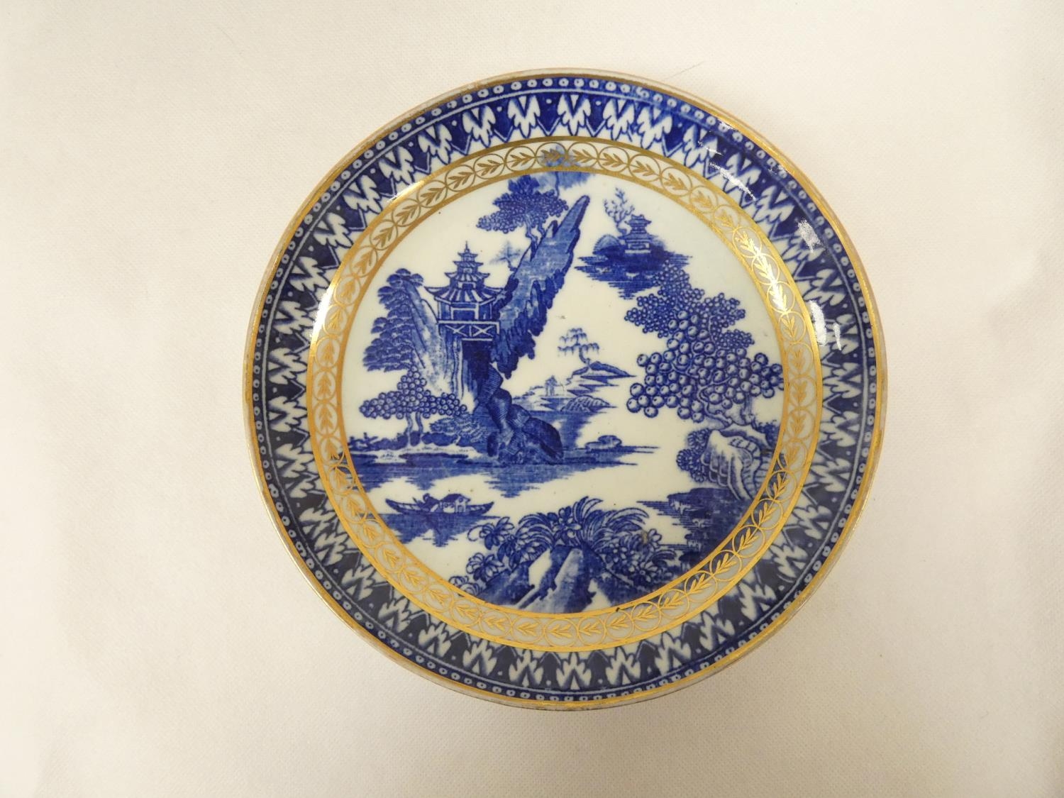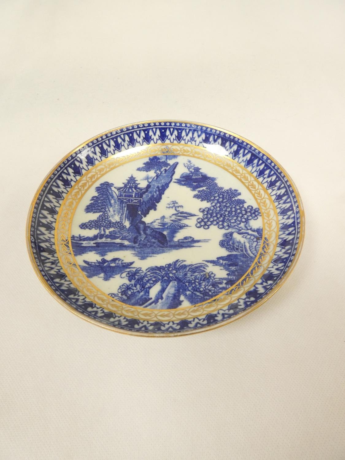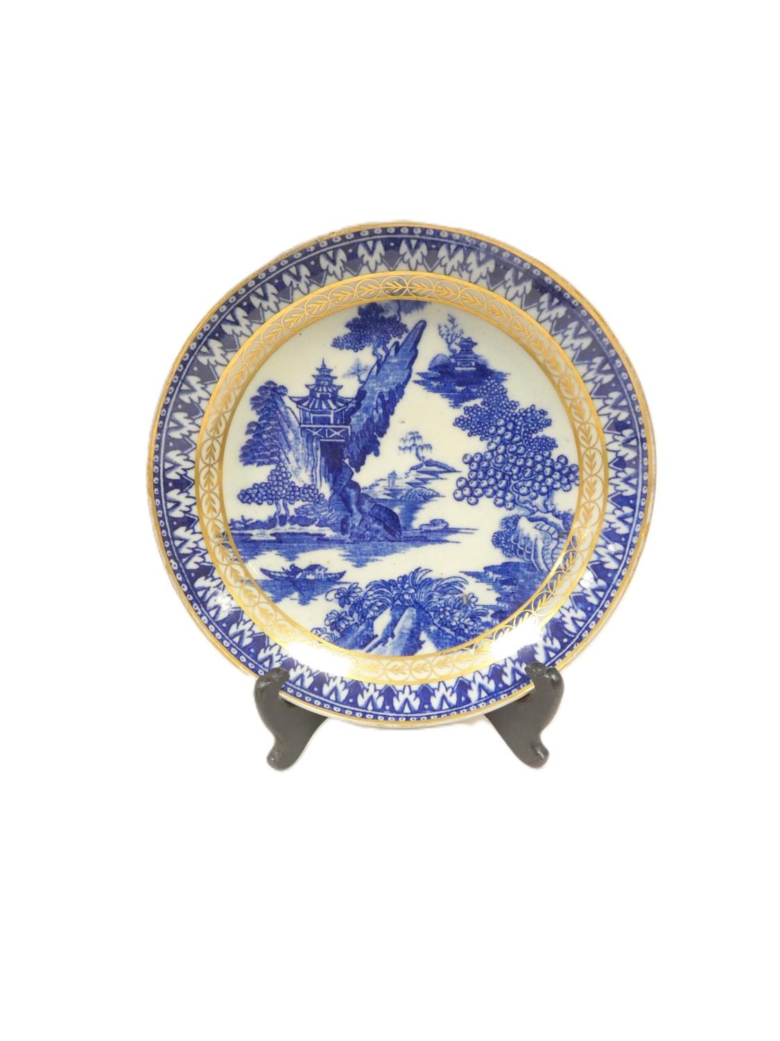 New Hall or Enoch Wood bread and butter plate, blue printed in dark rock "Gazebo" pattern with gilt foliate band, 19cm diameter, c.1785/90. Ex Holgate collection and part of a service with a rampant lion marked teapot at plate 185 of Holgate's book, 1971.