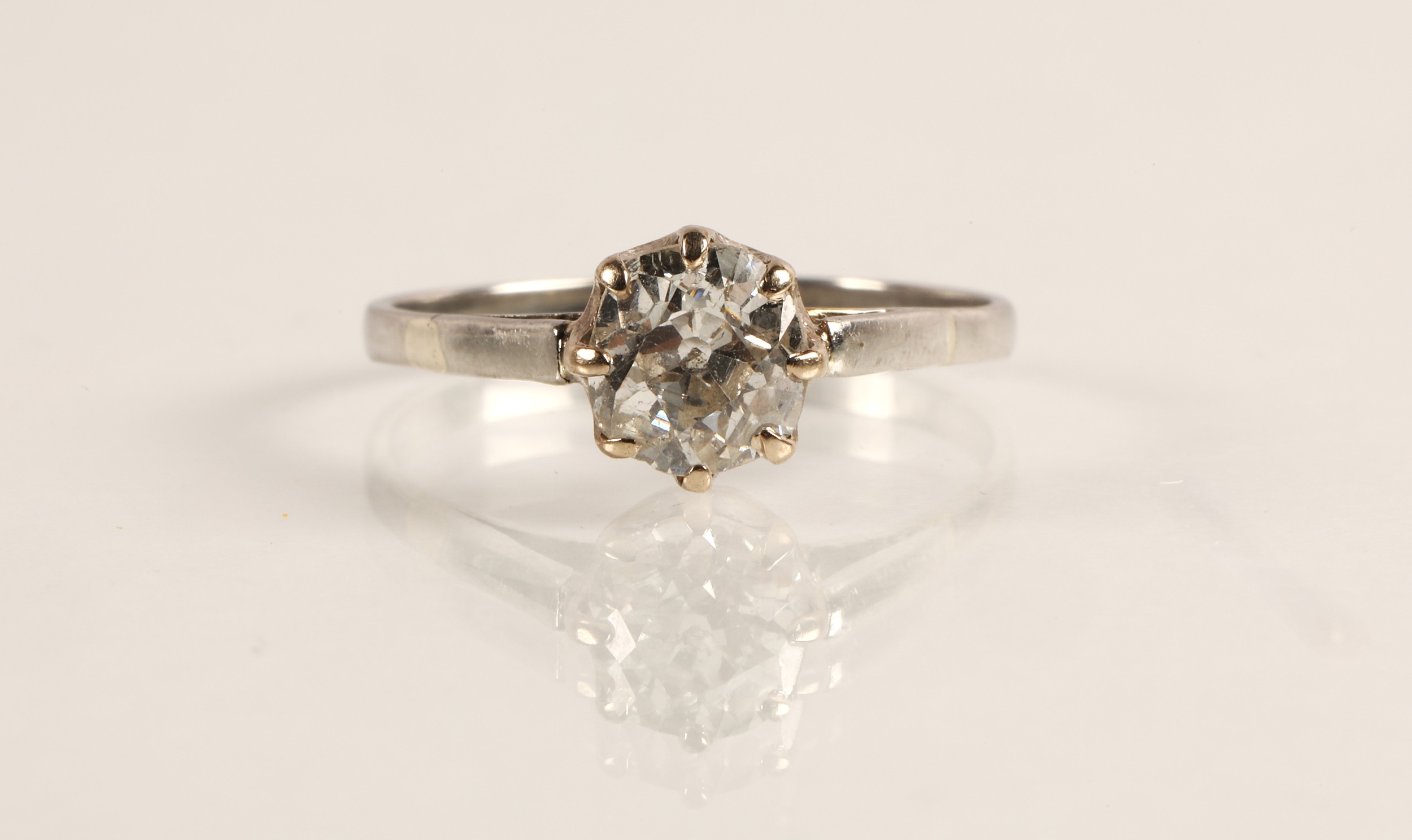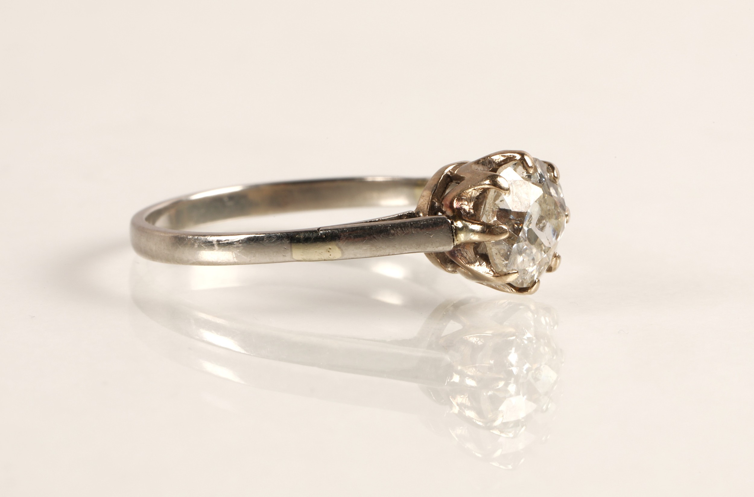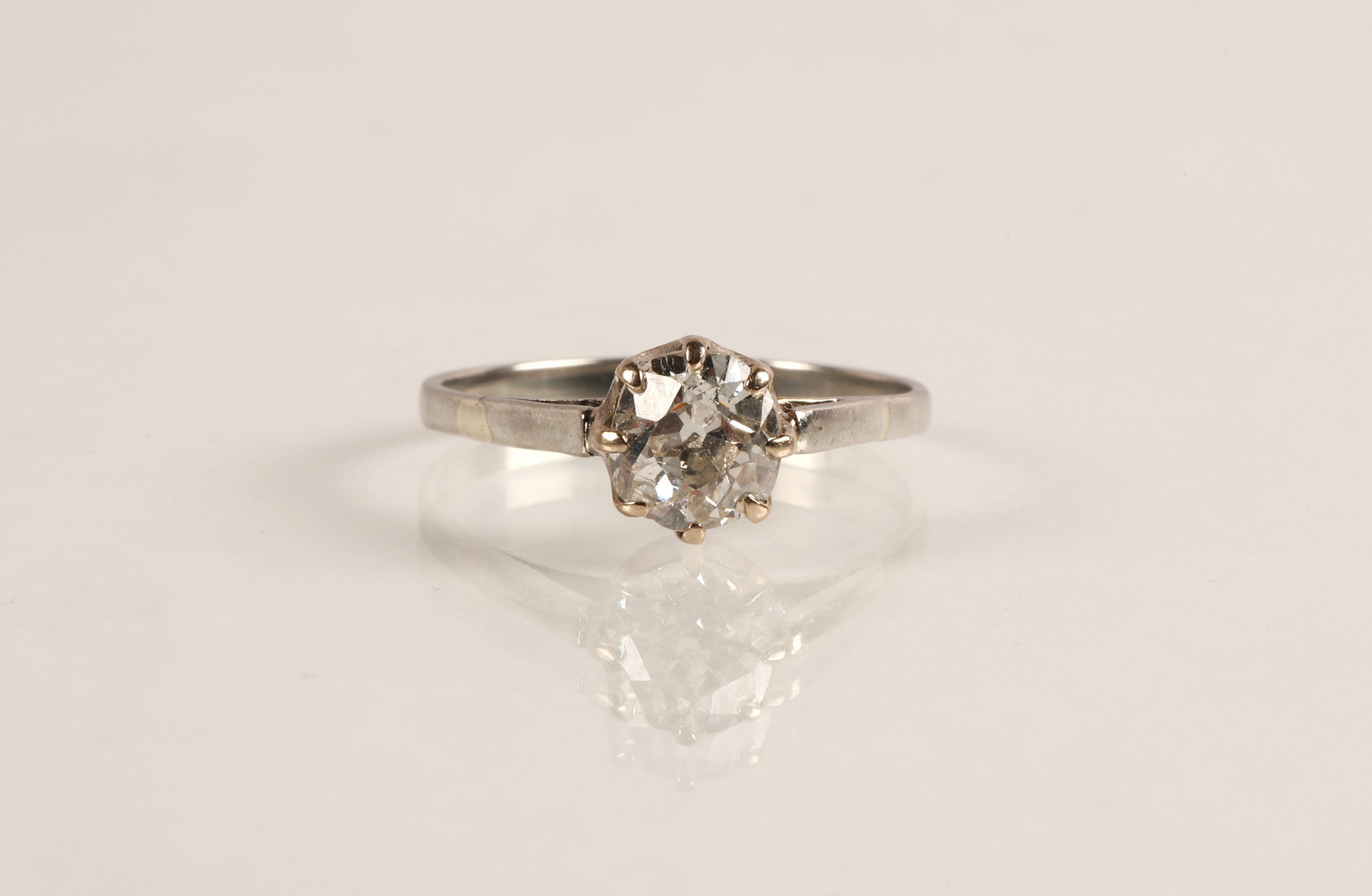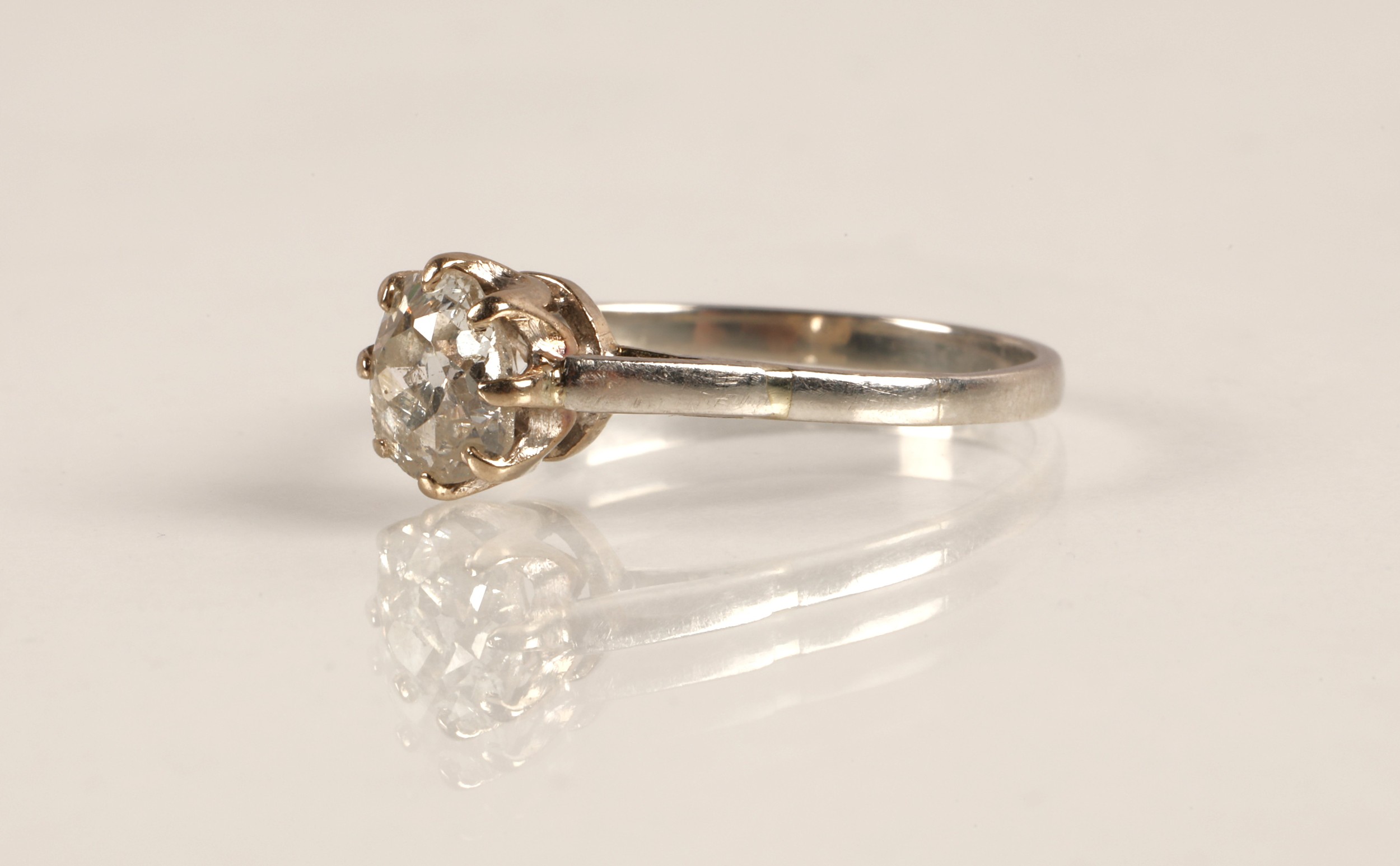 Ladies diamond solitaire ring, diamond is old cut approximately one carat, set on an unmarked white metal shank, approximate colour G-H, approximate clarity P2, ring size N/O