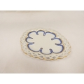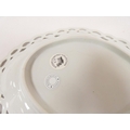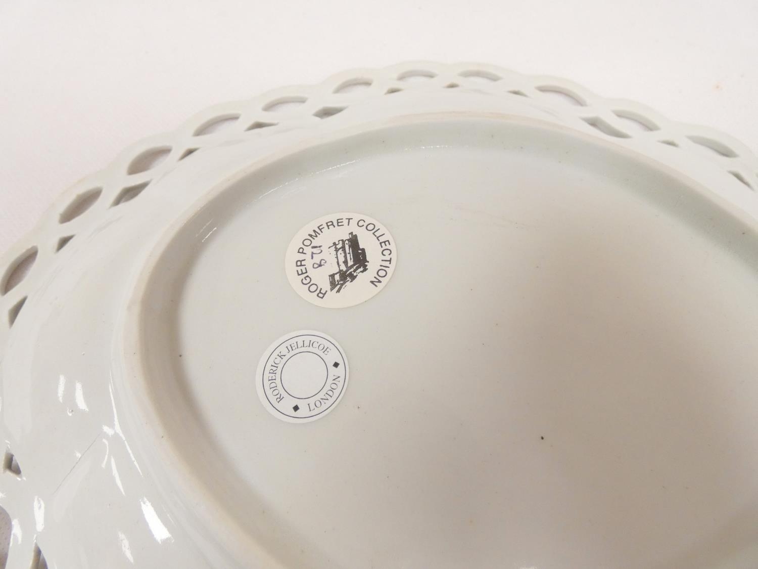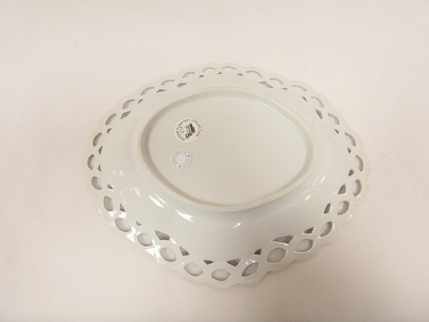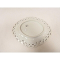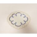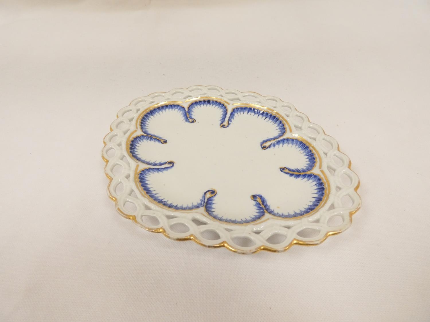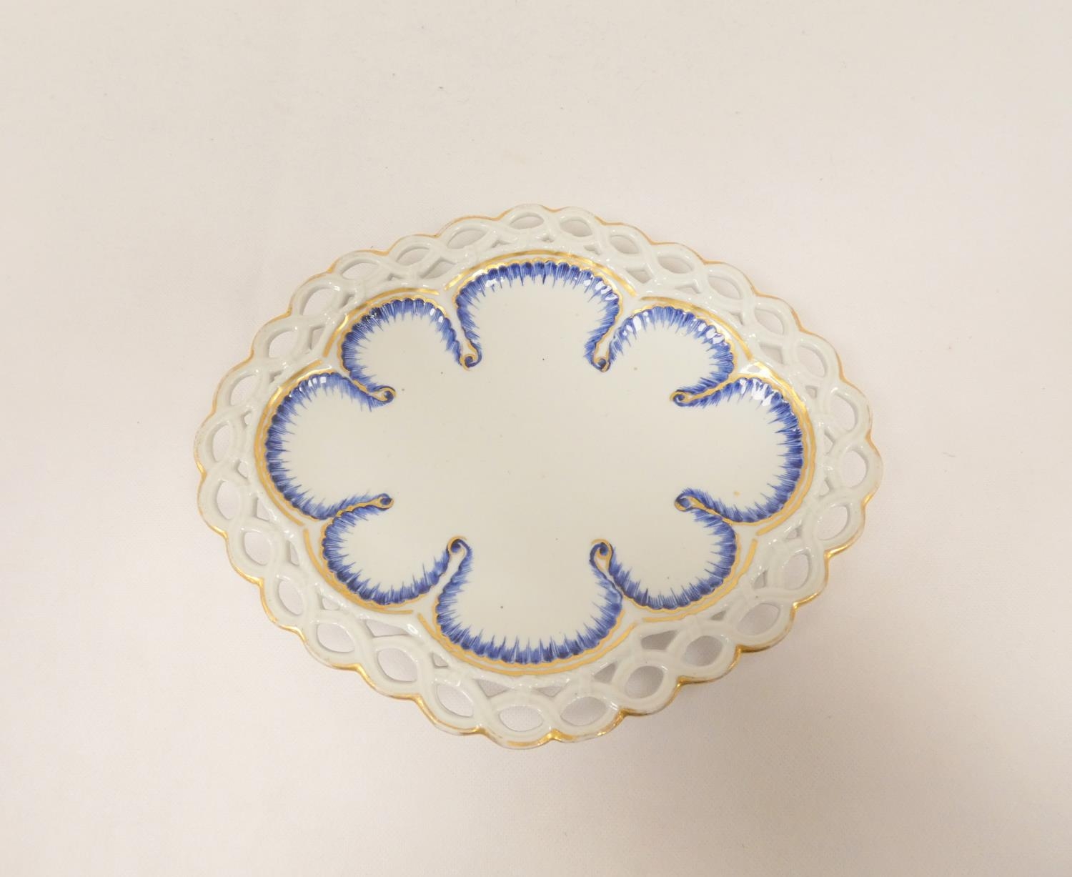 Rare New Hall shallow dessert dish decorated in blue and gold, of lobed oval form with shell moulding and pierced rim (see Holgate pl. 75/6), 26cm wide, c.1787/93. Prov. Roderick Jellicoe.