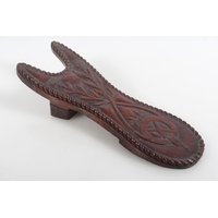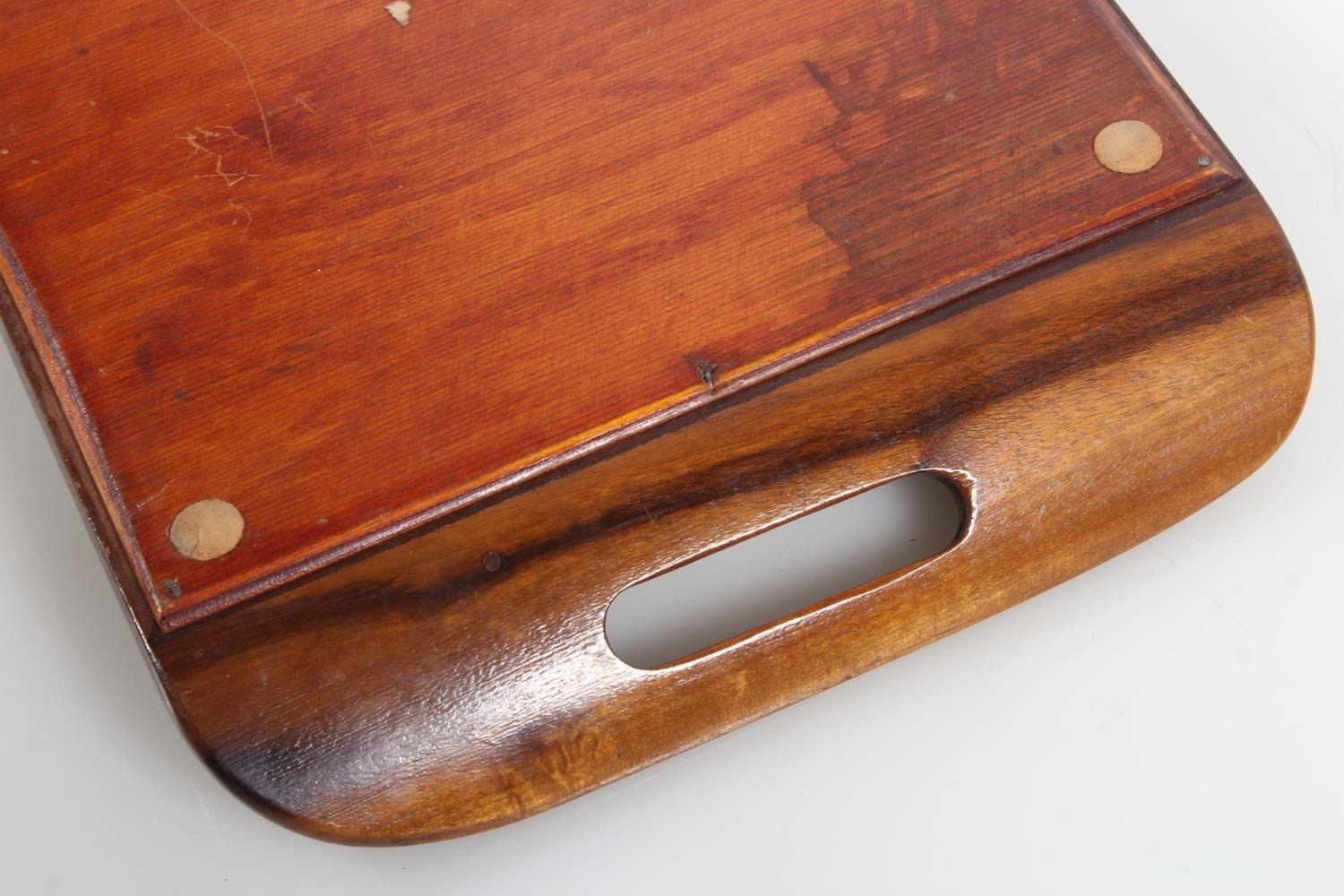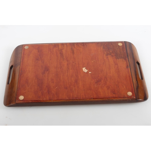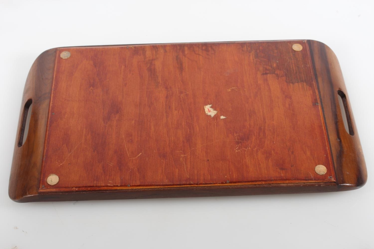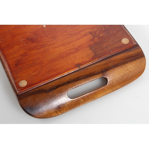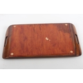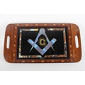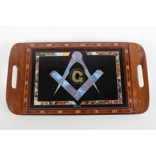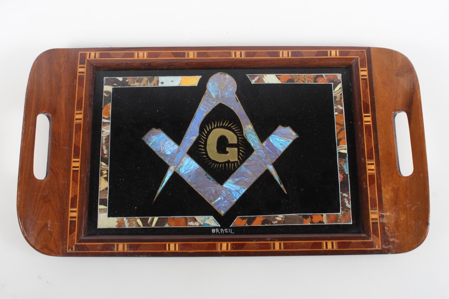 Masonic interest, a butterfly wing inlaid and specimen wood serving tray, the centre with Masonic G, compass and square device, 42cm long.