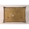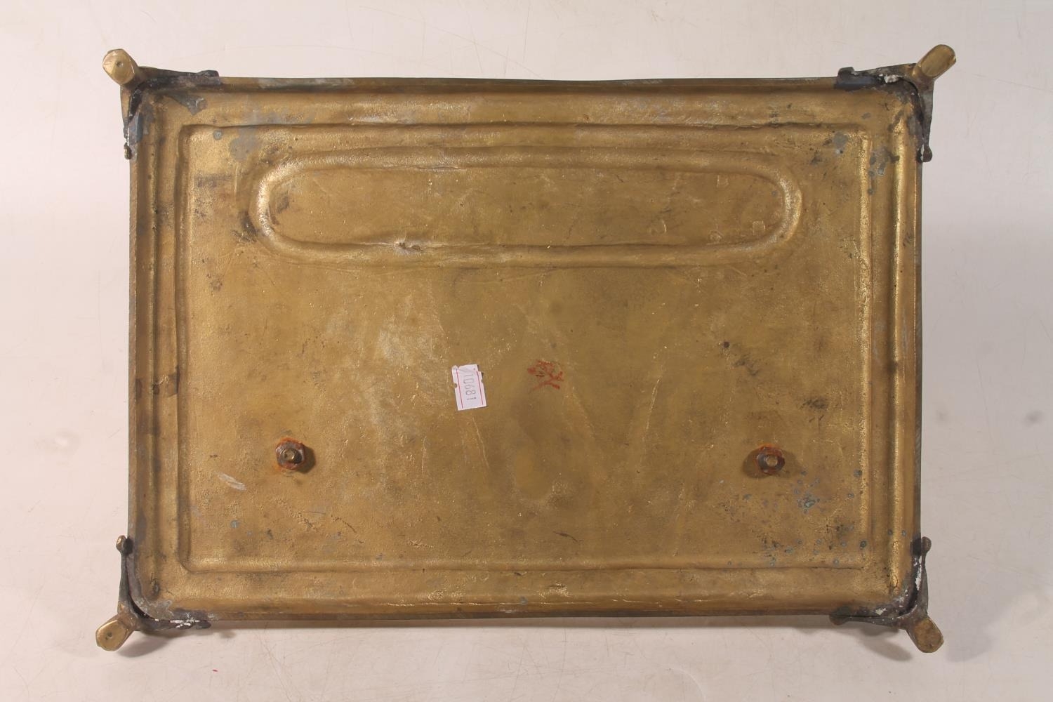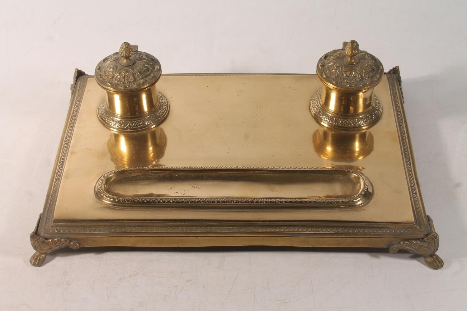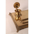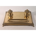 Brass pen stand with two integral ink stands, 32cm wide.