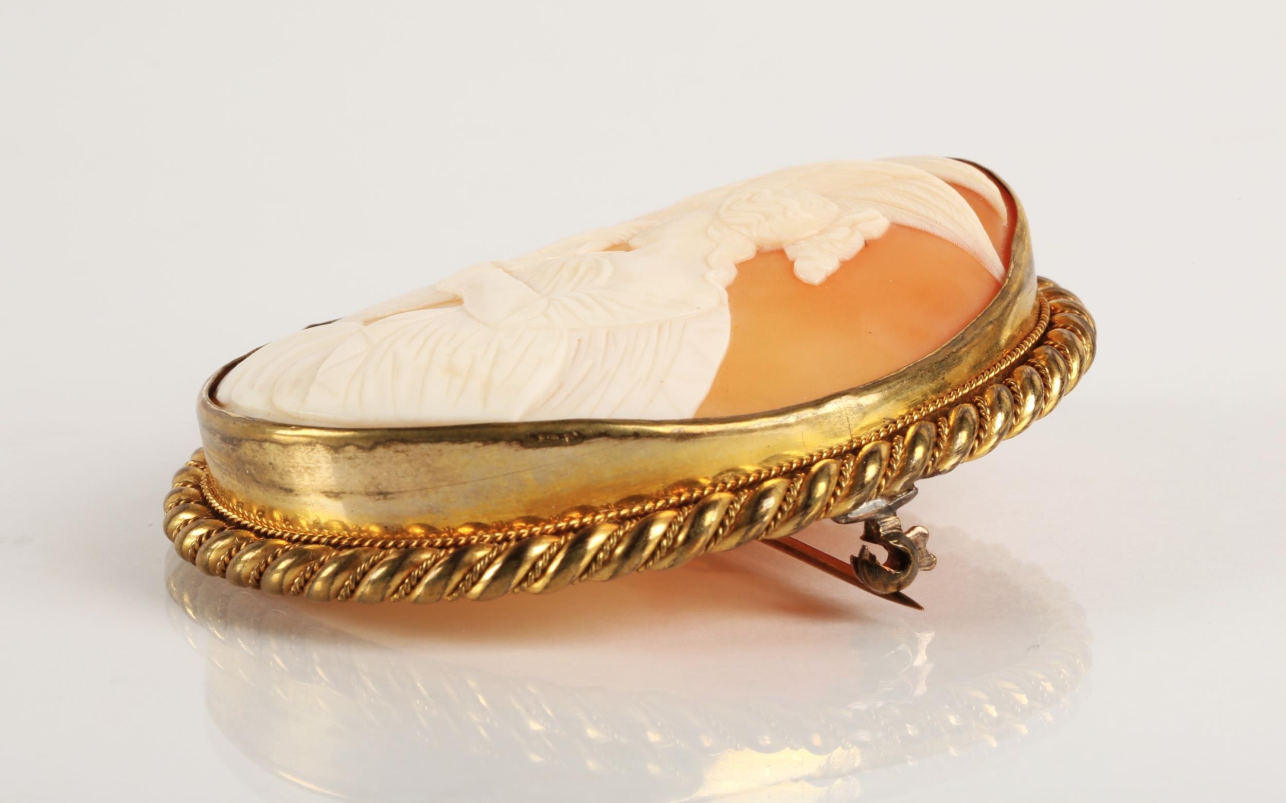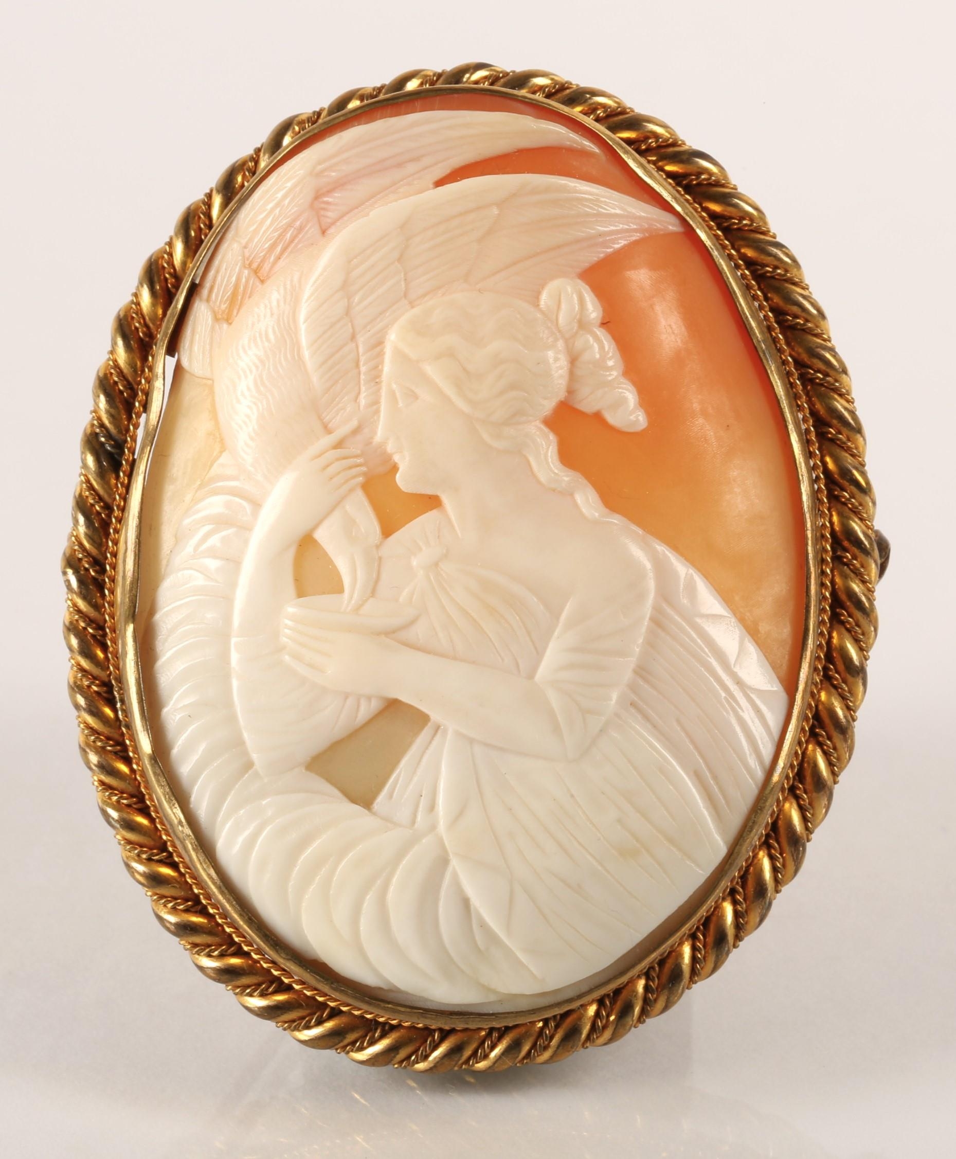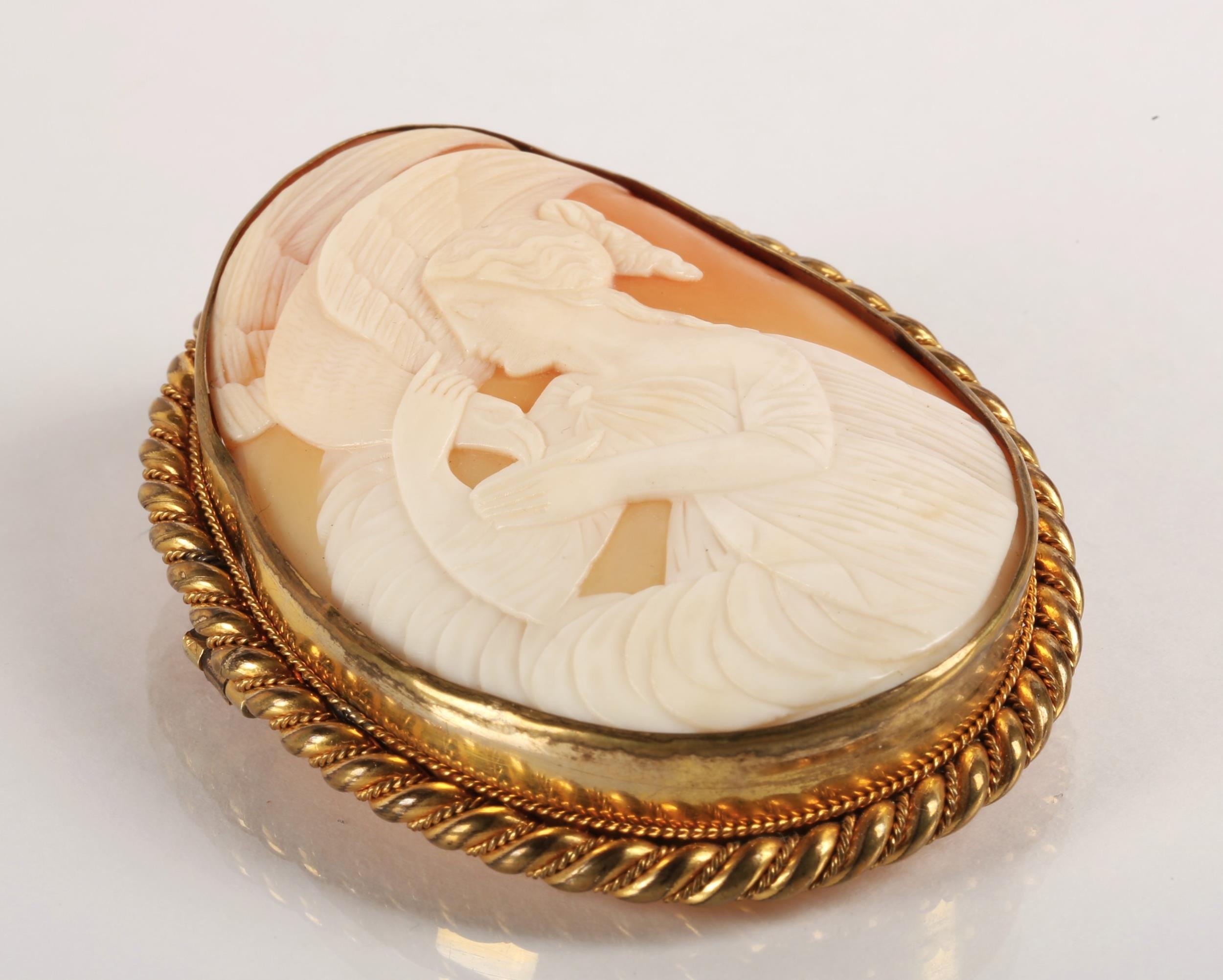 Victorian unmarked gold mounted carved shell cameo brooch, depicting Hebe, the Greek goddess of youth, cameo approximately 5cm x 4cm, overall approximately 7.5cm x 6cm, gross weight 31.4 grams