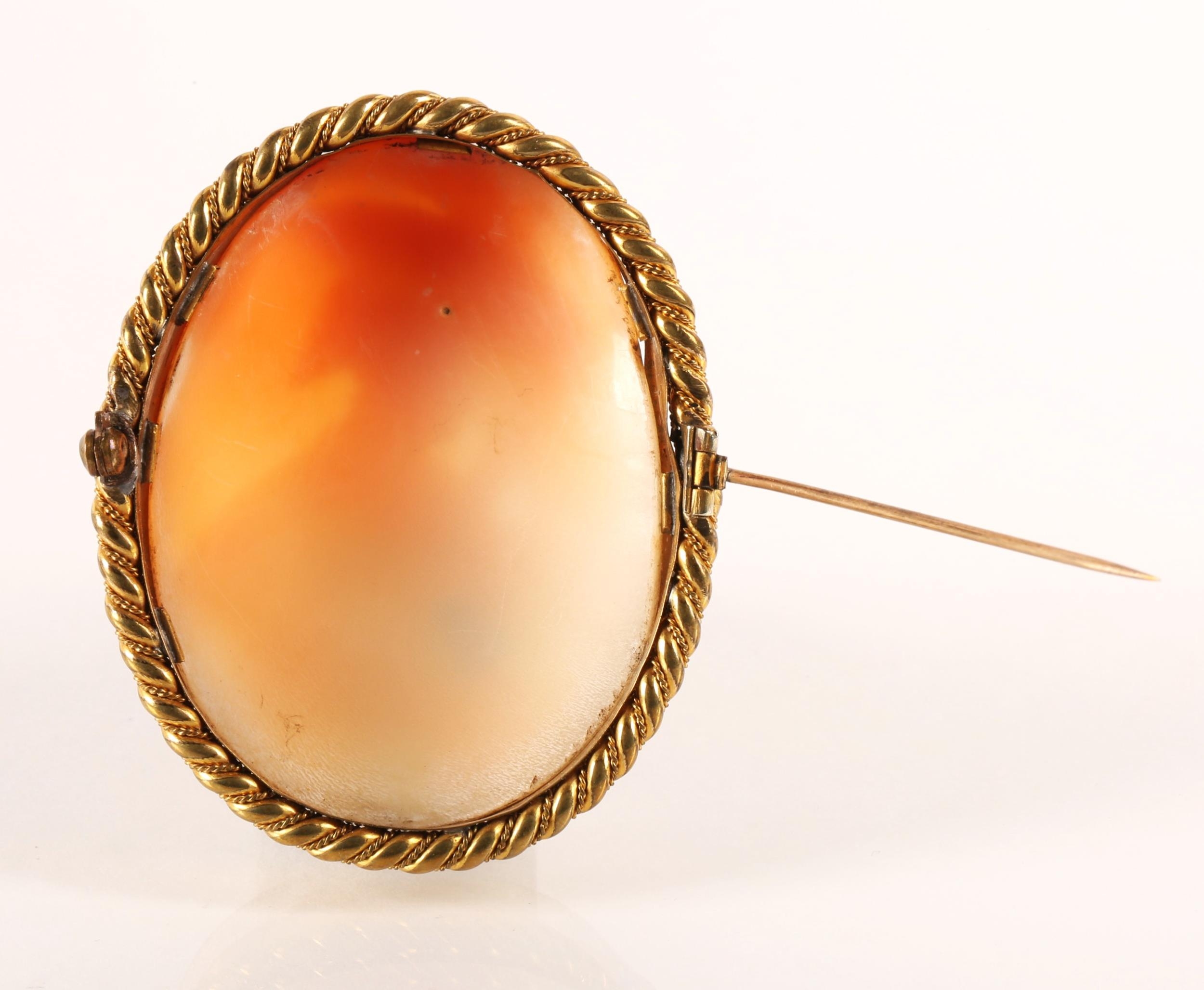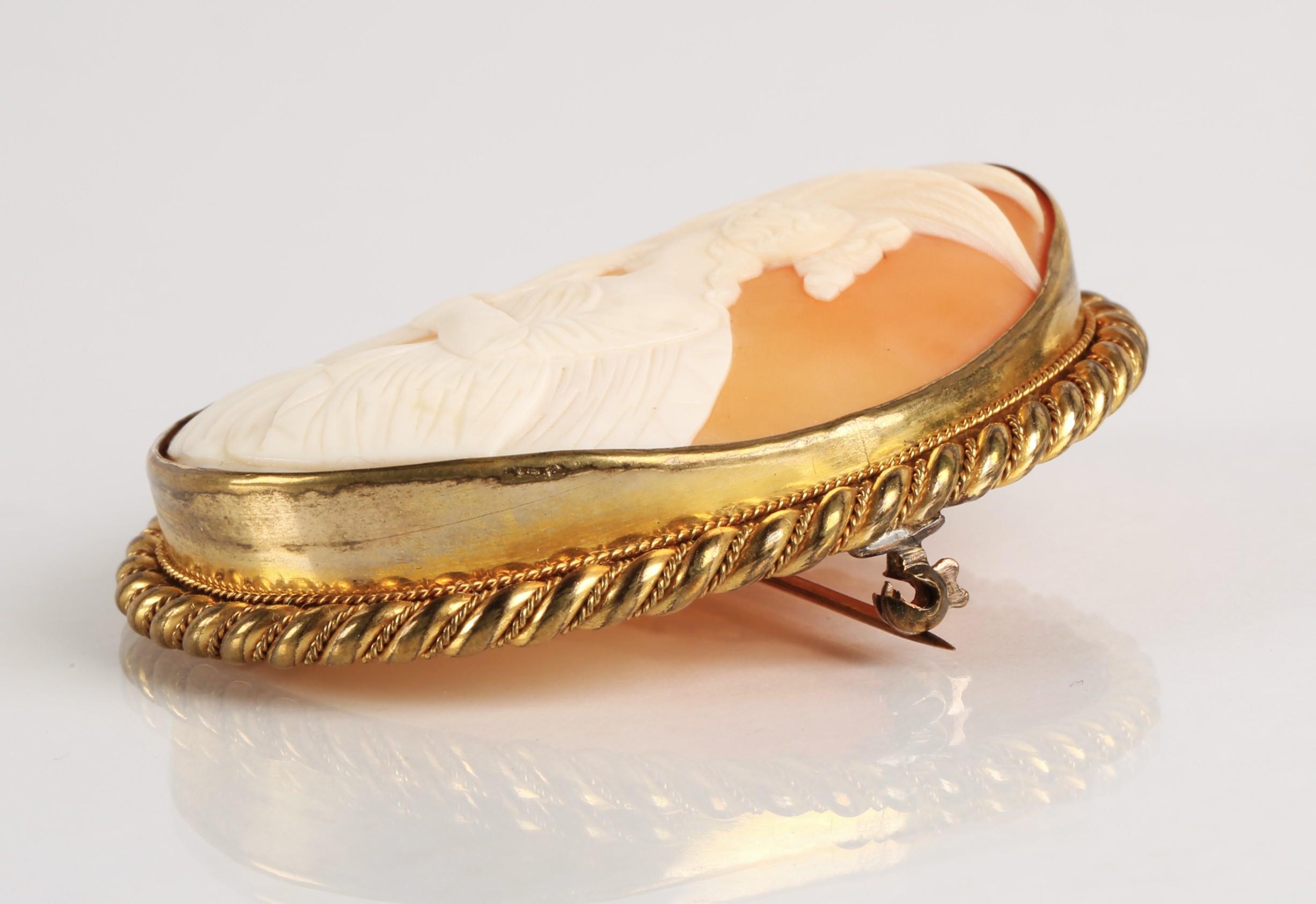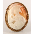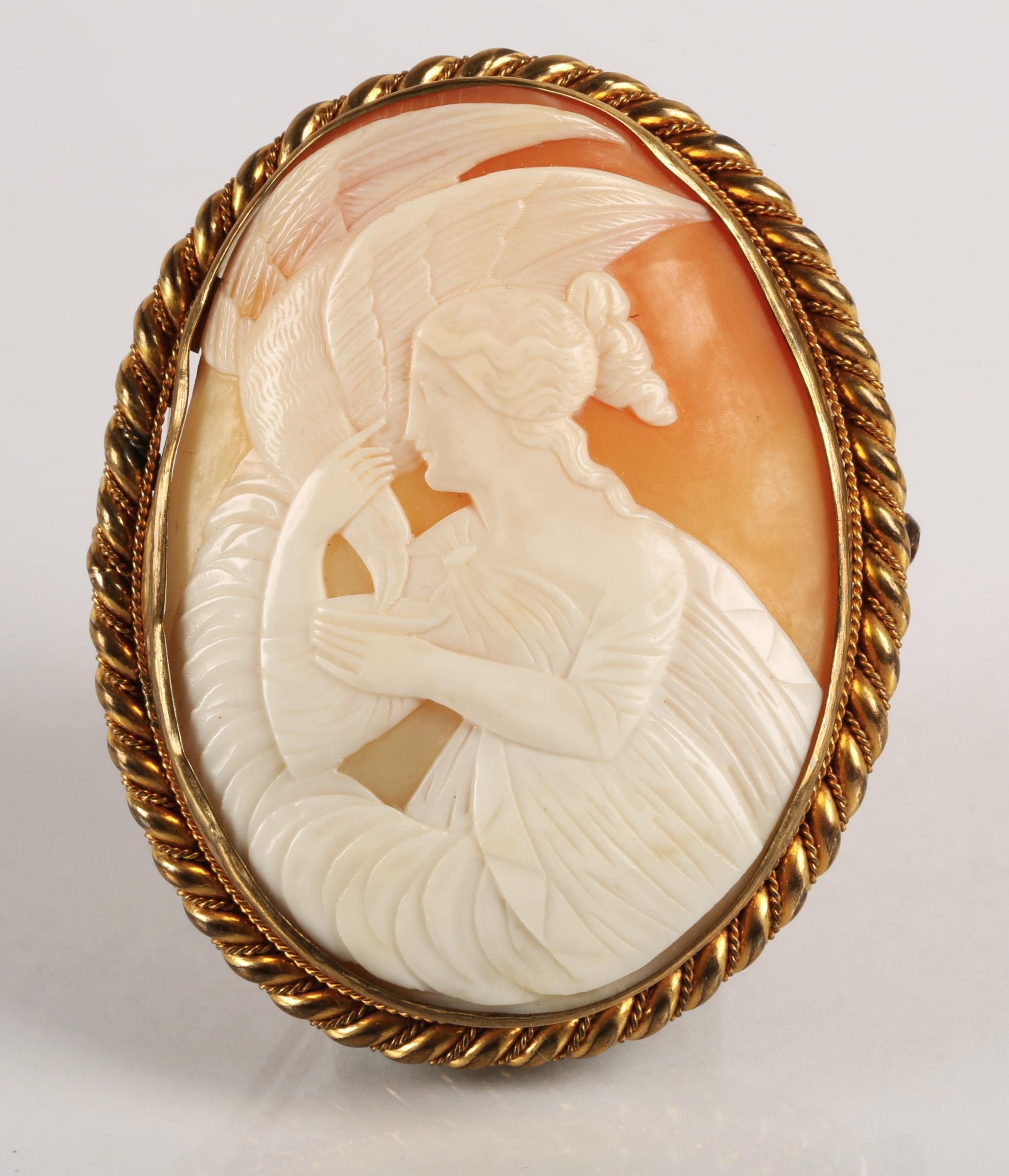 Victorian unmarked gold mounted carved shell cameo brooch, depicting Hebe, the Greek goddess of youth, cameo approximately 5cm x 4cm, overall approximately 7.5cm x 6cm, gross weight 31.4 grams