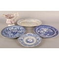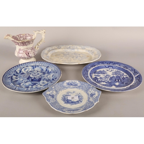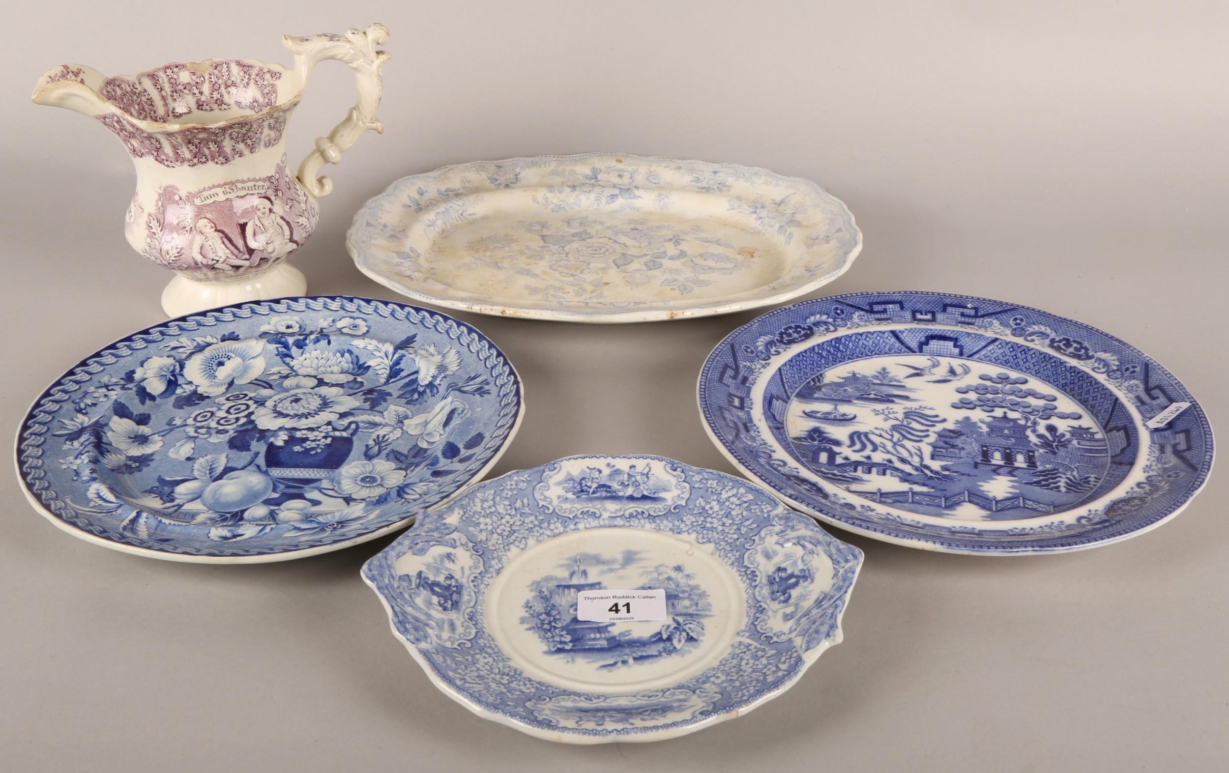 Staffordshire 'Tam o' Shanter' purple jug, stands 17cm, Barker & Till blue willow patterned circular plate with three other blue and white patterned plates (5)