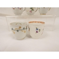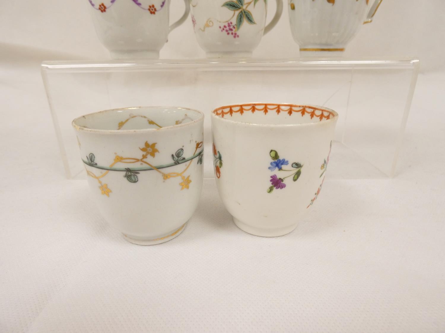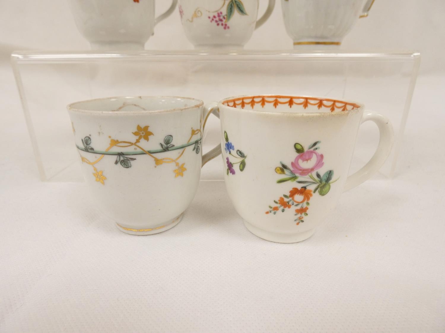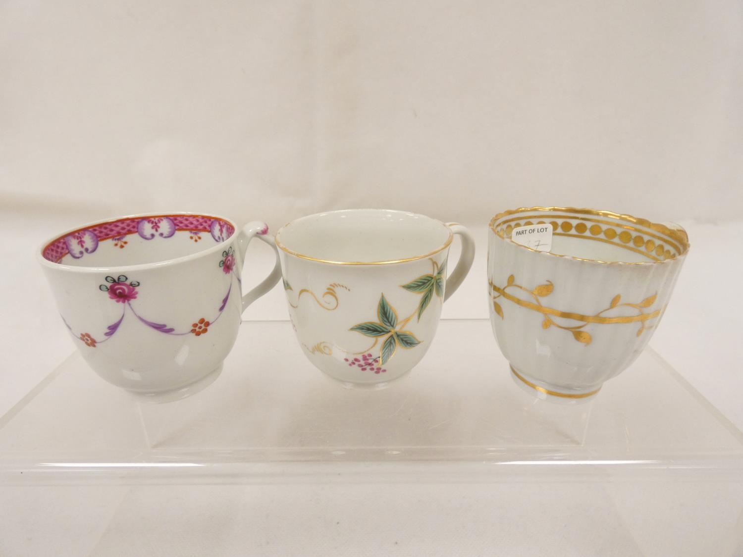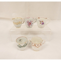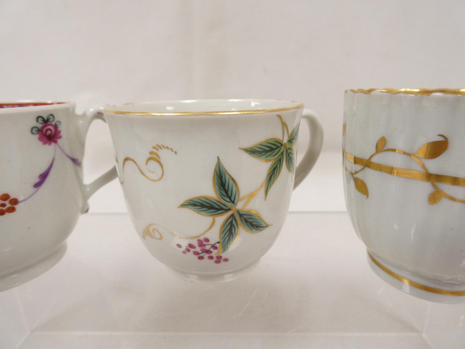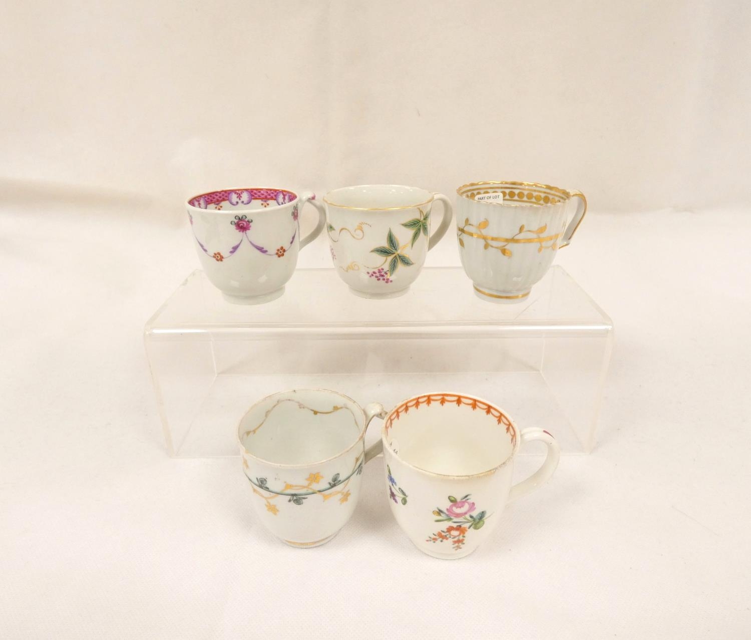 New Hall coffee cup of very rare ribbed form with unusual shaped handle, gilt line and trailing foliate decoration, 6cm high, c.1784/88; also four other New Hall coffee cups, various polychrome patterns, two with with rare plain grooved loop handles, the others with clip handles. (5).