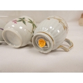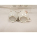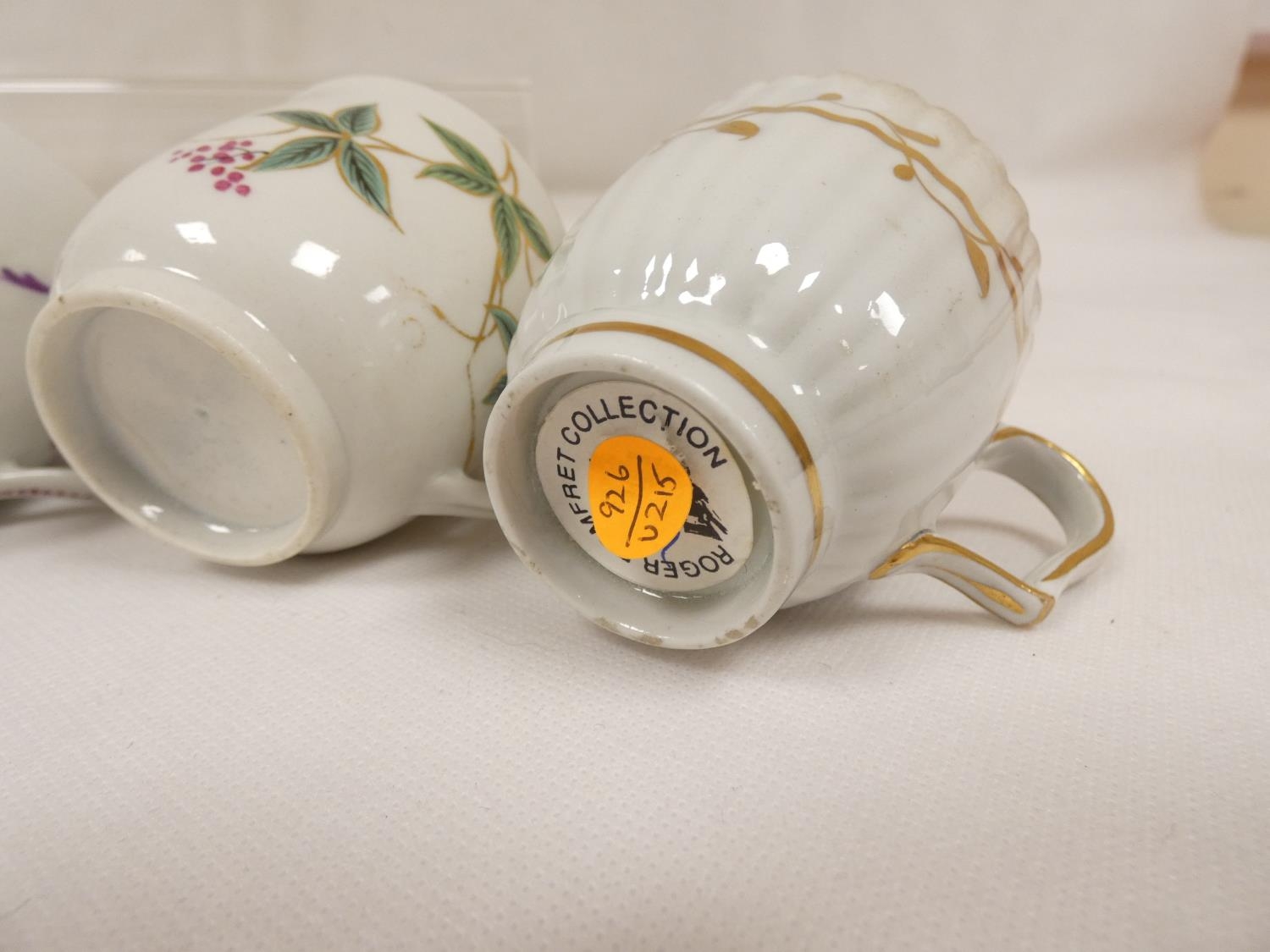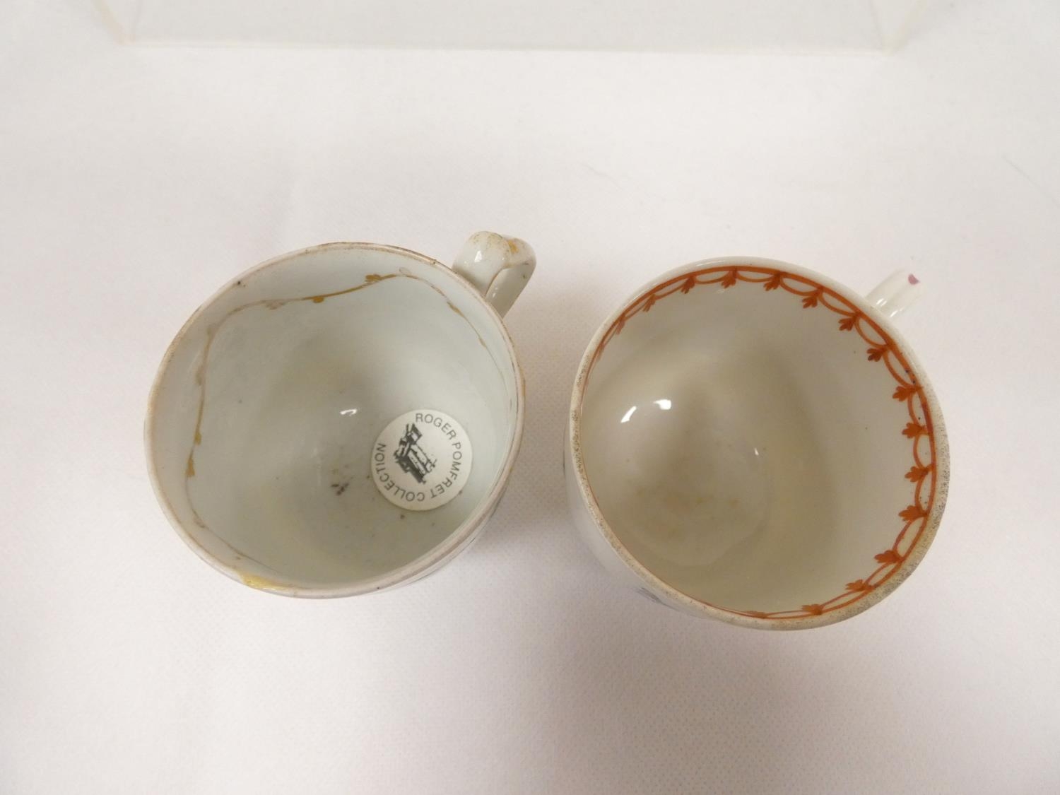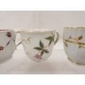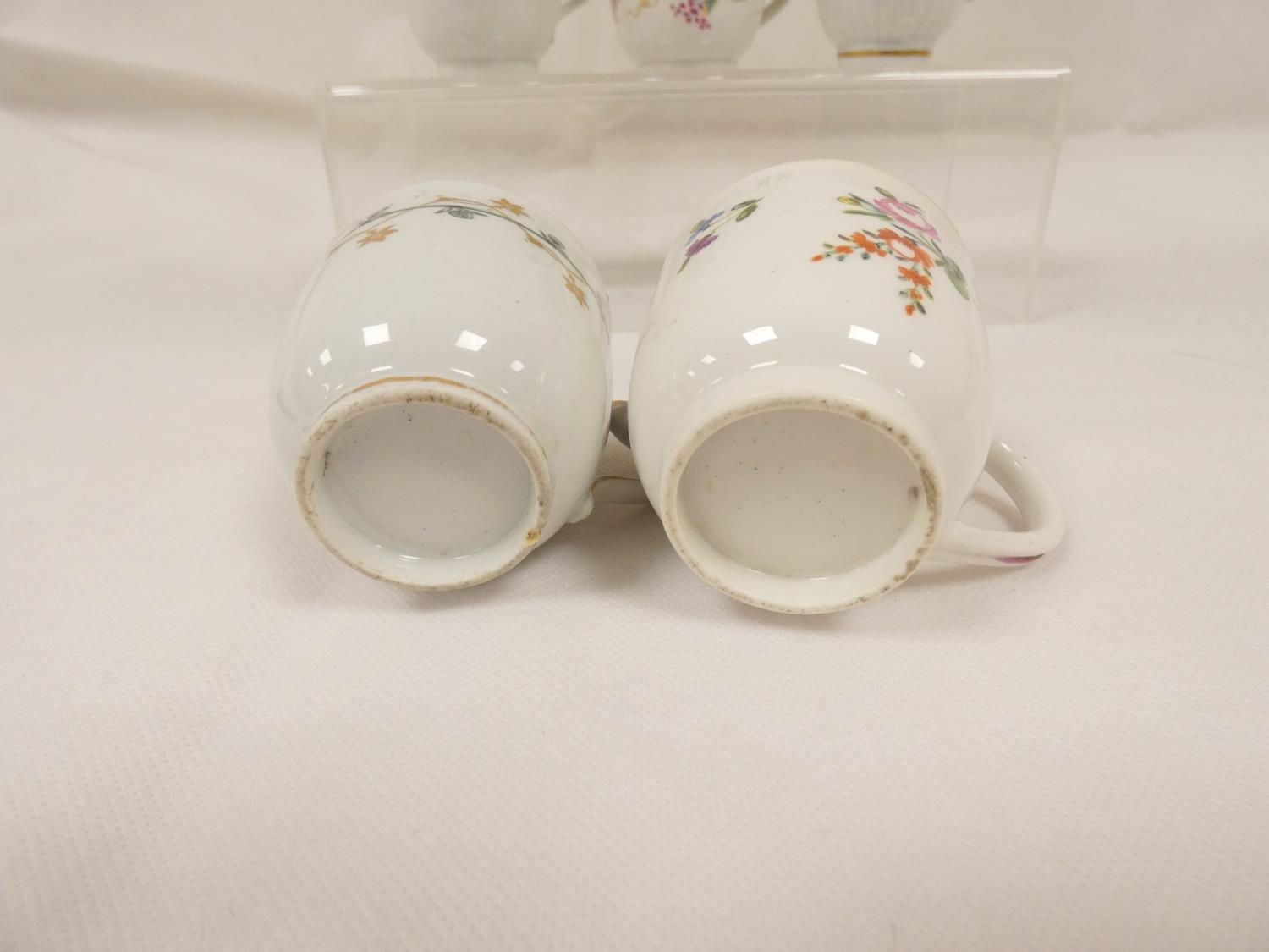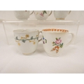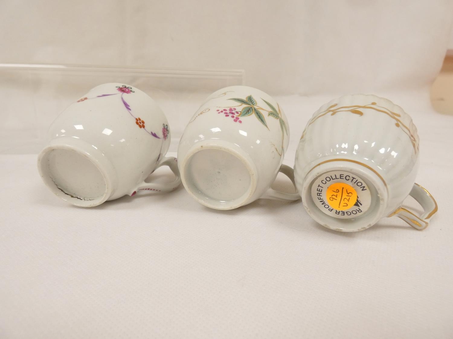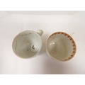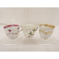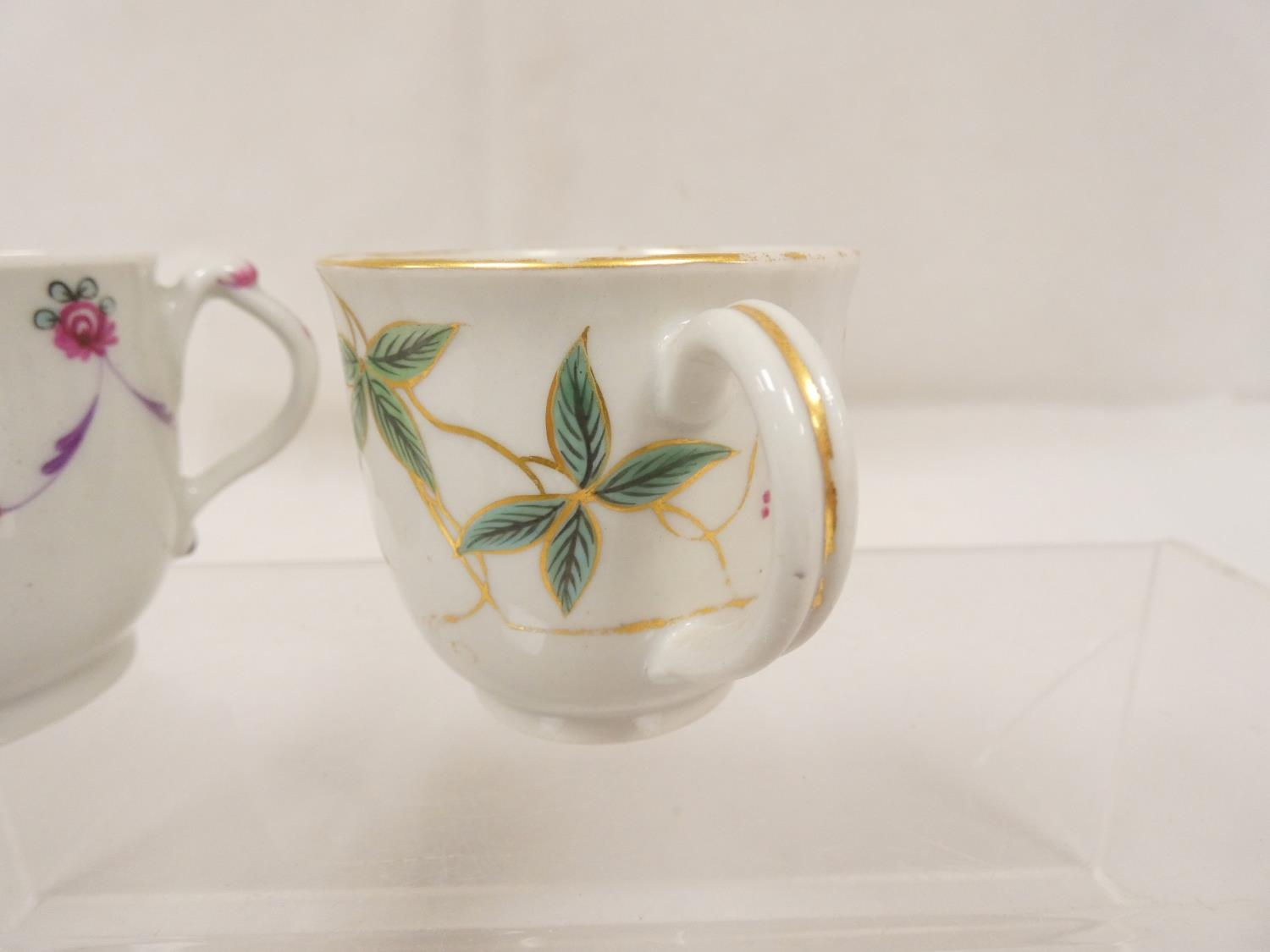 New Hall coffee cup of very rare ribbed form with unusual shaped handle, gilt line and trailing foliate decoration, 6cm high, c.1784/88; also four other New Hall coffee cups, various polychrome patterns, two with with rare plain grooved loop handles, the others with clip handles. (5).