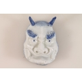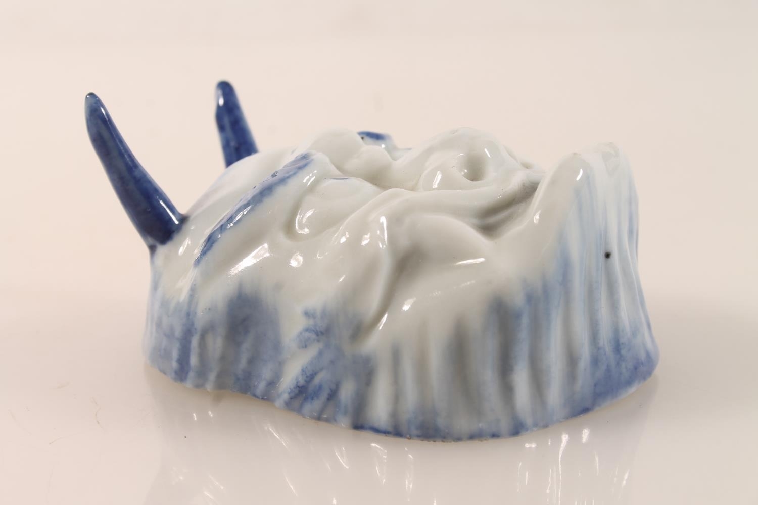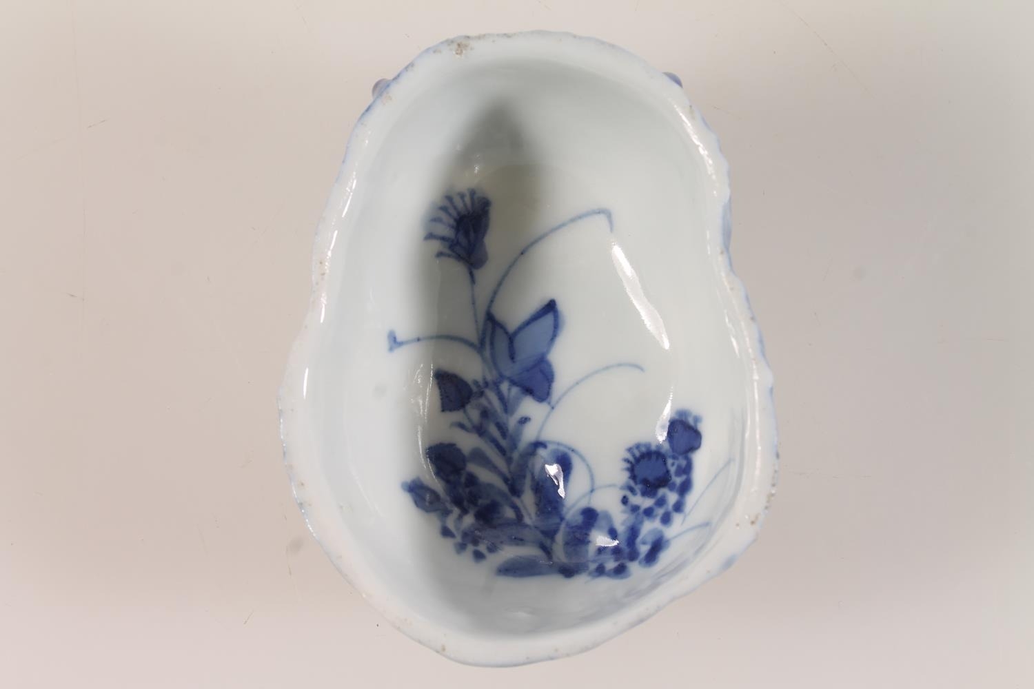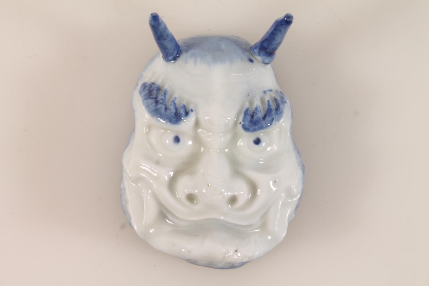 Antique blue and white porcelain pickle dish in the form of a devil mask with painted floral interior, 8cm long.