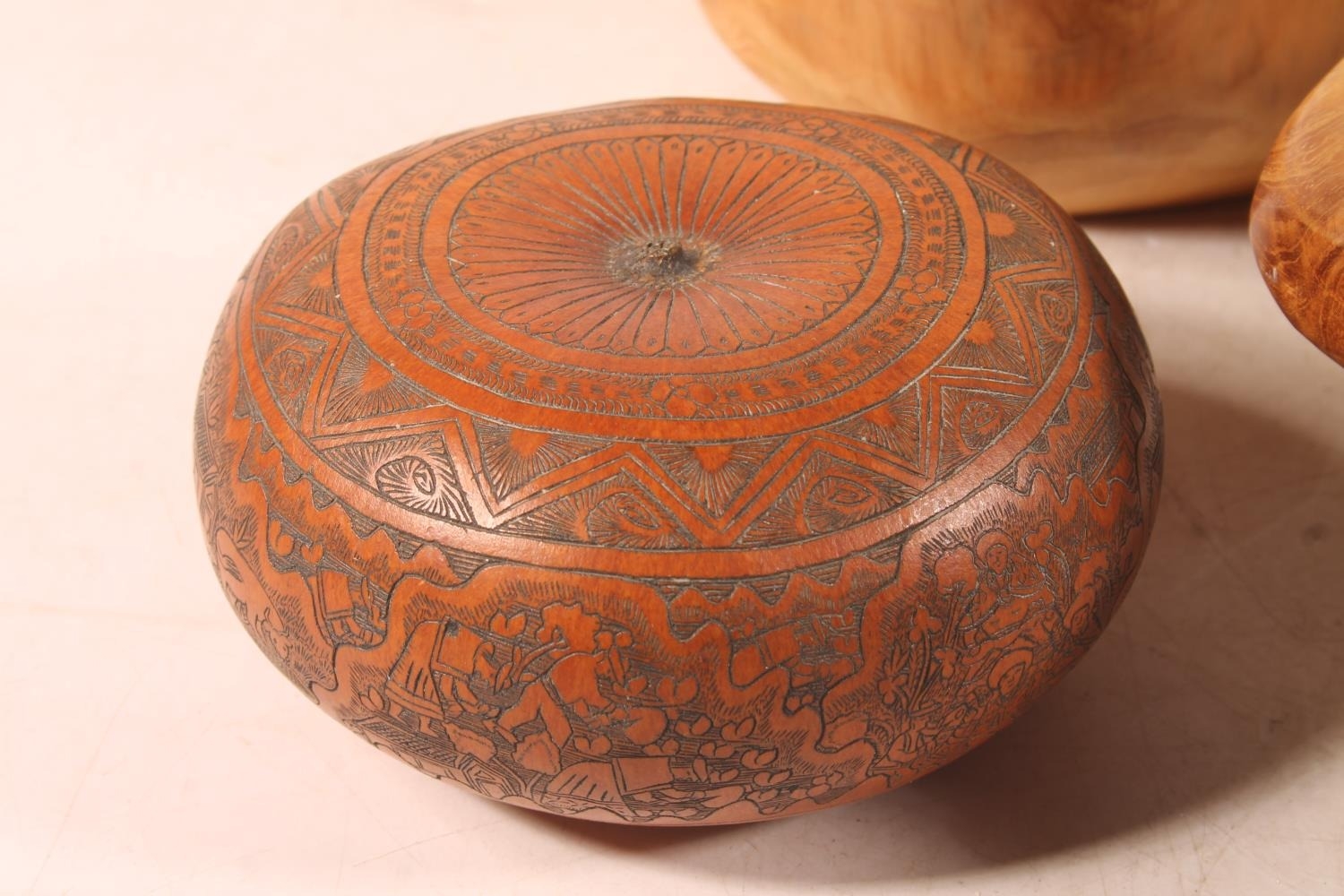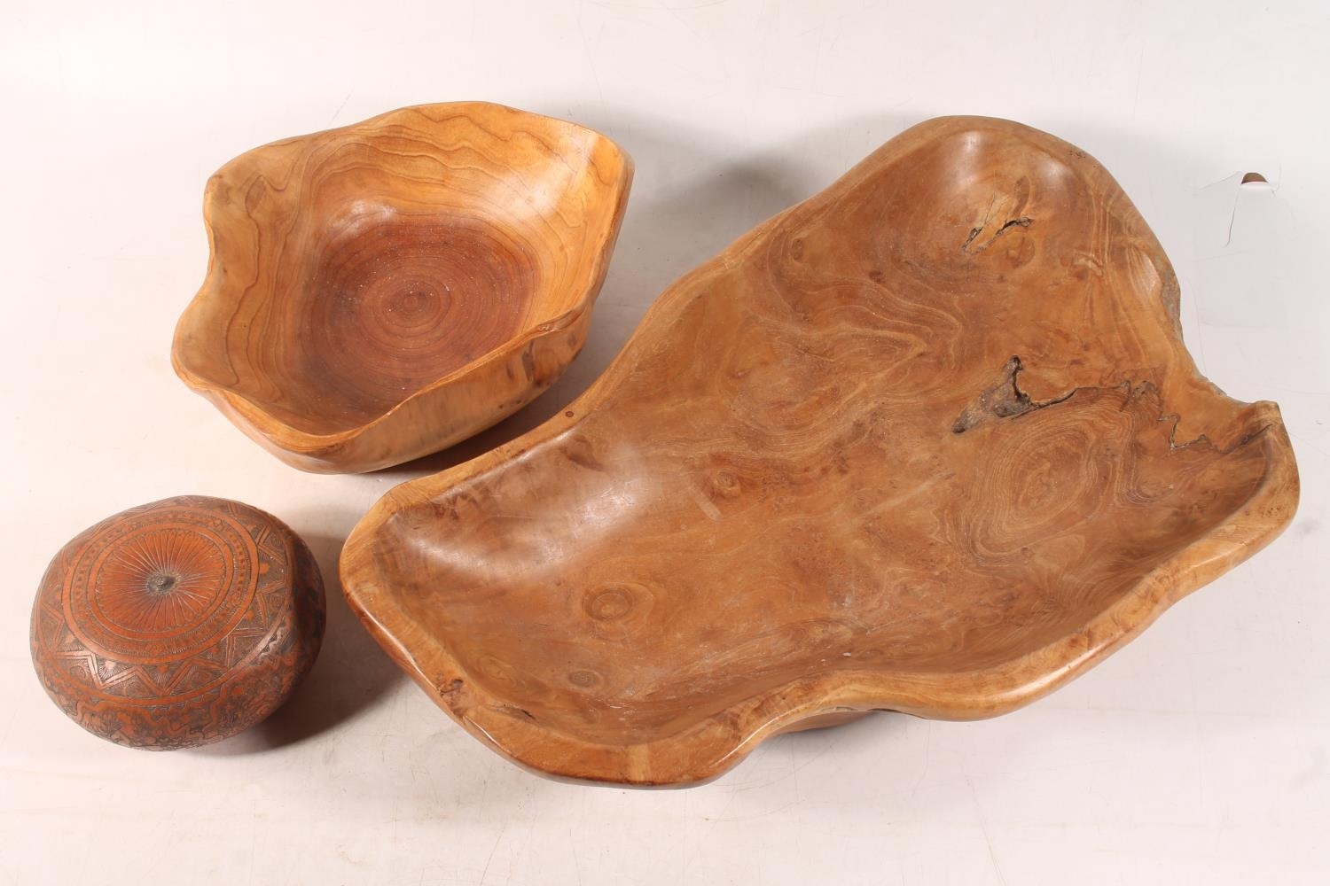 Carved fruitwood bowl, another similar, and an engraved Afri...