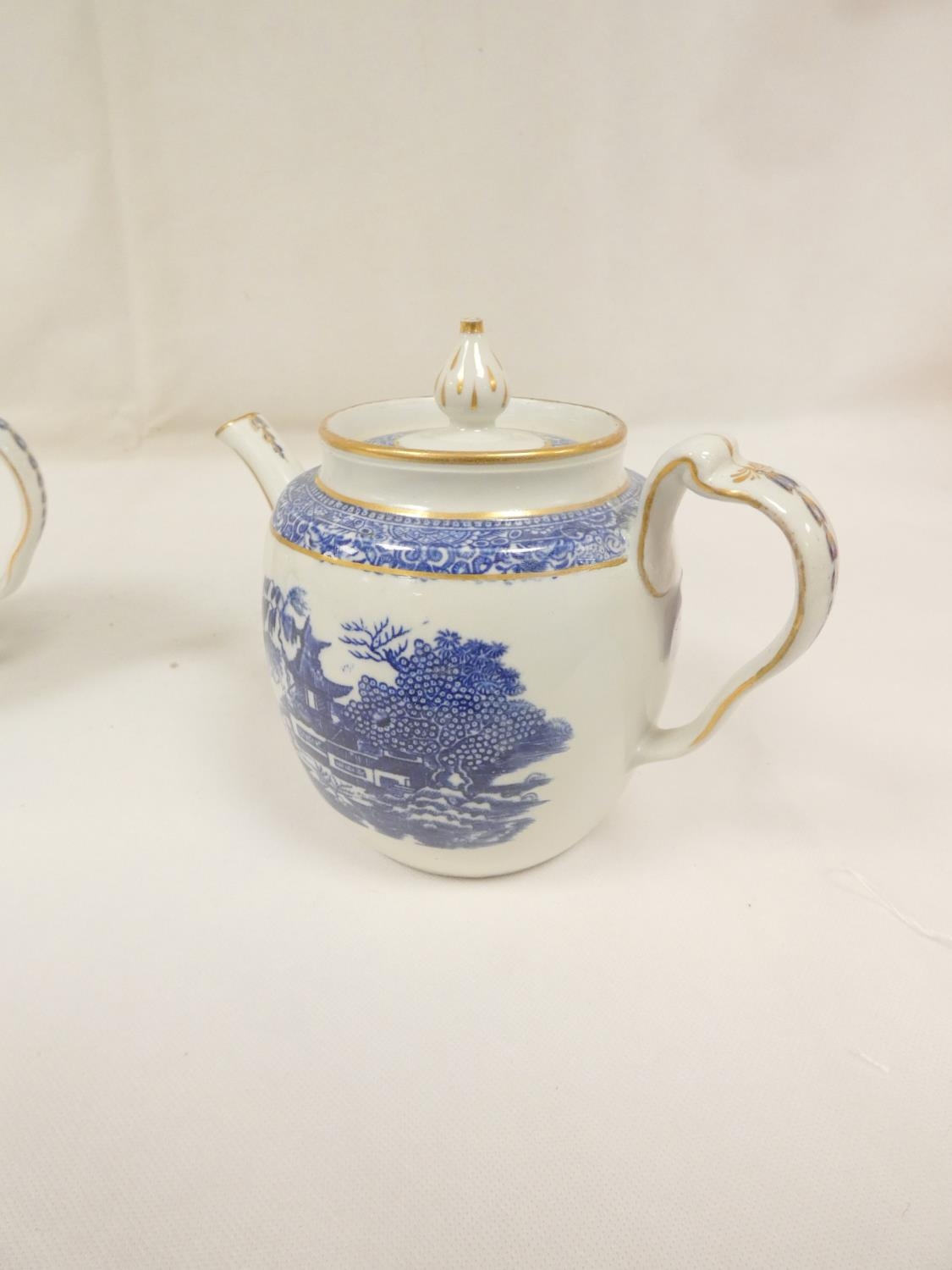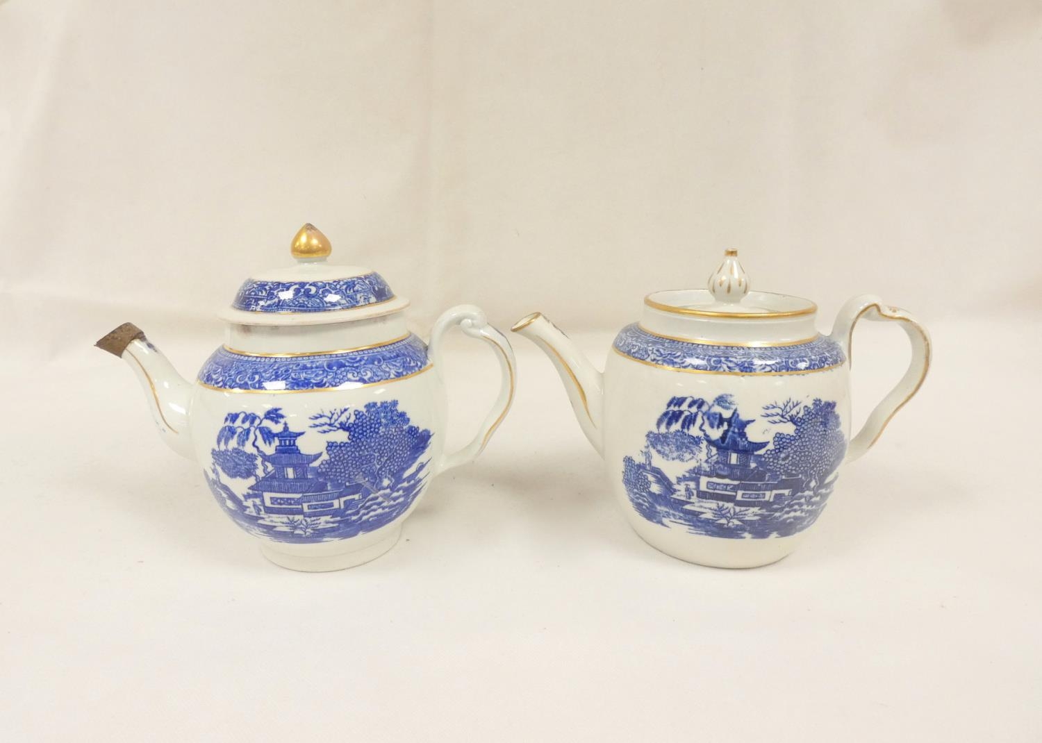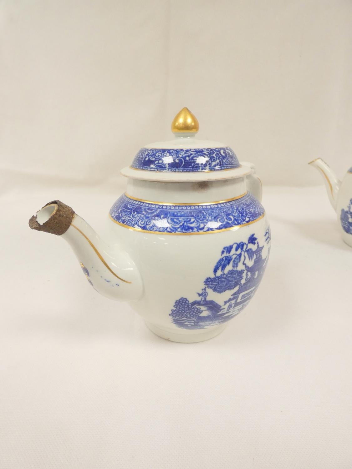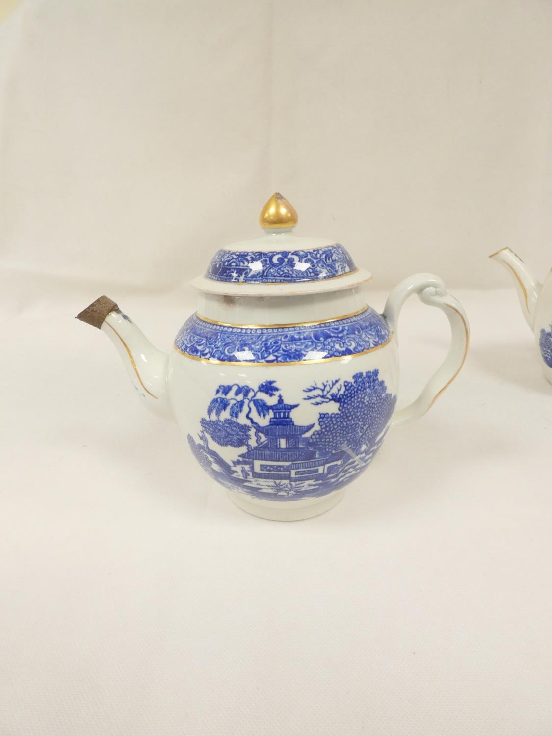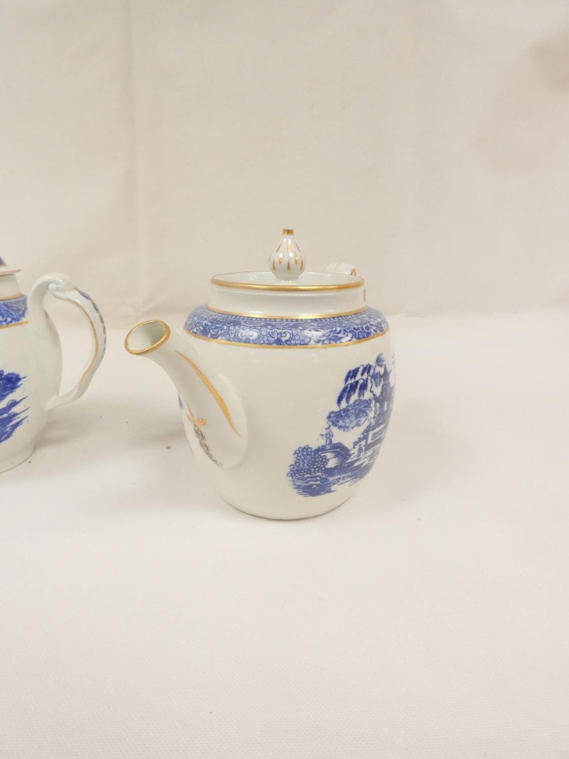 New Hall teapot, blue printed with "Man on Bridge" pattern, of barrel shape with clip handle and curved spout, gilt finial. 17cm high, c.1787/92. Prov. Witherick collection. Also another New Hall teapot, similarly decorated. (2).