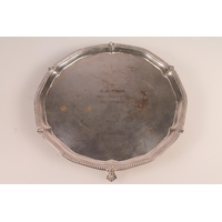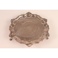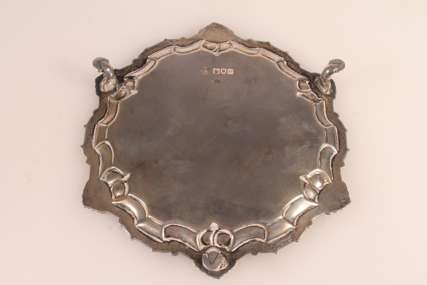 Victorian silver card tray with conch shell and wavy edged border raised on three pad feet, 16cm, William Hutton & Sons Ltd, 1909, London, 166g.
