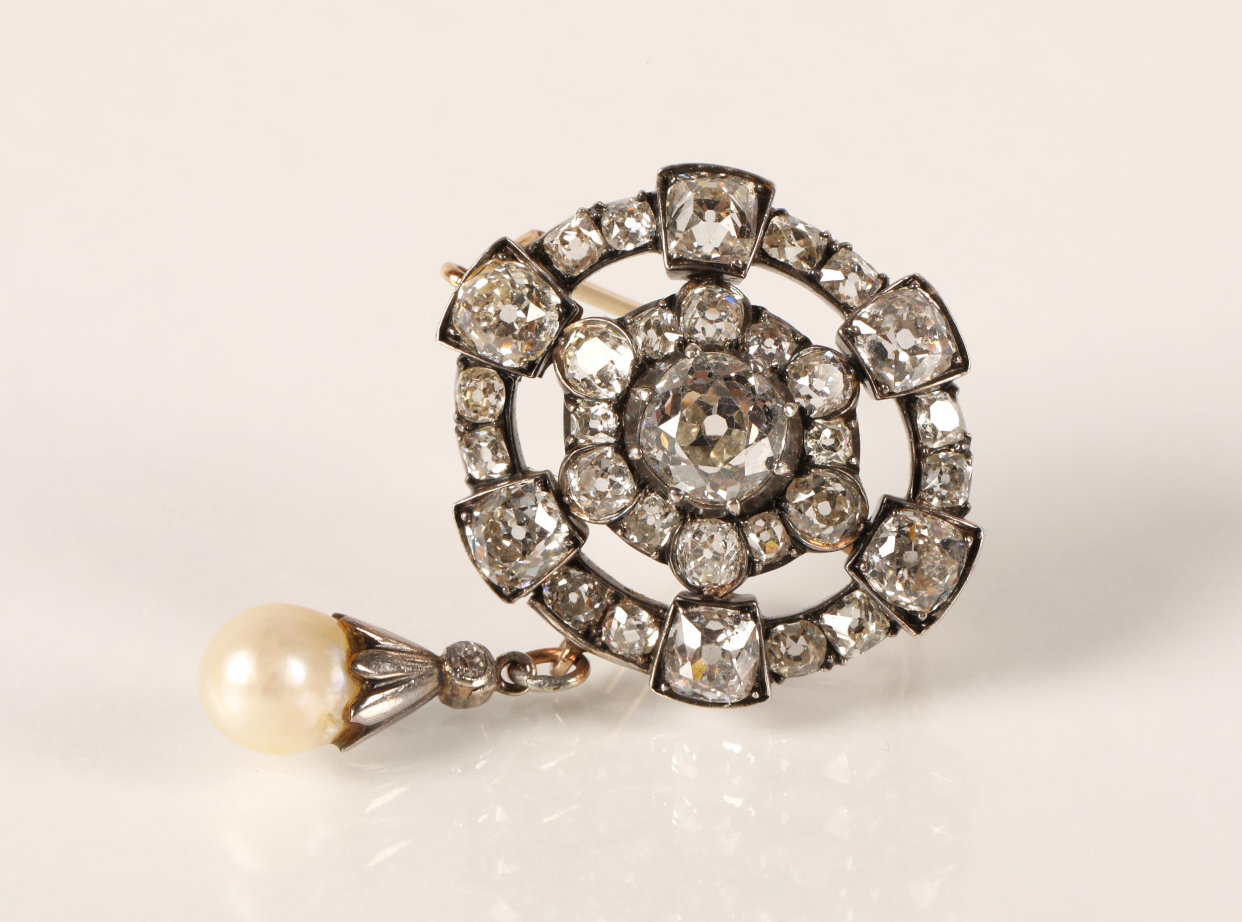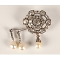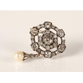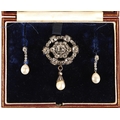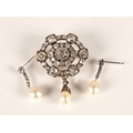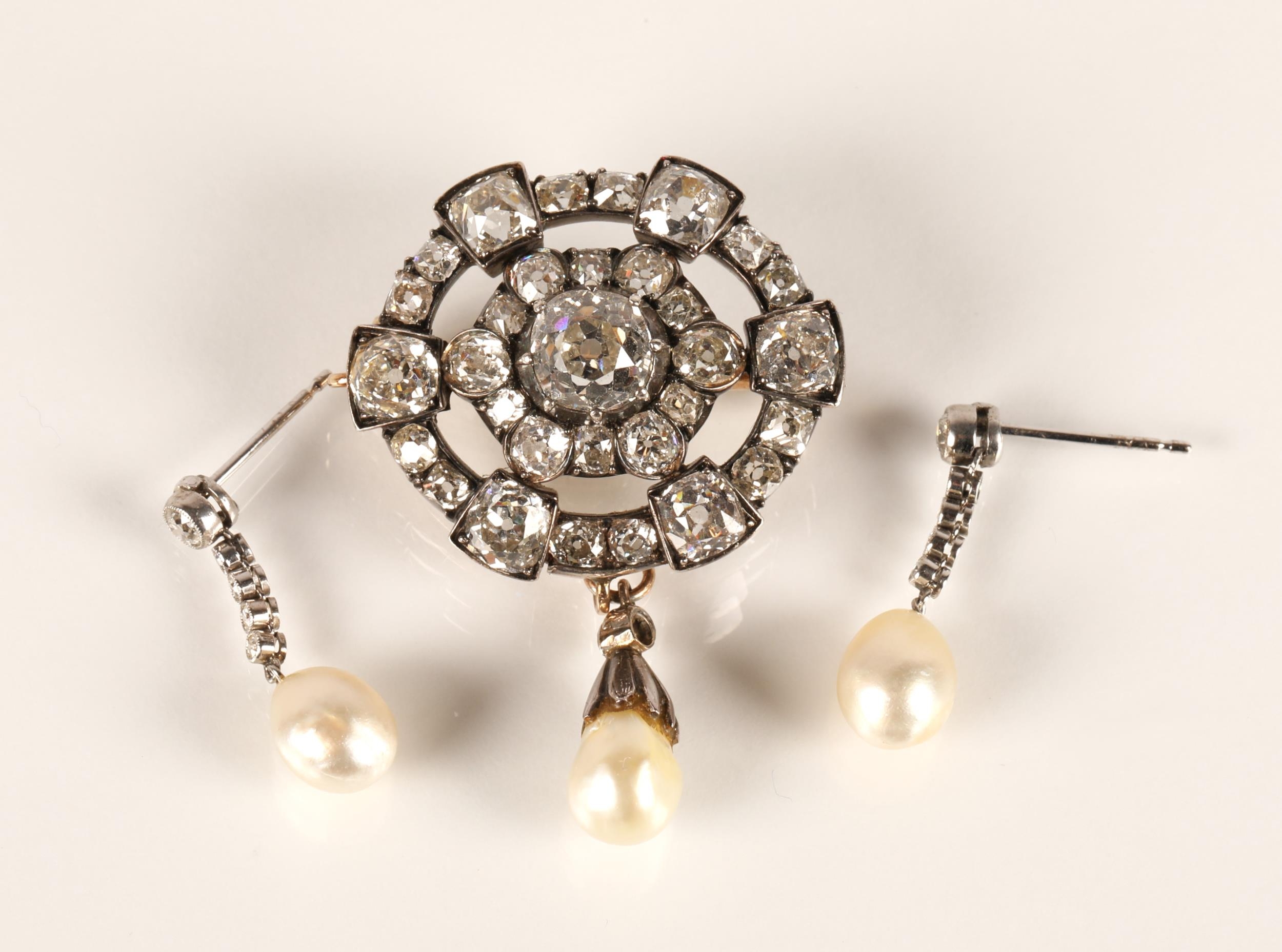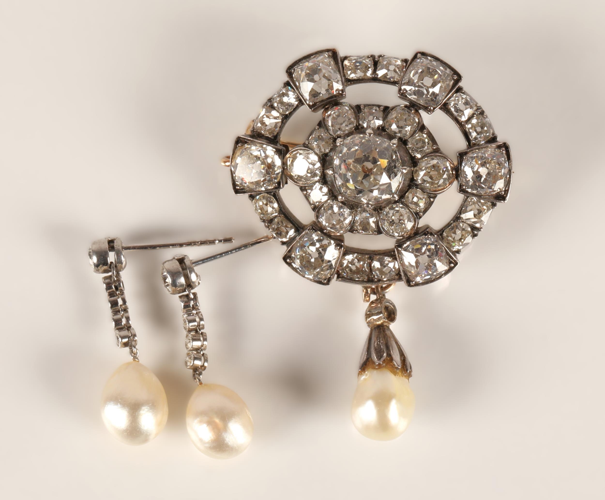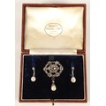 Impressive diamond encrusted brooch, central 1.5 carat stone surrounded by six 0.20 stones interspersed by six smaller stones surrounded by six 0.5 carat stones interspersed by smaller diamonds set on unmarked white metal with pearl drop, 3cm x 2.5cm excluding drop, with a pair of diamond and pearl drop earrings with fitted wine leather case.