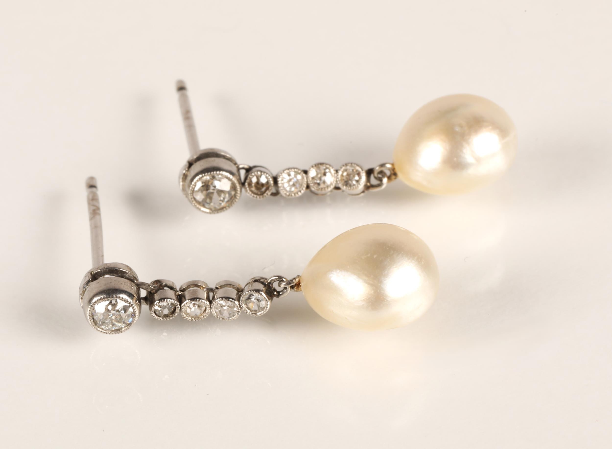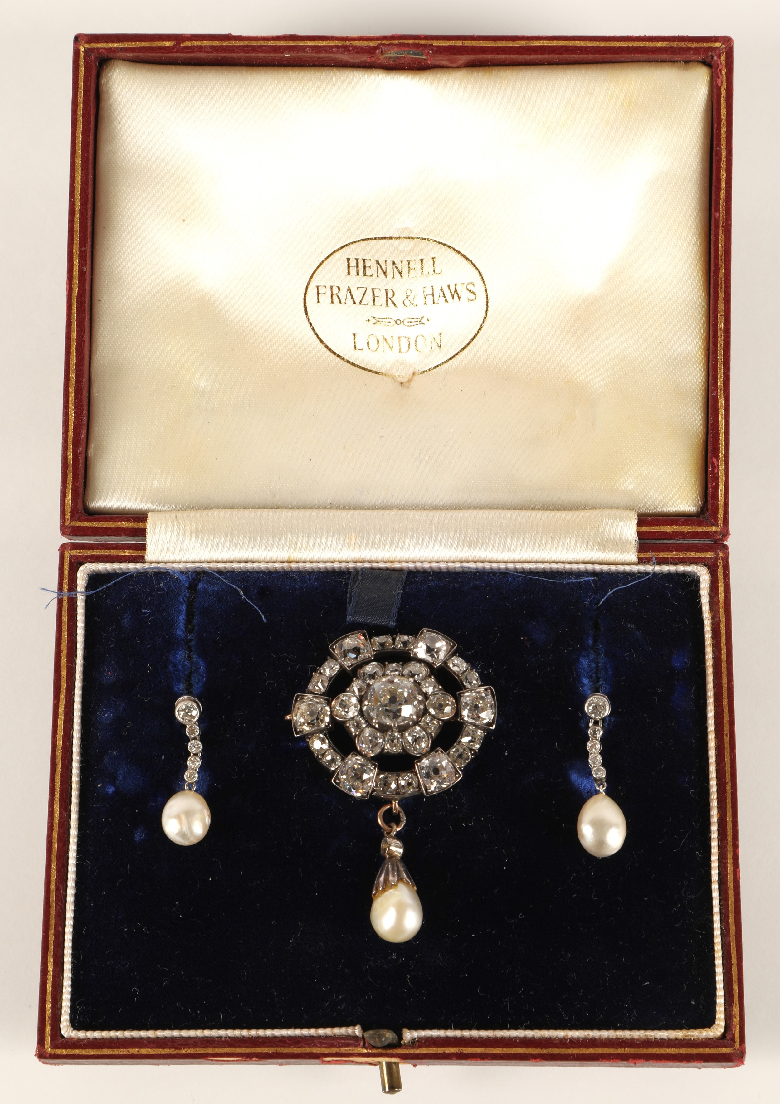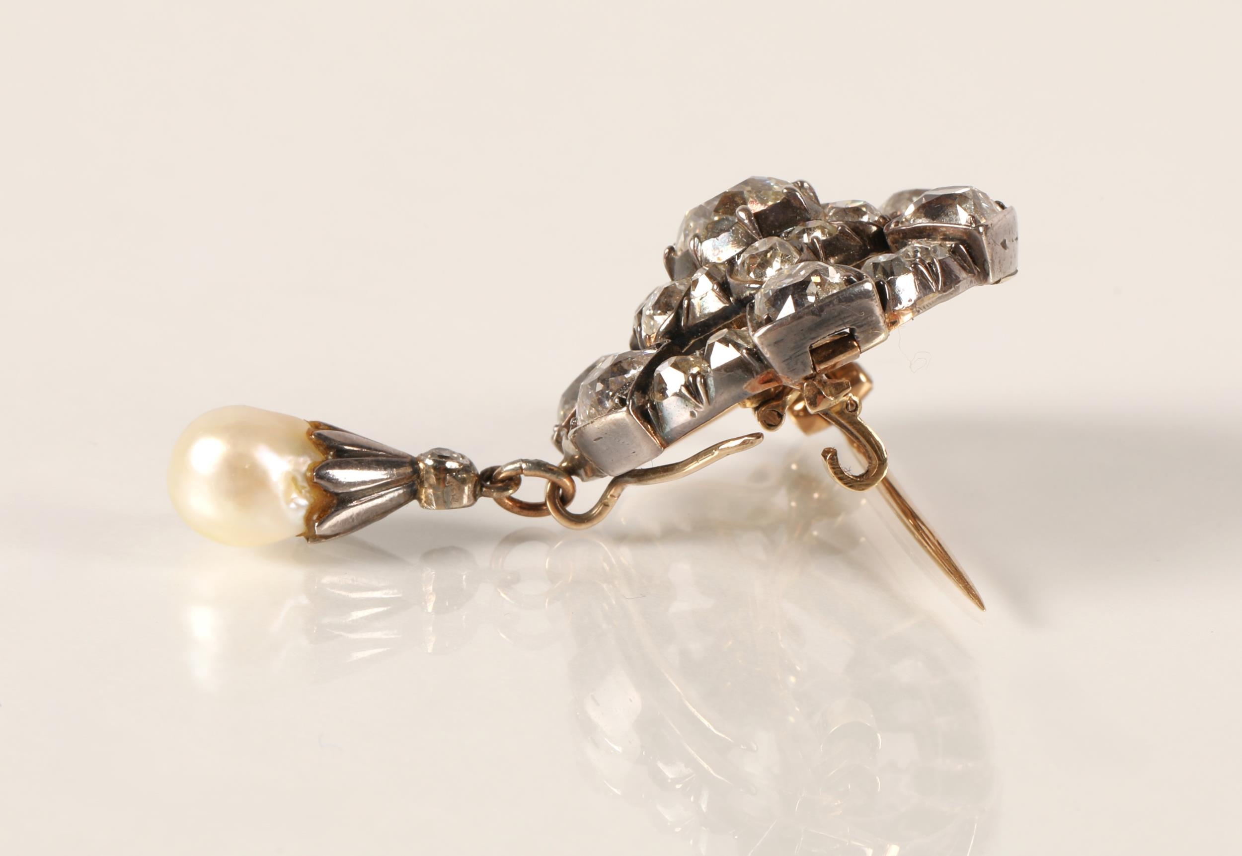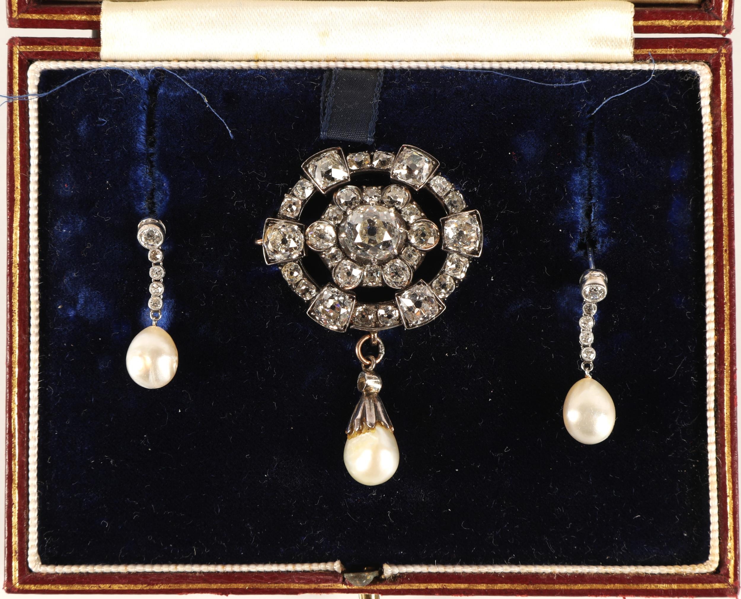 Impressive diamond encrusted brooch, central 1.5 carat stone surrounded by six 0.20 stones interspersed by six smaller stones surrounded by six 0.5 carat stones interspersed by smaller diamonds set on unmarked white metal with pearl drop, 3cm x 2.5cm excluding drop, with a pair of diamond and pearl drop earrings with fitted wine leather case.