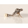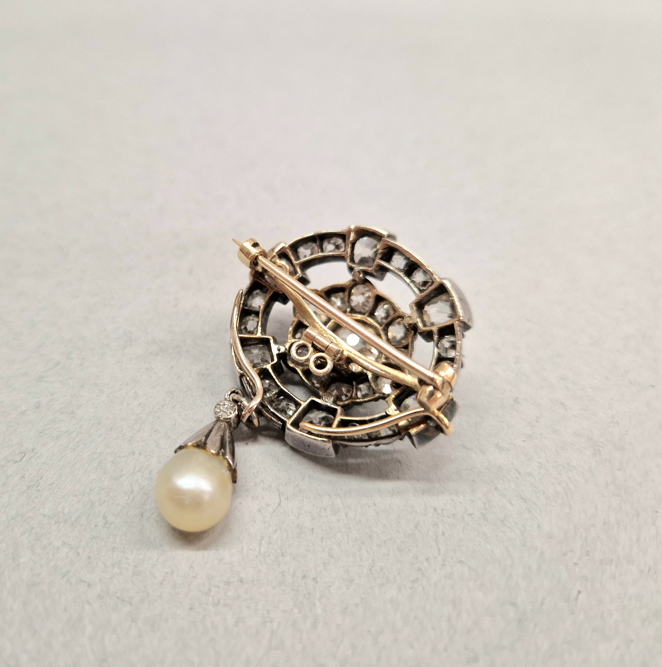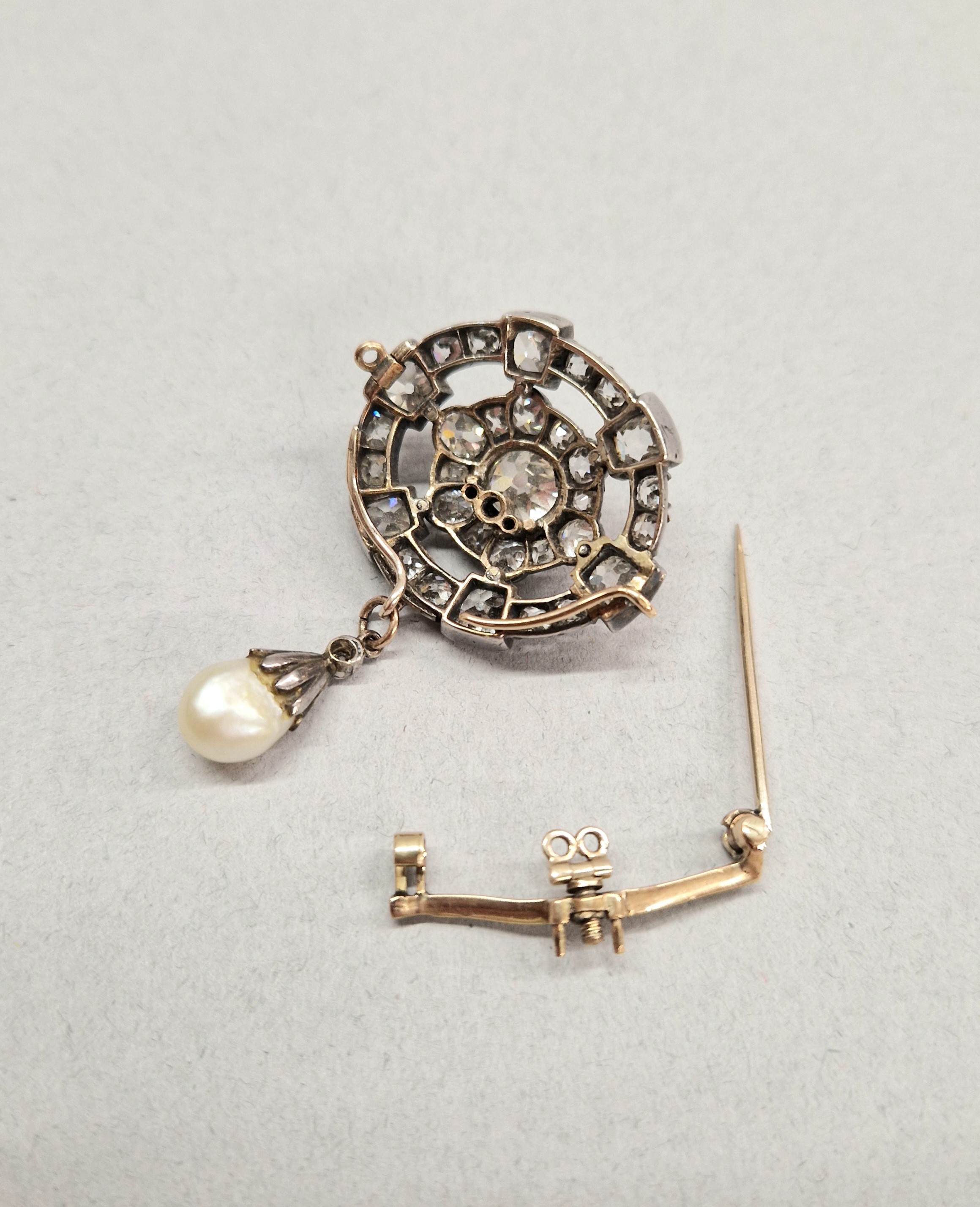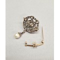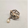 To transform into a pendant the brooch can be rotated 90 degrees, the pearl drop detached and moved to the new bottom and the brooch fitting unscrewed.