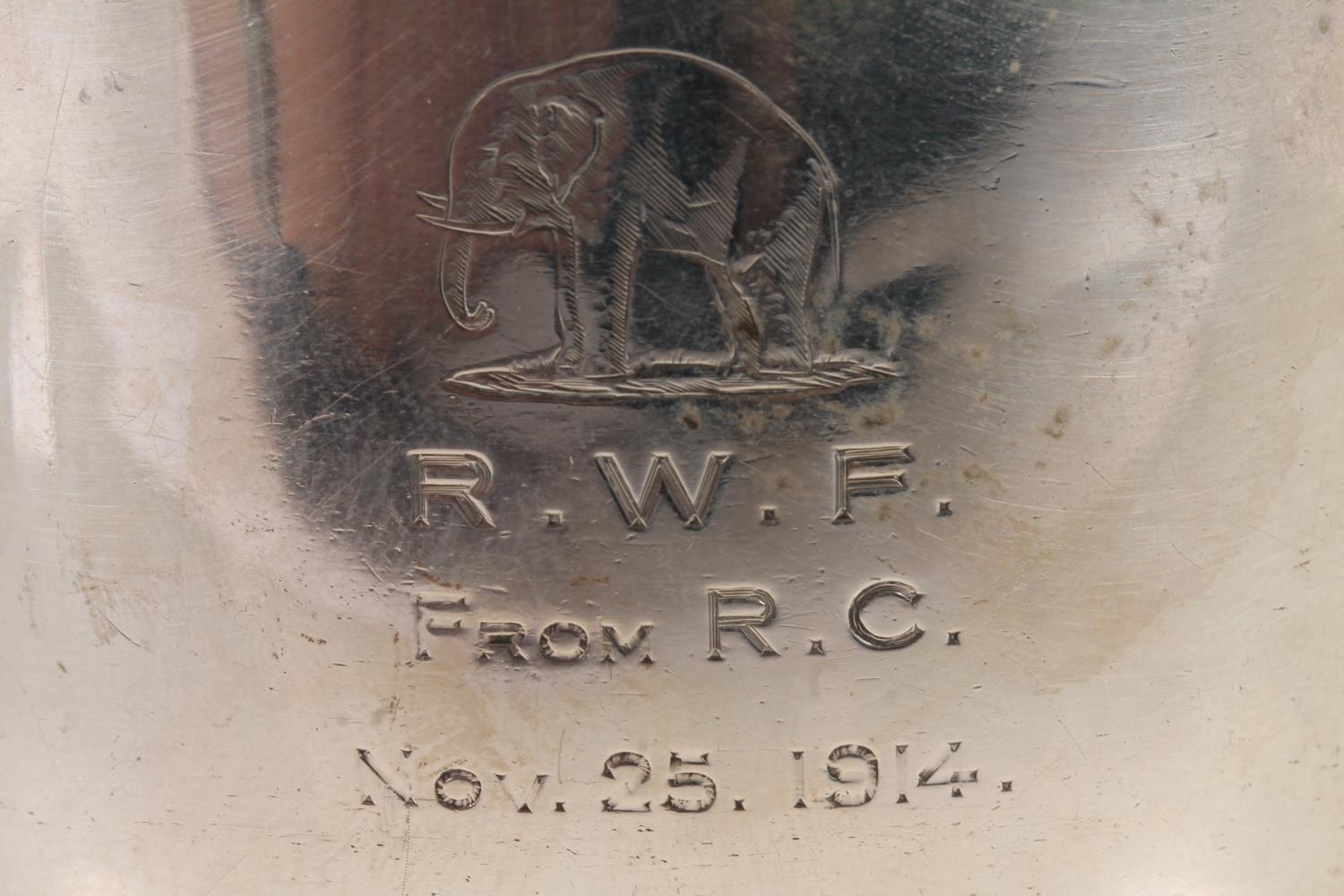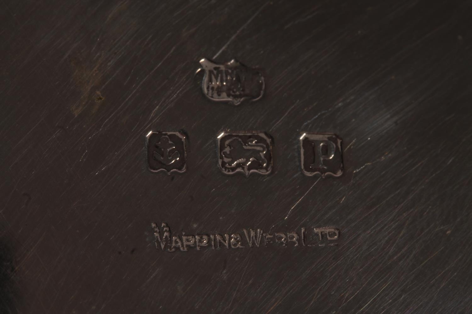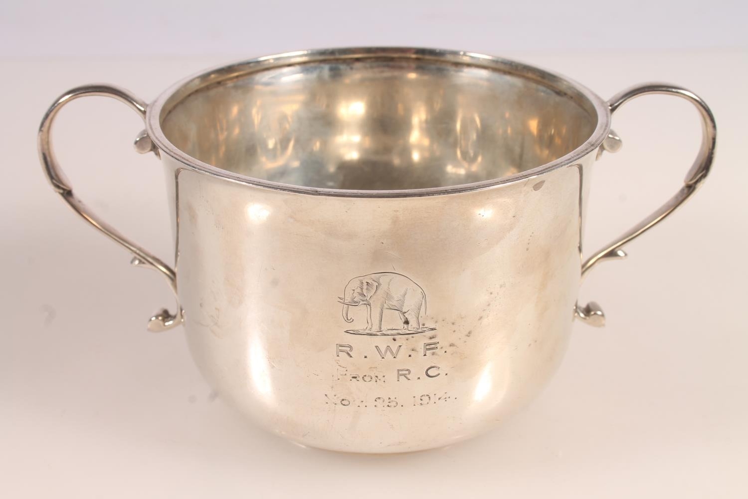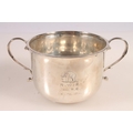 Geo. V silver porringer, the two scrolled handles on a round body, on a circular foot, Mappin and Webb Birmingham 1914, 194g, H7cm.