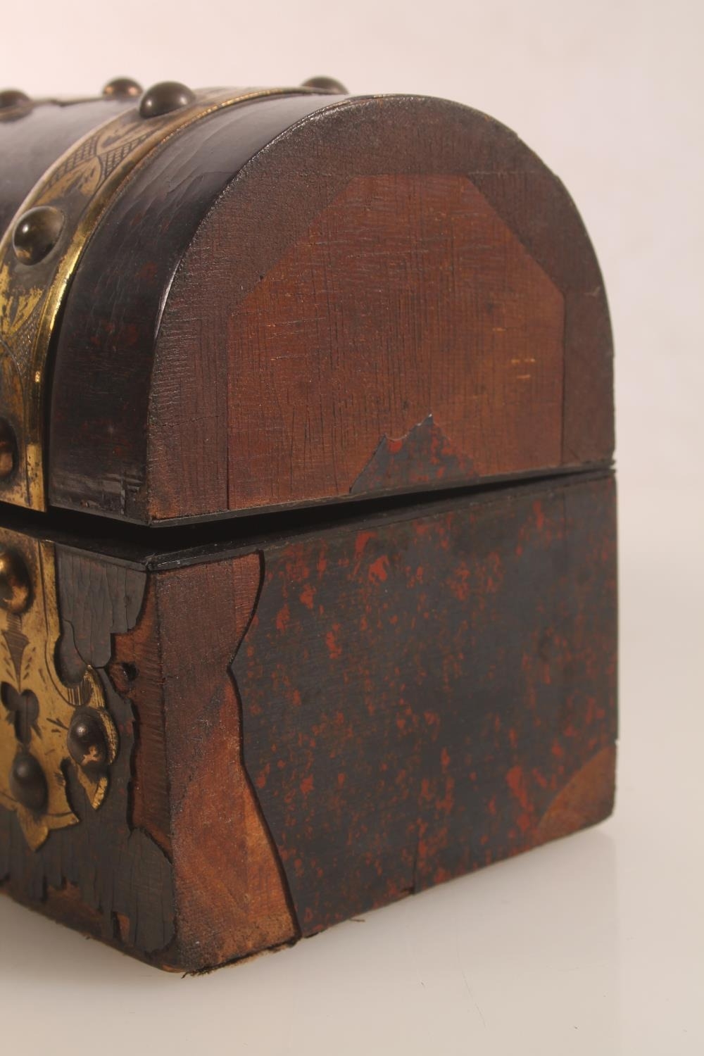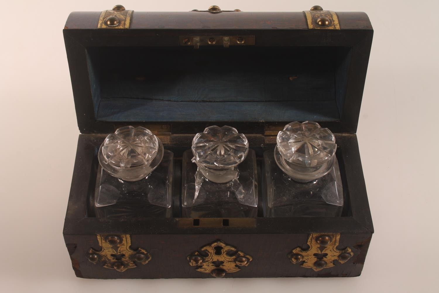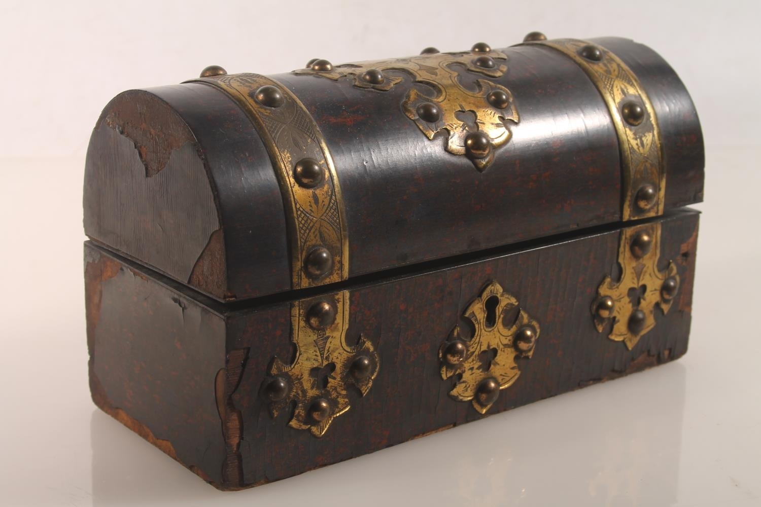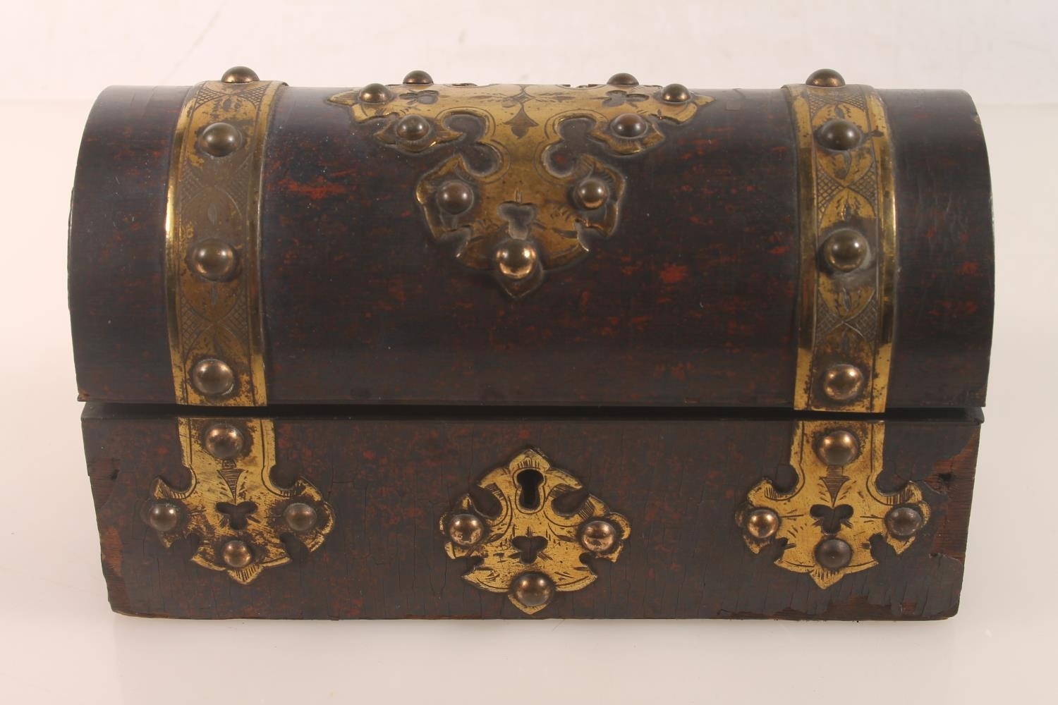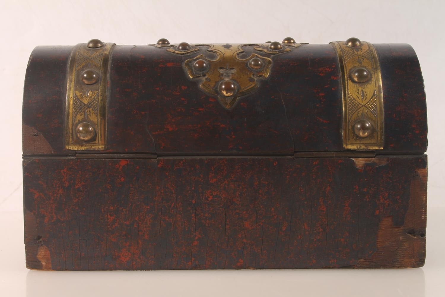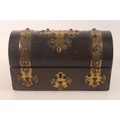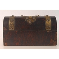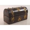 Victorian gothic style dome top inkstand with boule lacquer and brass mounts, hinge top opening to reveal compartmentalised interior and three glass ink jars, 20cm high.
