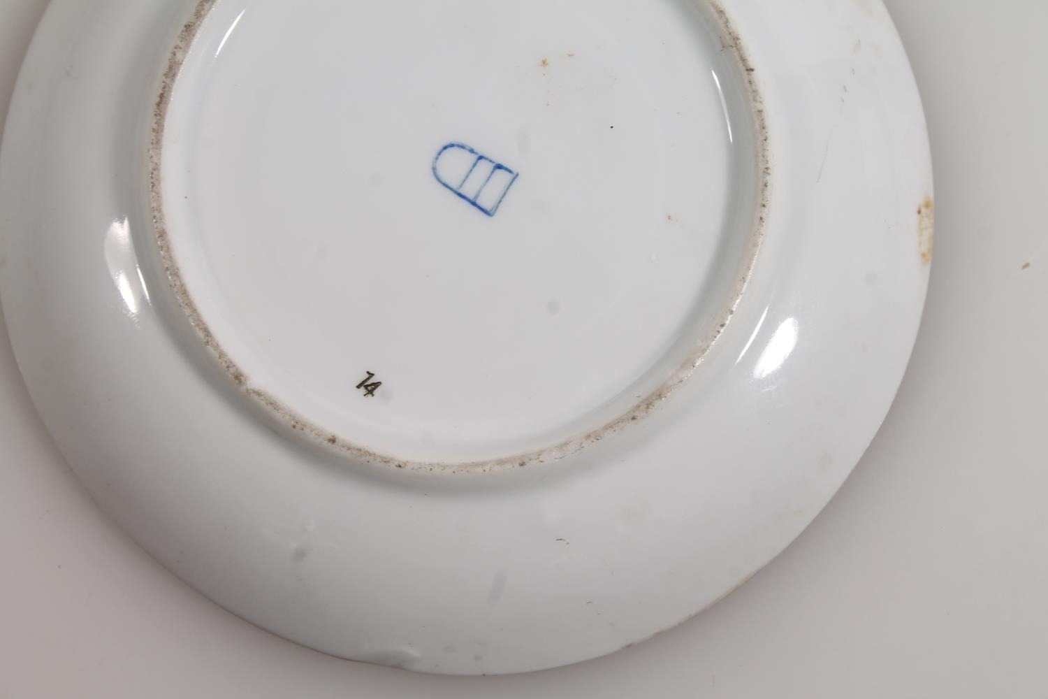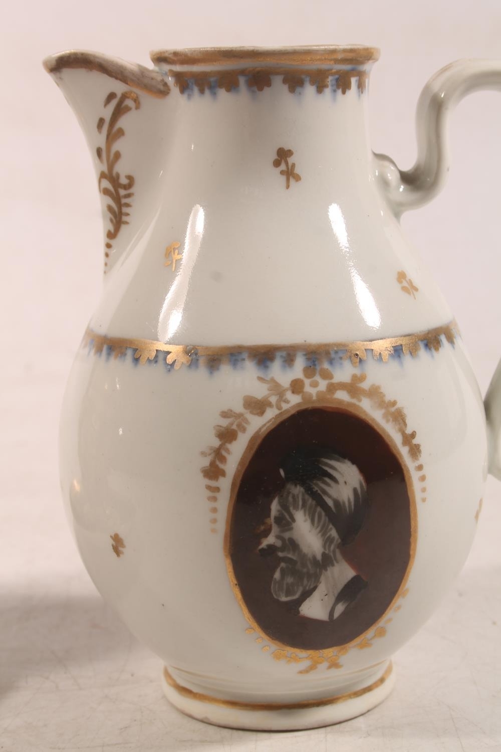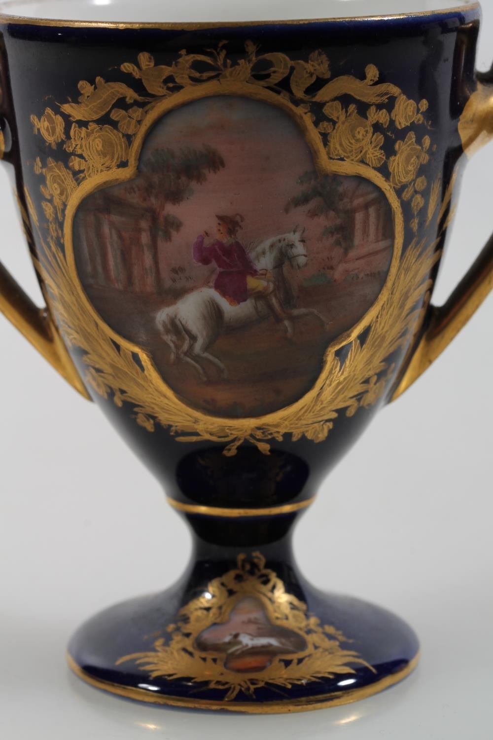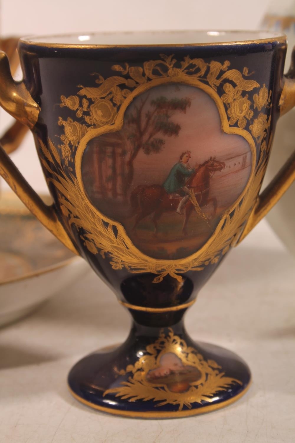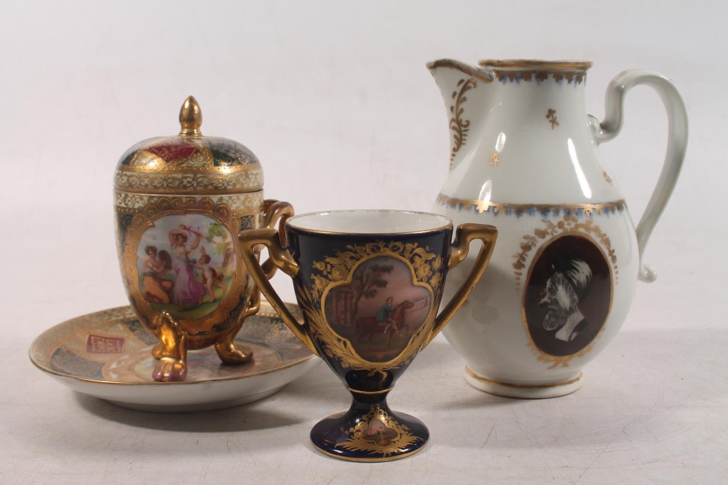 Vienna porcelain jug, a Vienna porcelain trophy with hand-painted vignettes of horses and riders, beehive mark to base, 8.5cm high, and a Royal Vienna chocolate cup and cover on saucer.