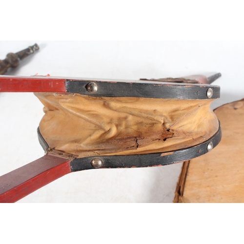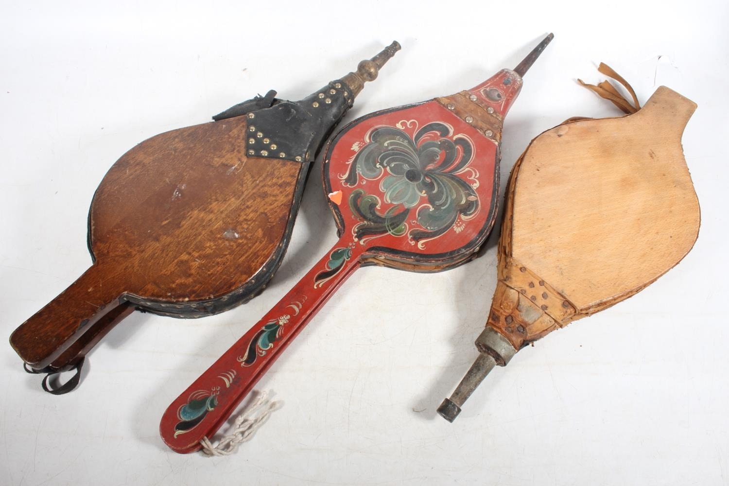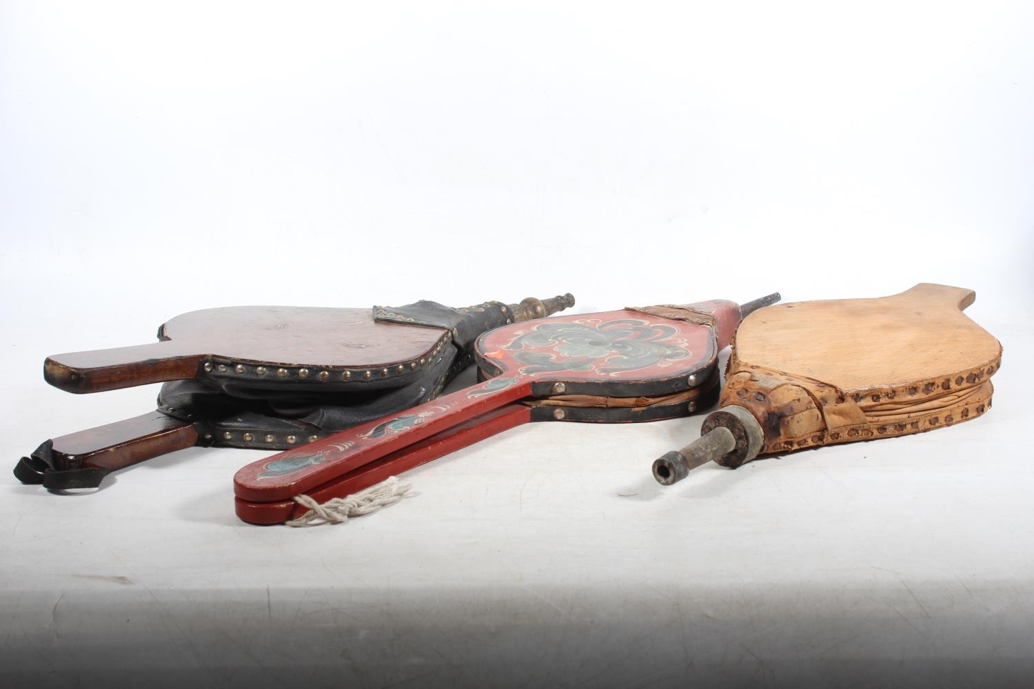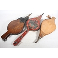 Three pairs of fire bellows, one painted in the bargeware style, the longest 68cm long. (3)