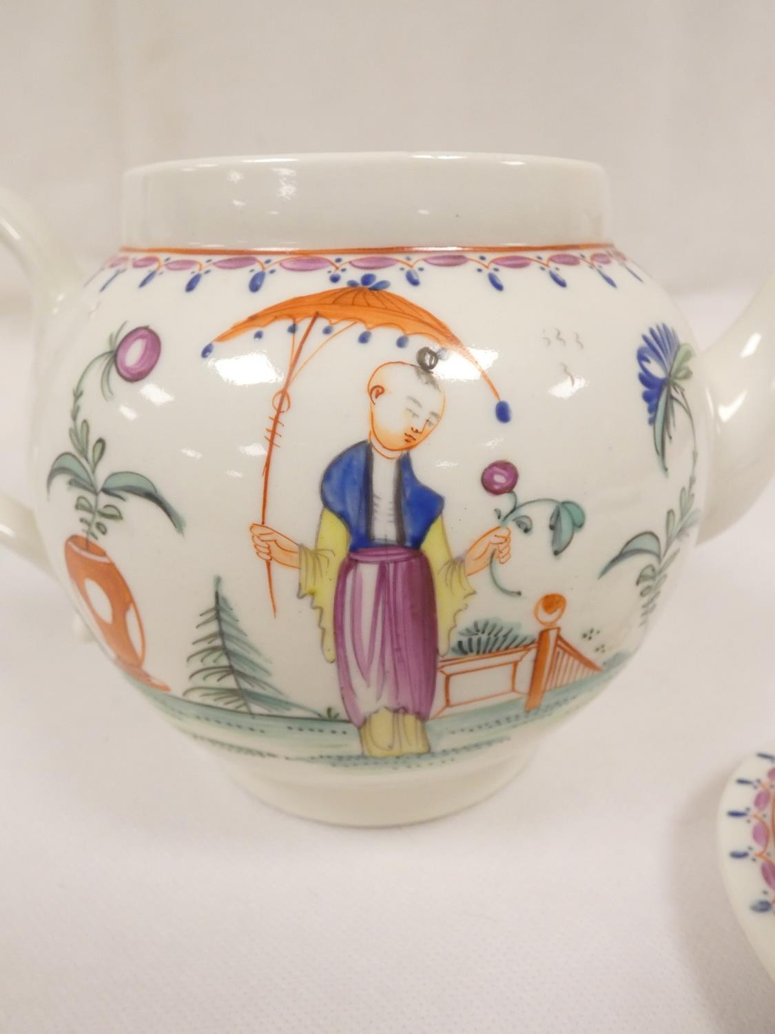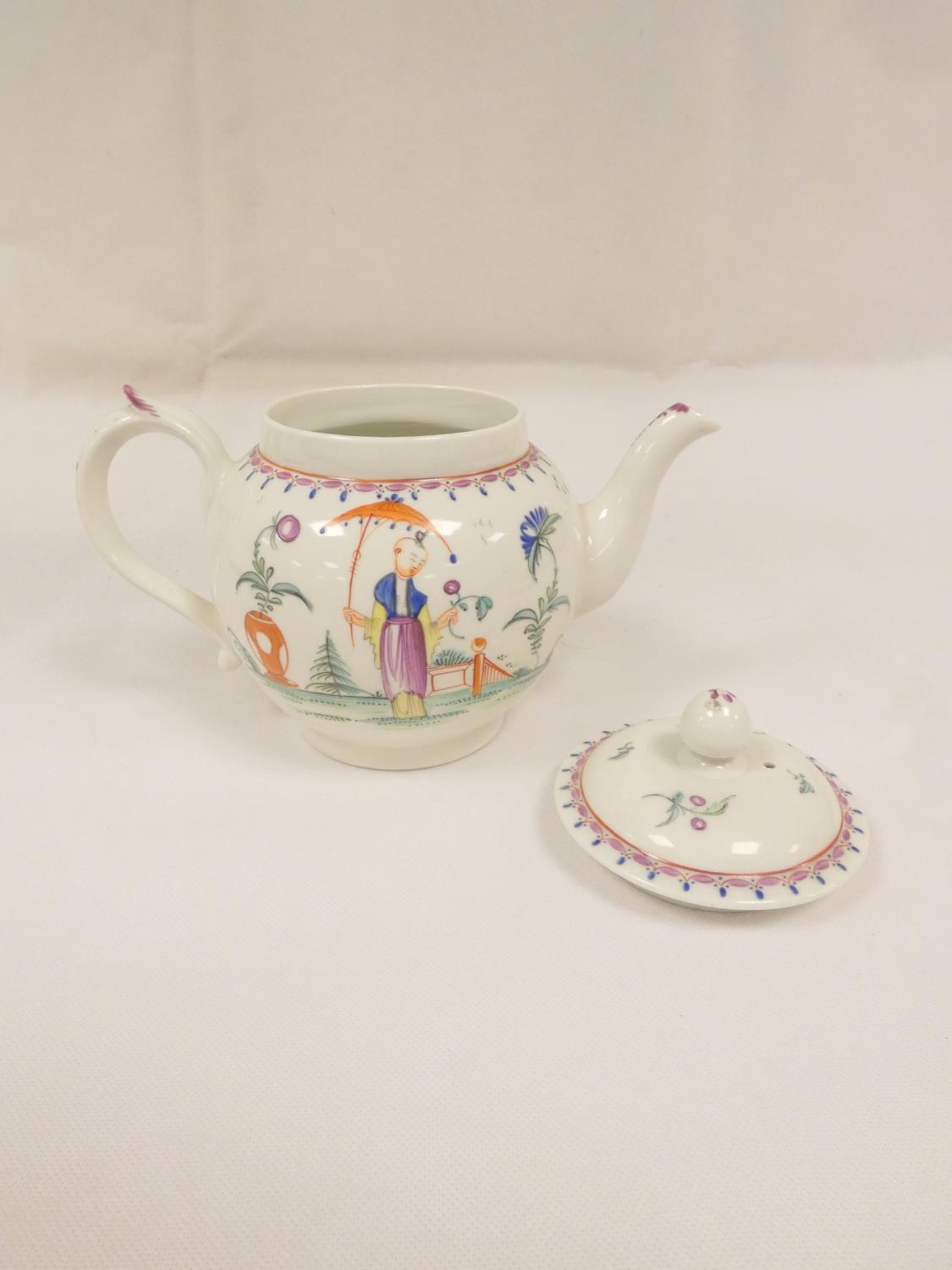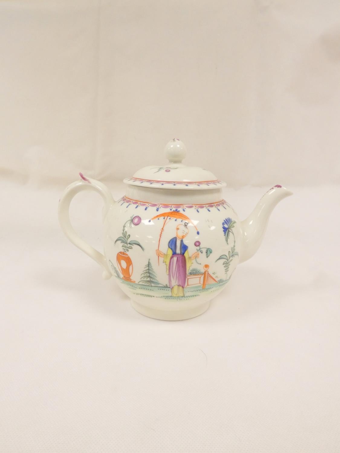 New Hall or perhaps Enoch Wood teapot of spherical form with plain curved spout, version of pattern 20, a single Chinese figure with parasol only, 17cm high, c.1785/90.