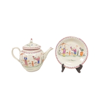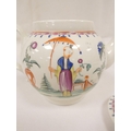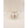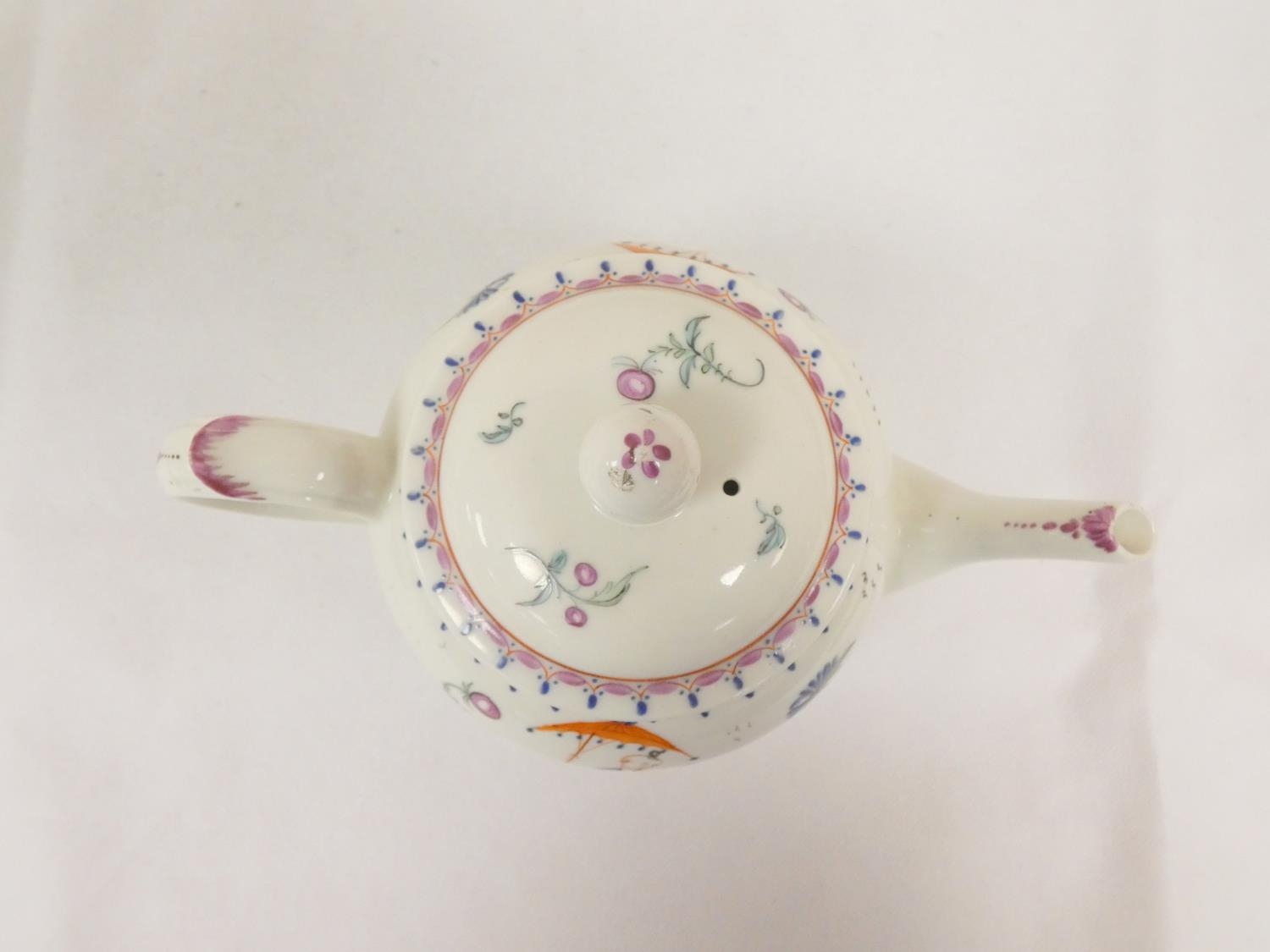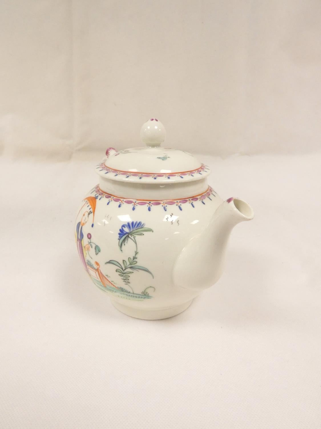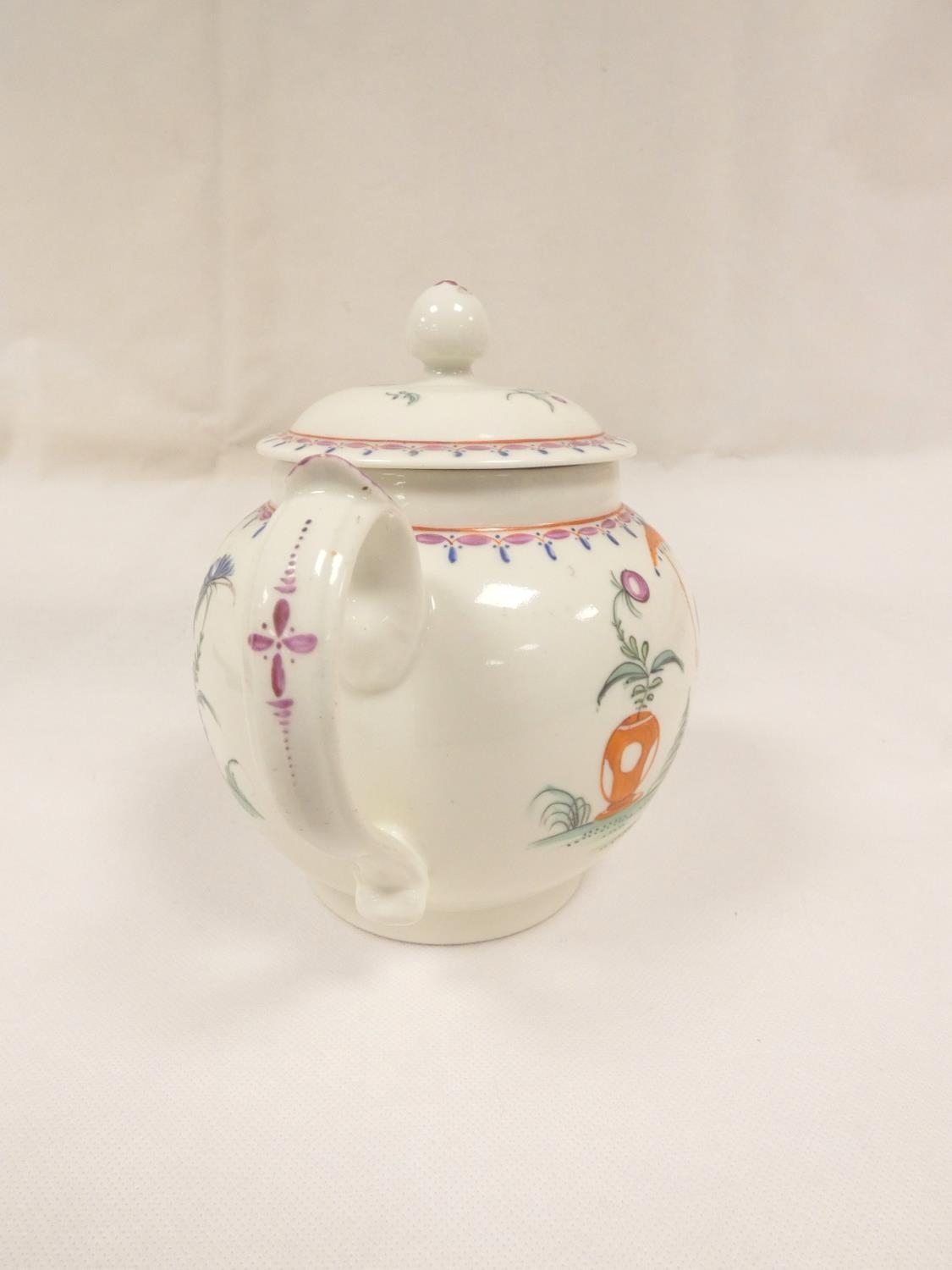 New Hall or perhaps Enoch Wood teapot of spherical form with plain curved spout, version of pattern 20, a single Chinese figure with parasol only, 17cm high, c.1785/90.