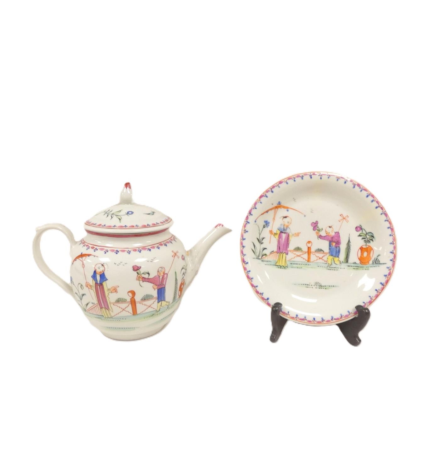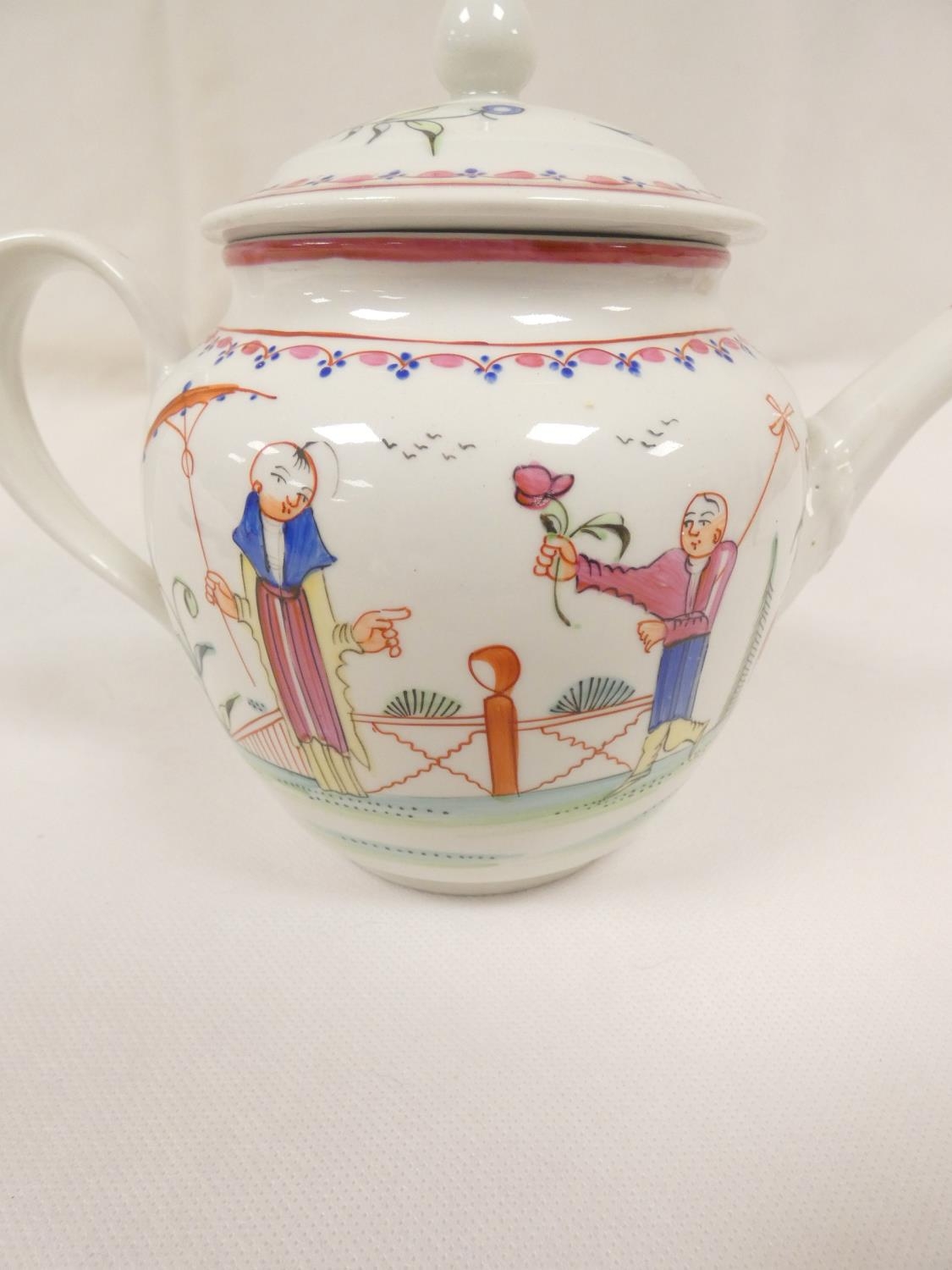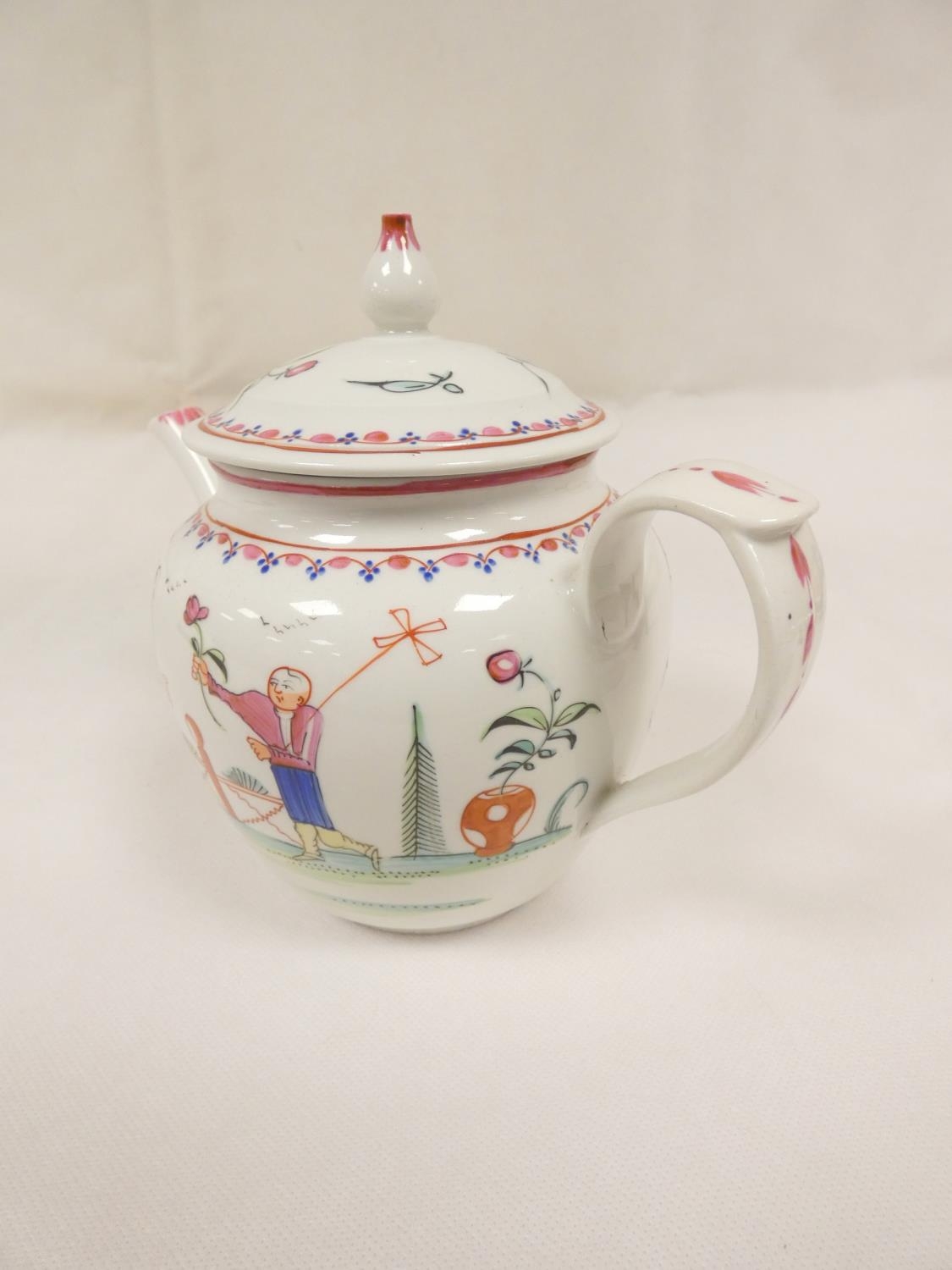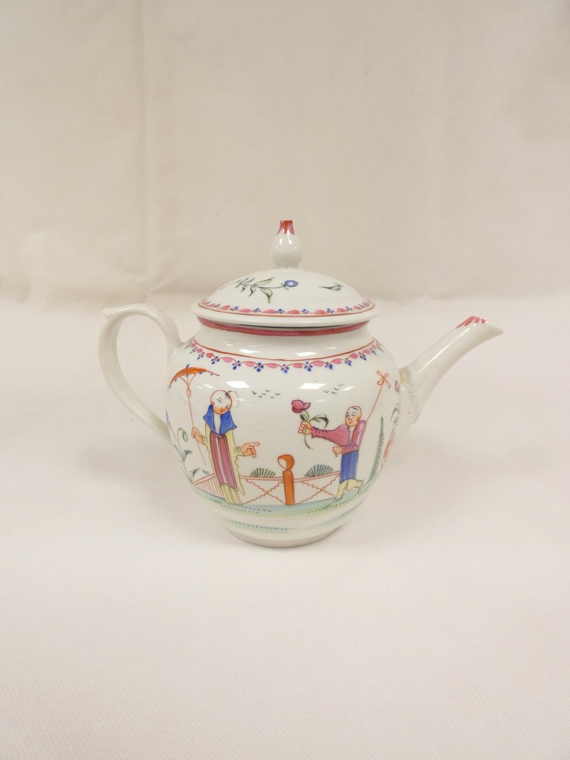 New Hall teapot of spherical form, curved spout with moulding, on circular flanged stand, pattern 20, Chinese figures with windmill and parasol, 19cm high including stand, c.1785/90. See Godden, New Hall Porcelains, plate 148. Prov. Roderick Jellicoe.