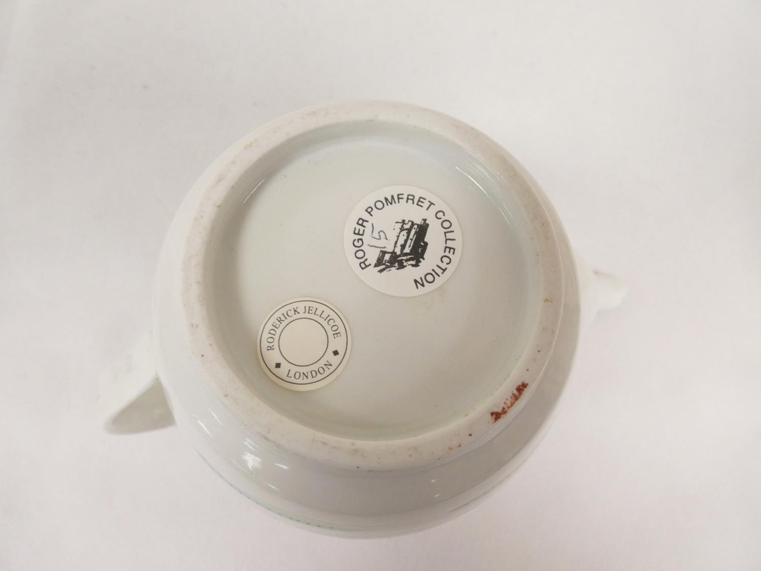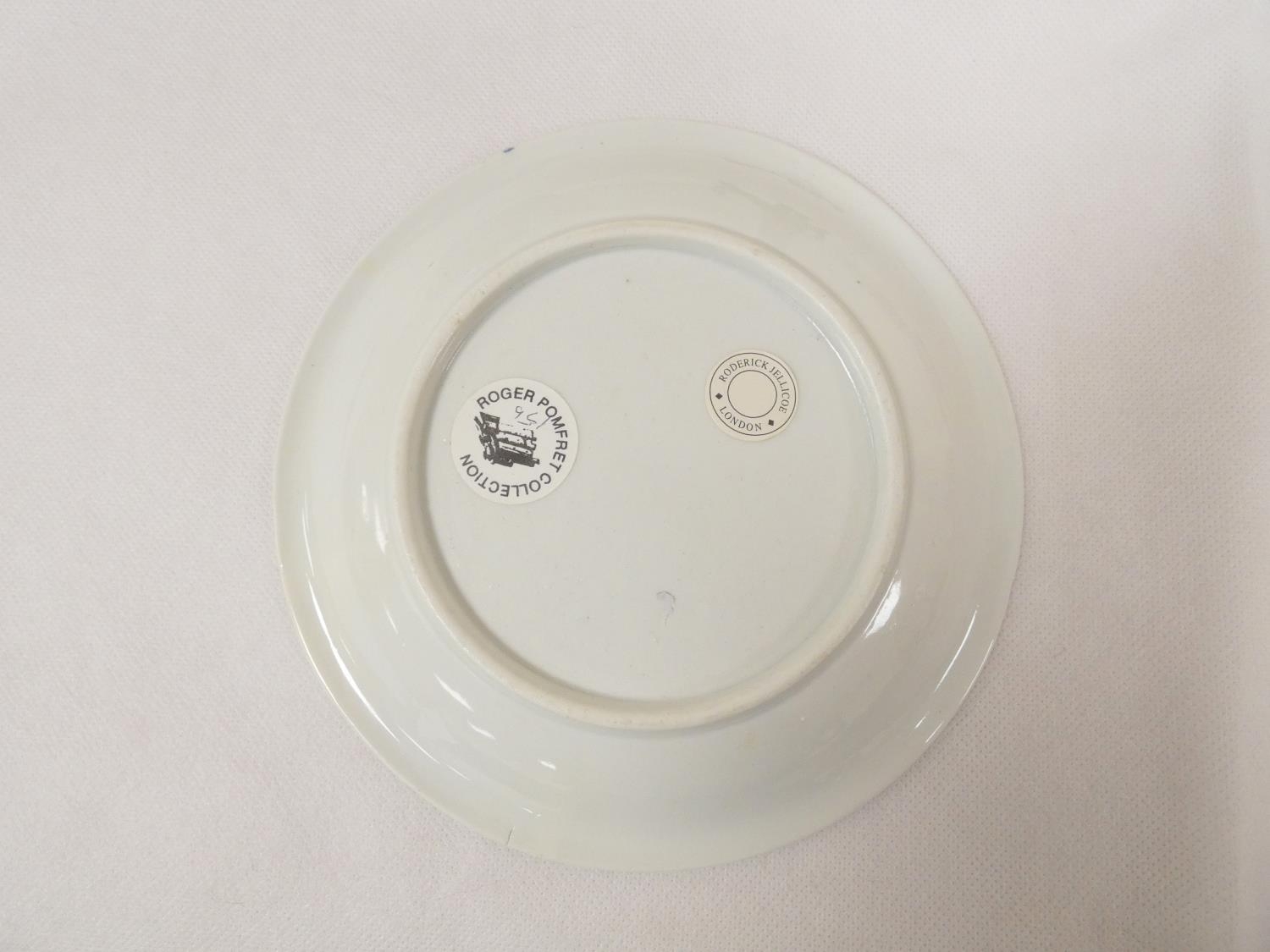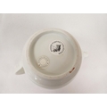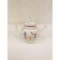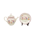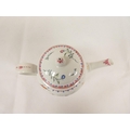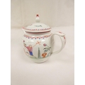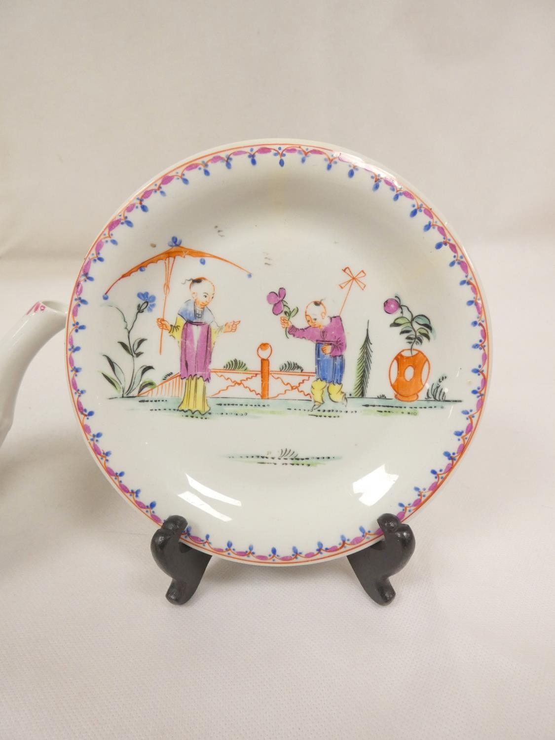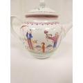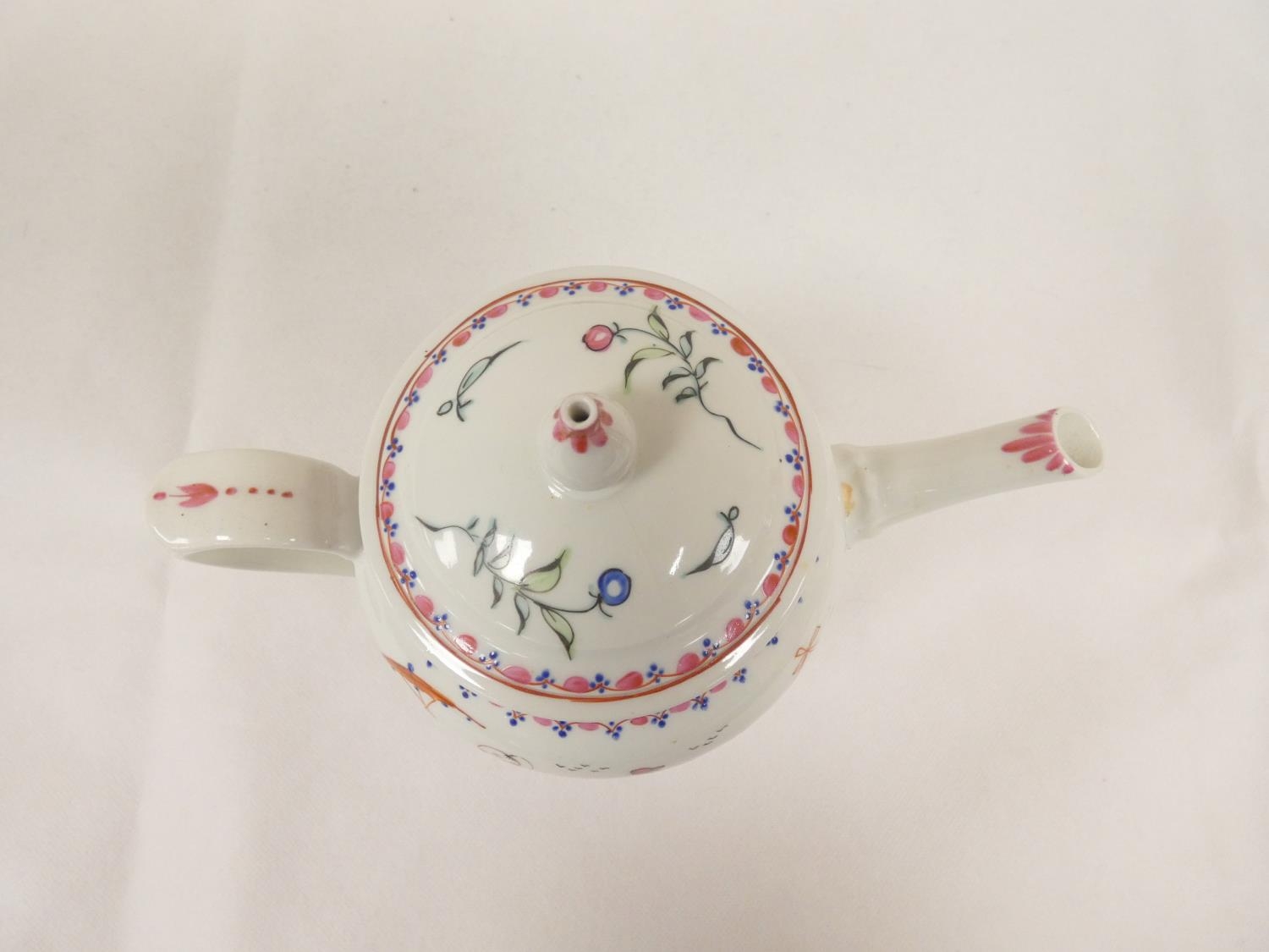 New Hall teapot of spherical form, curved spout with moulding, on circular flanged stand, pattern 20, Chinese figures with windmill and parasol, 19cm high including stand, c.1785/90. See Godden, New Hall Porcelains, plate 148. Prov. Roderick Jellicoe.