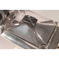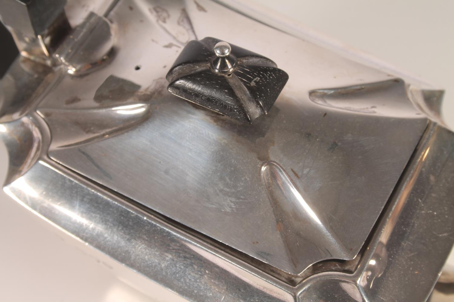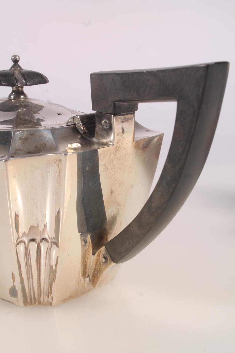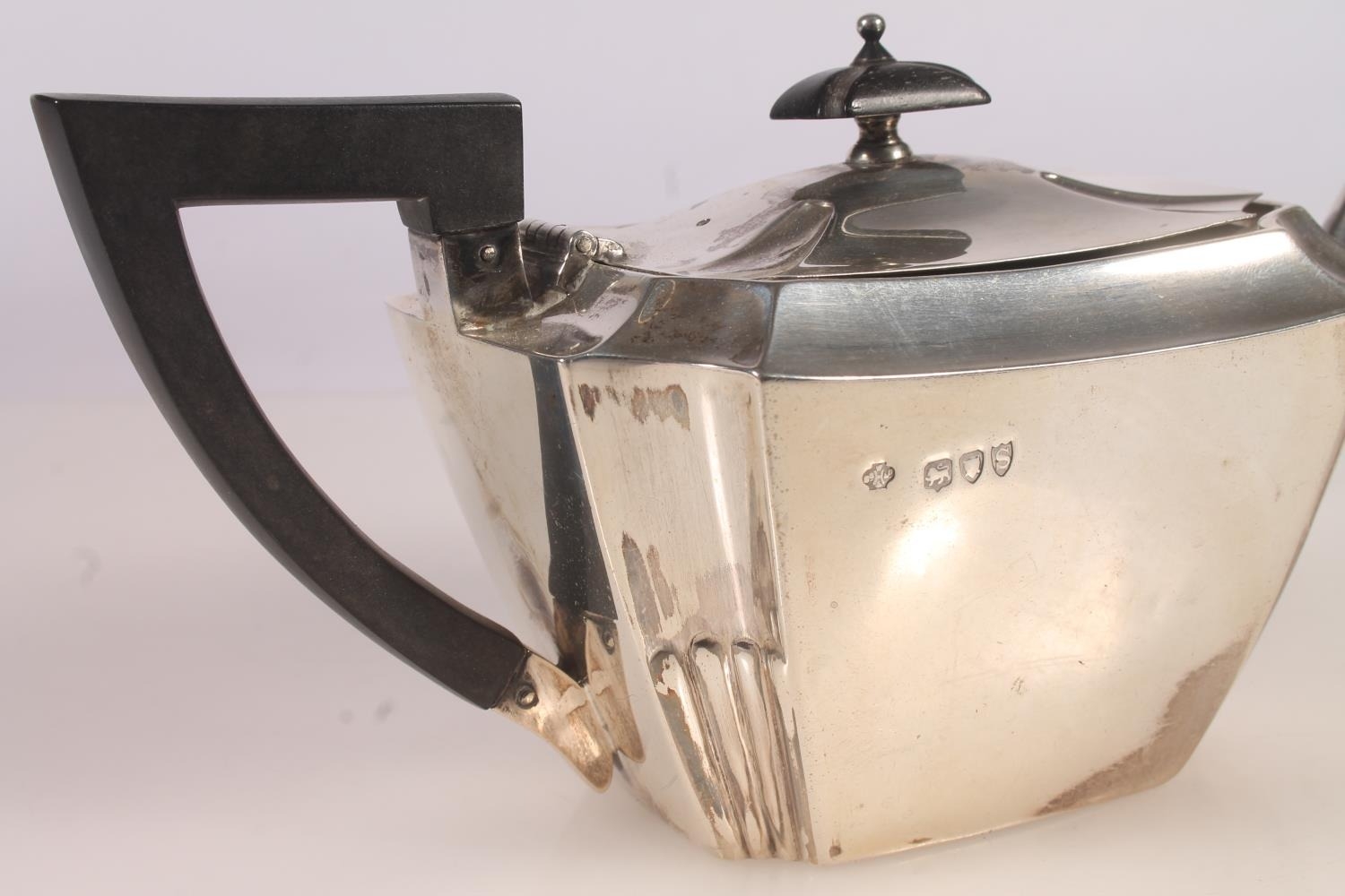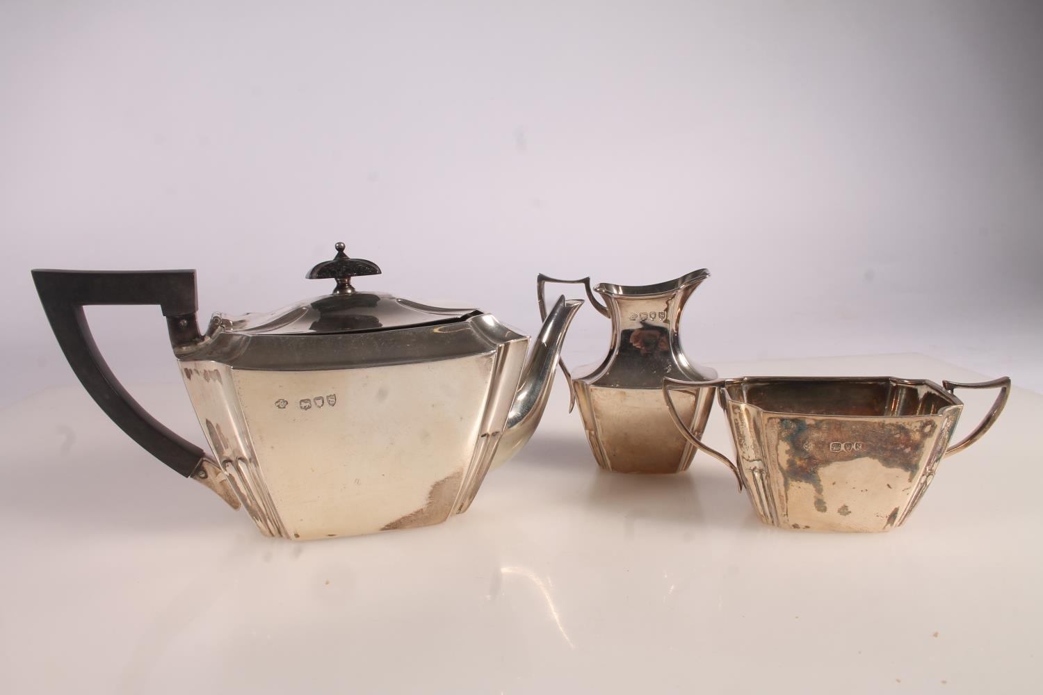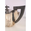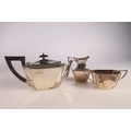 Victorian silver three piece bachelors tea set, the teapot with ebonised angular handle and shaped tapering body, with conforming cream and sugar, William Hutton and Sons London 1893, gross 388g.