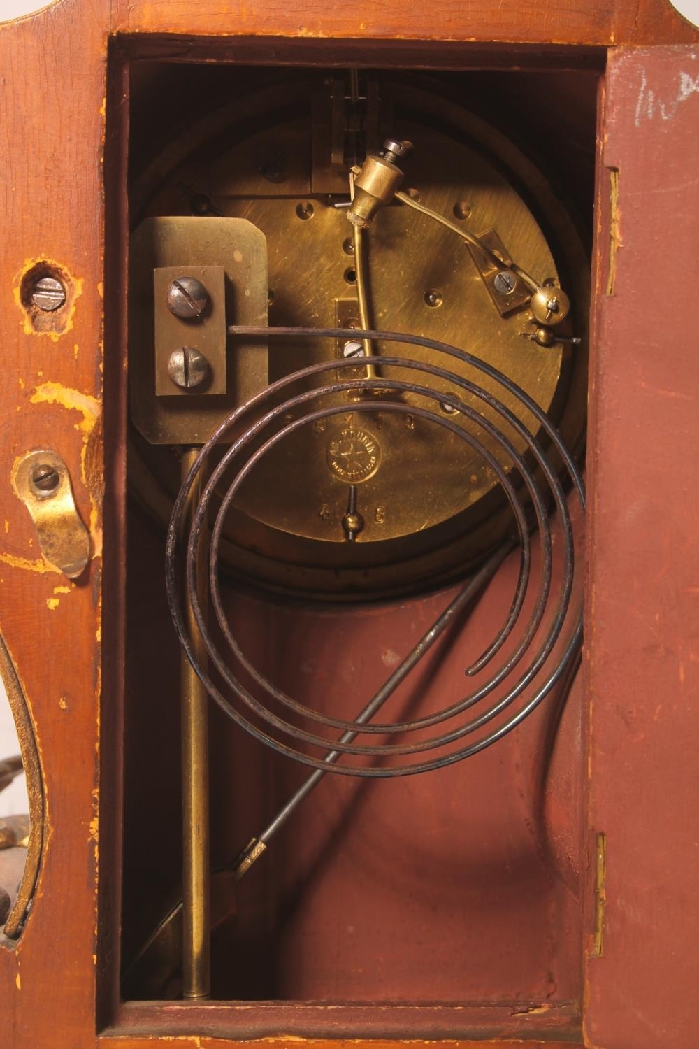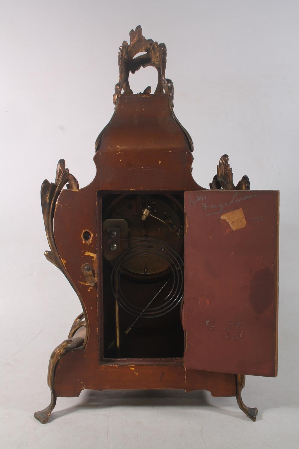 French Rococo style painted giltwood mantel clock, the movement stamped A D Mougin, no.88119, 40cm high.