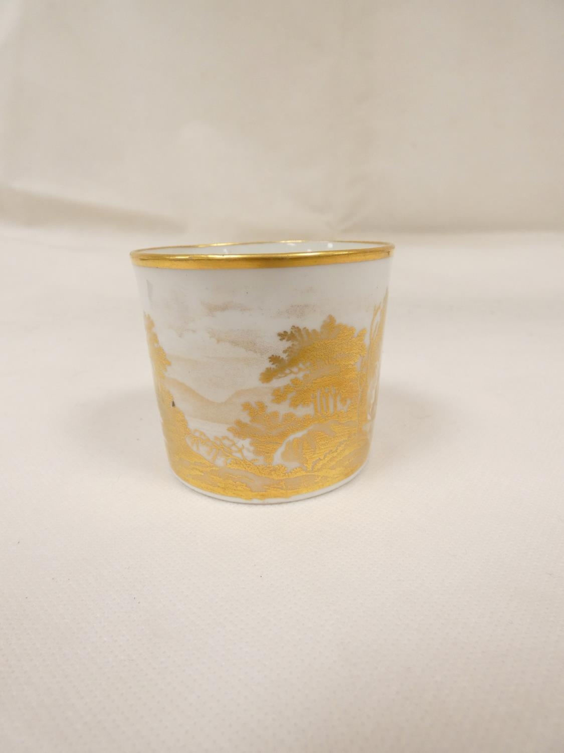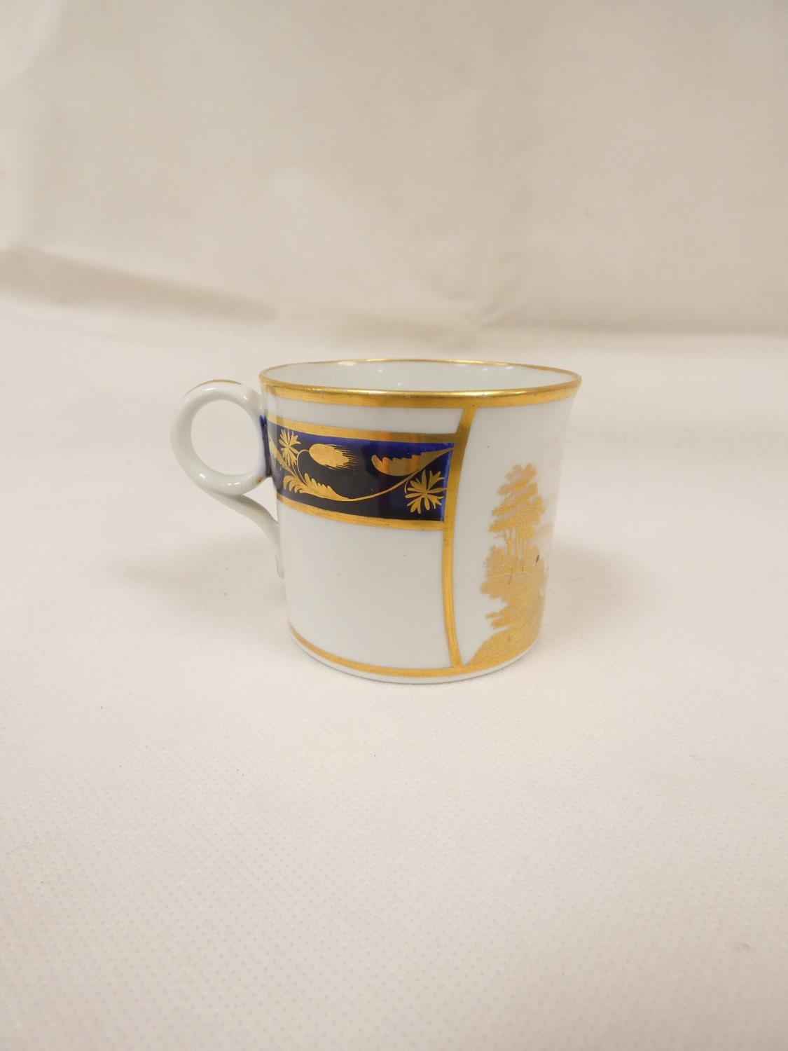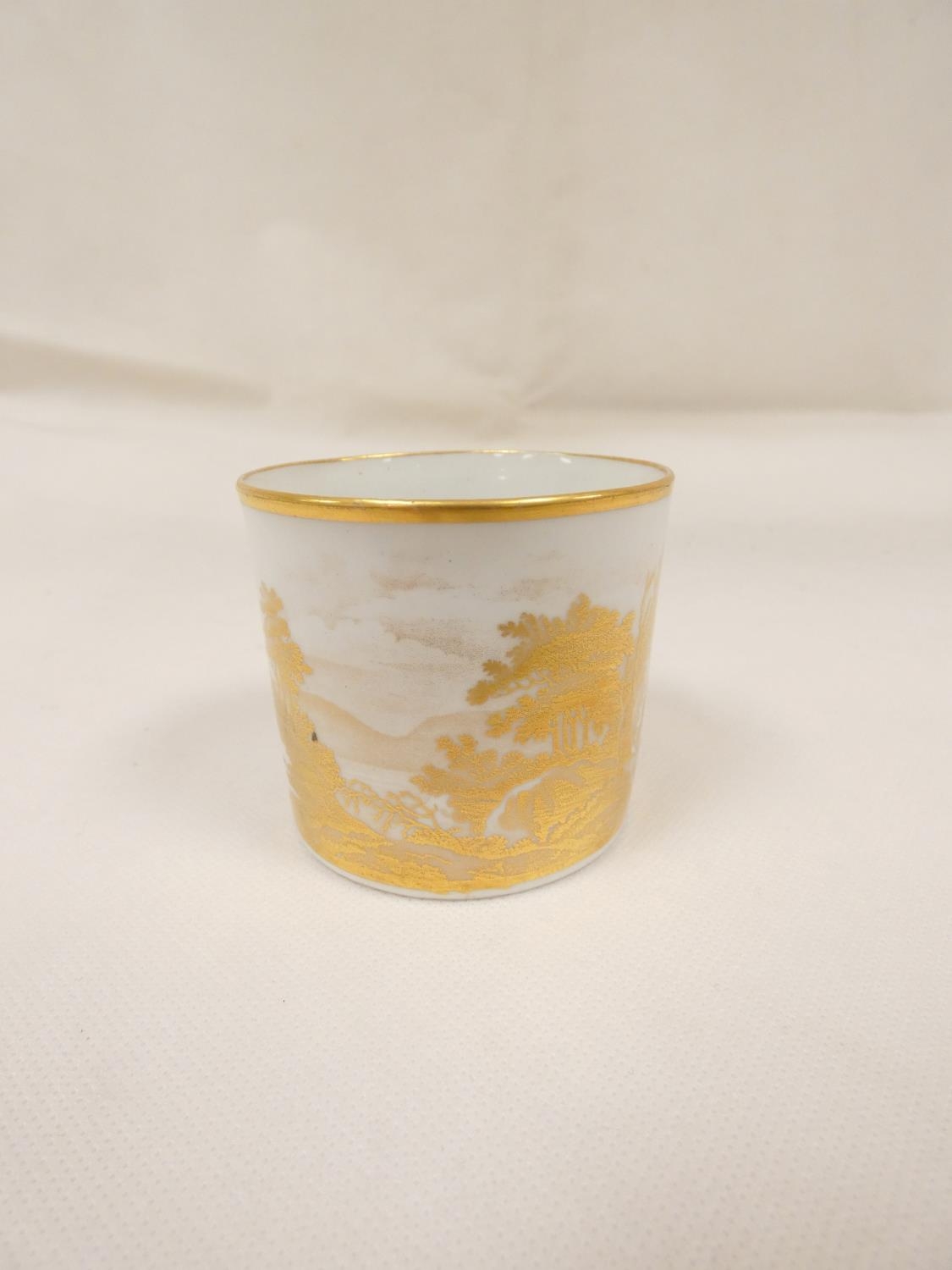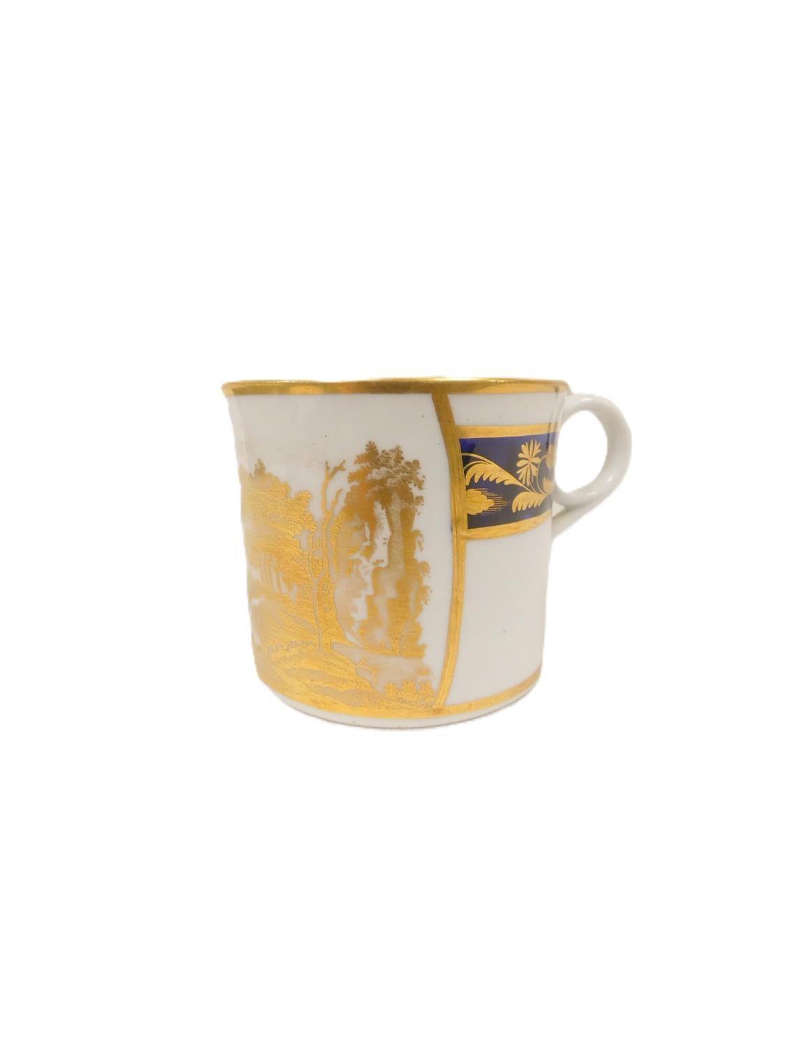 New Hall coffee can, a mountain and lake landscape printed in gold, blue and gold foliate band to reverse, ring handle, unmarked but Warburton's patent, 6cm high, c.1810.