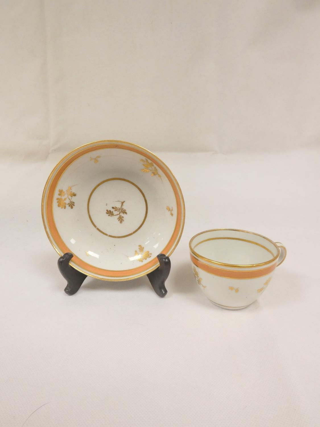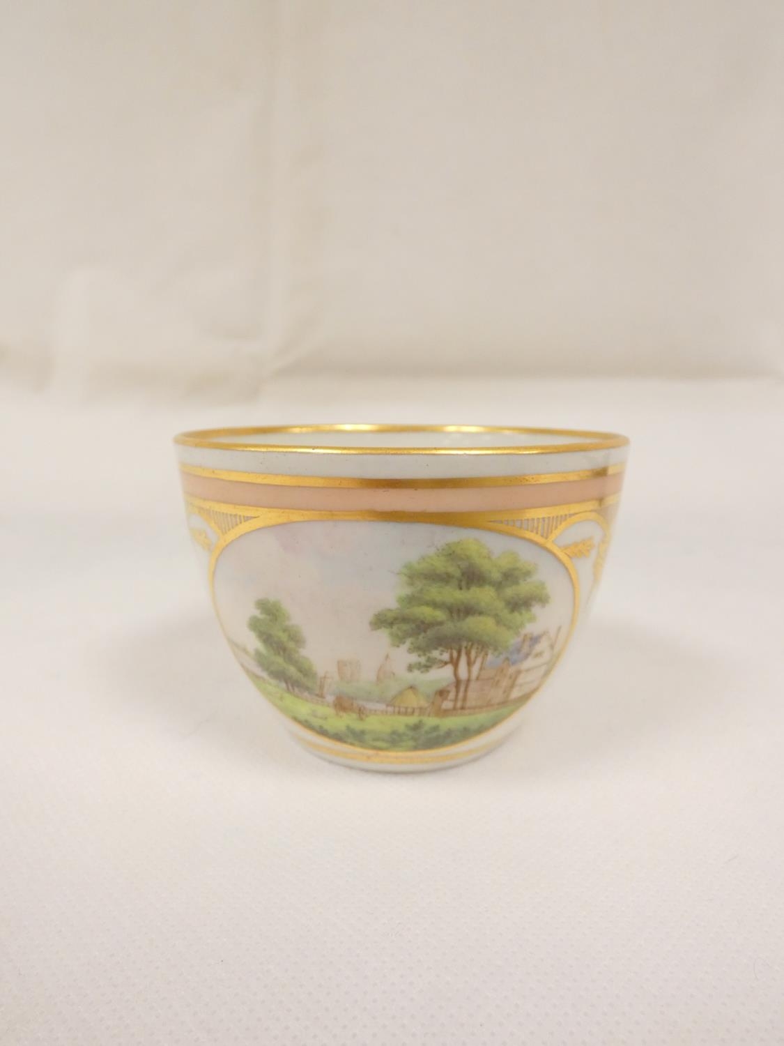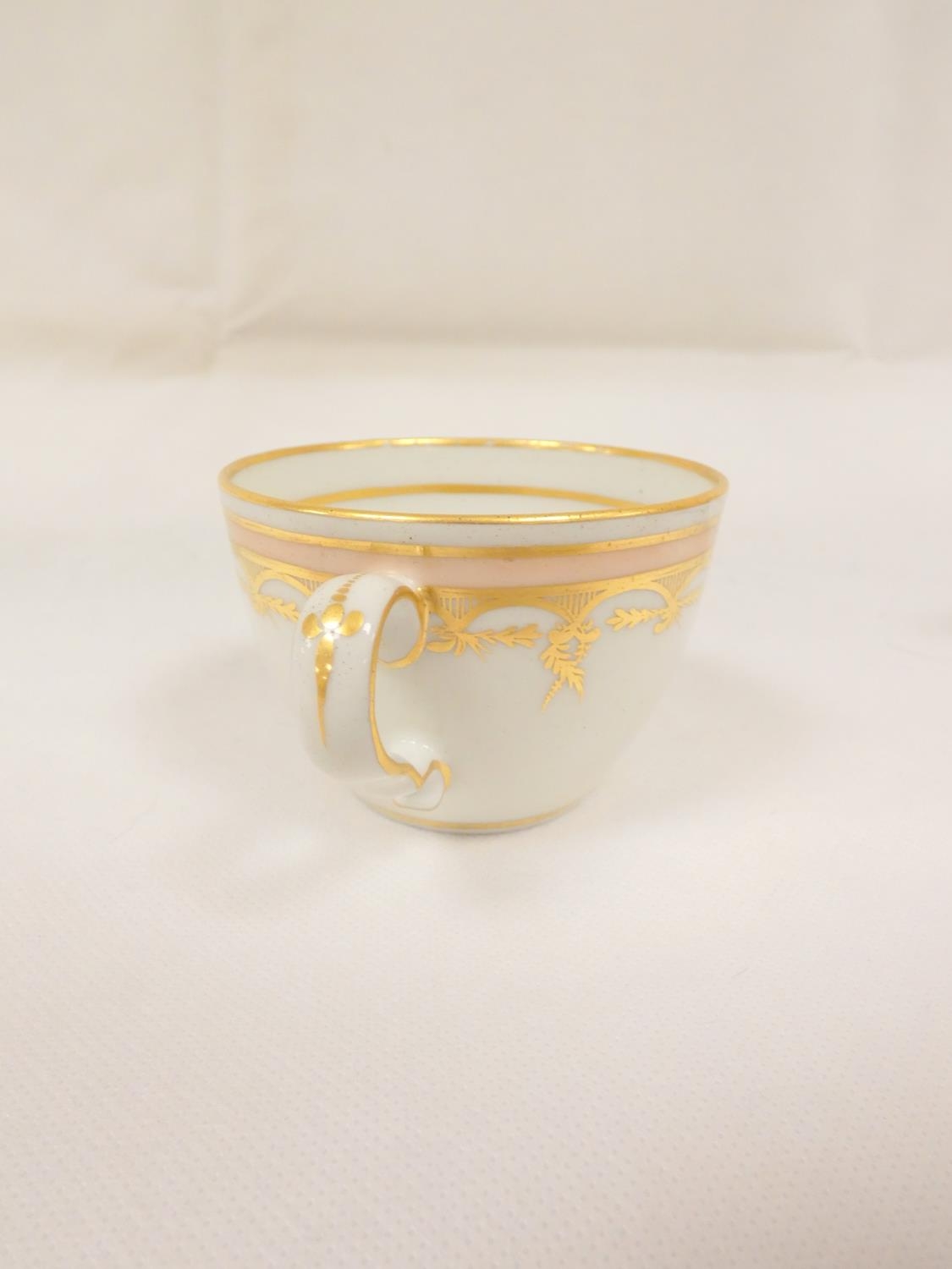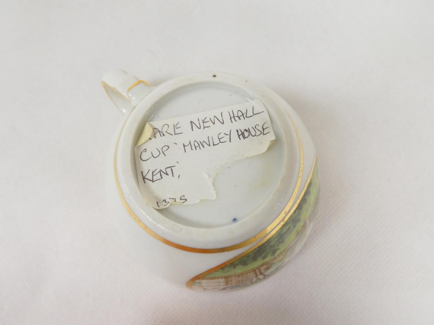 New Hall "Views in Kent" teacup of Bute shape, the handle of rare kinked loop form similar to Spode, pink band and gilt decoration with an oval polychrome vignette depicting Manley House, Kent, c.1795; also teacup and saucer, gilt sprays and pink bands, with a handle to match the previously described cup, this from the Herrick collection. The teapot from this Views in Kent service is illustrated as colour plate 32 in Godden, New Hall Porcelains. (This sold in 2012 for £5,000). The views are based on Samuel Ireland's book Picturesque Views on the River Medway, published in 1793.