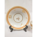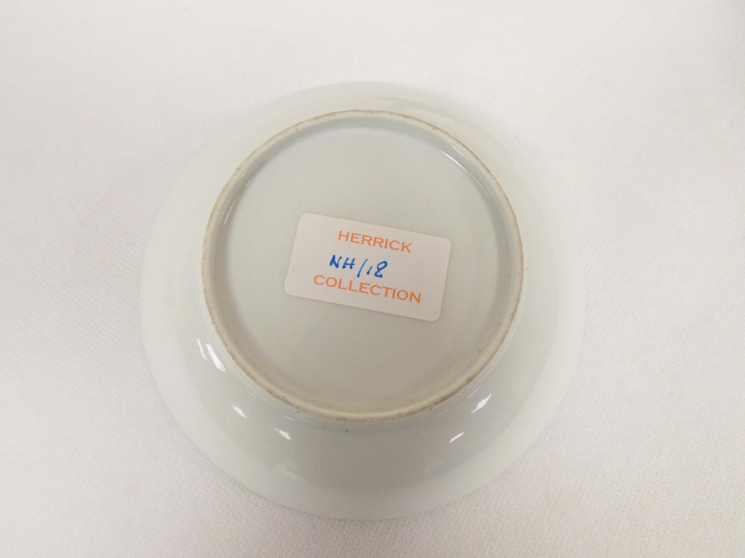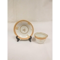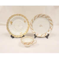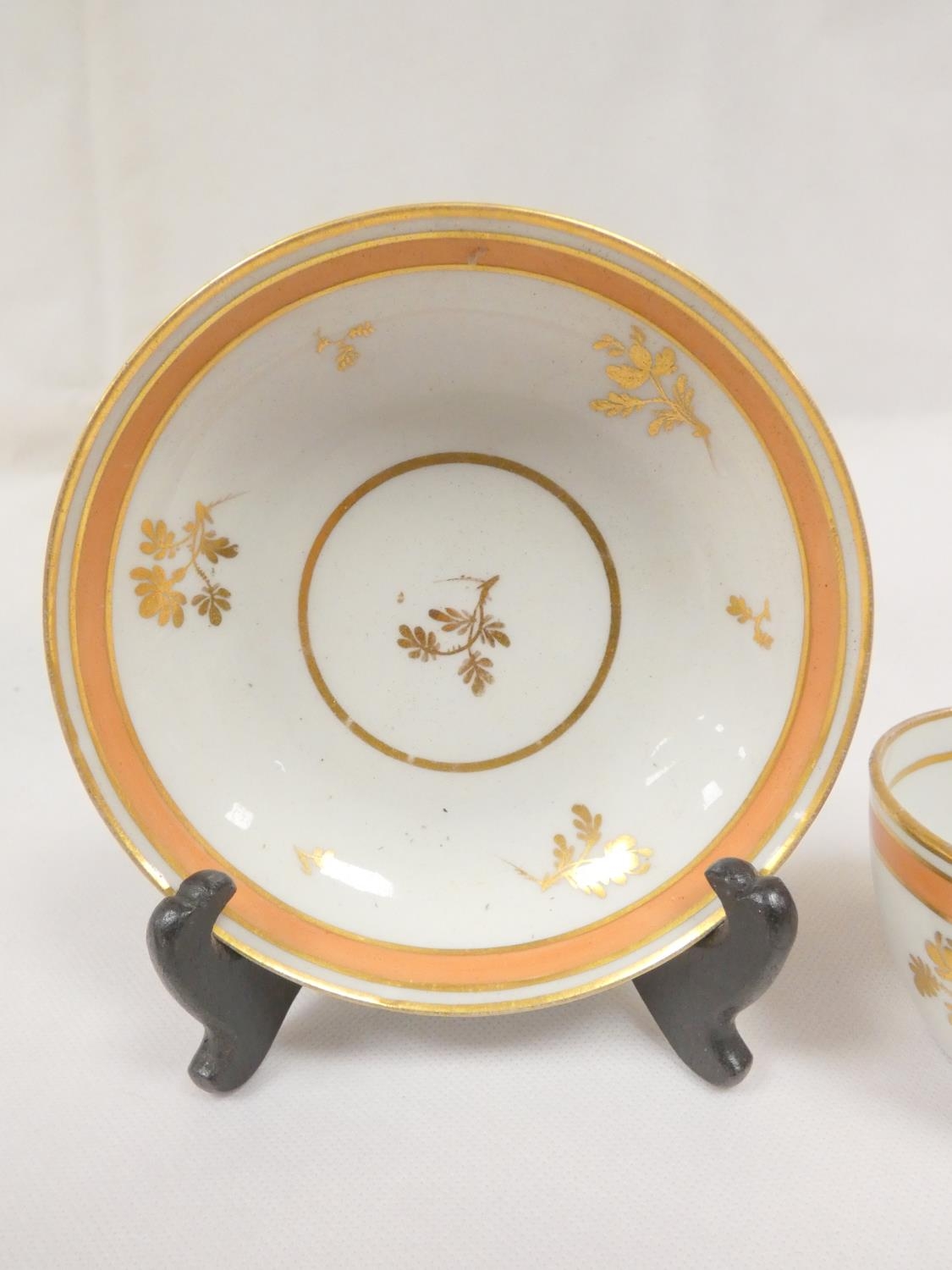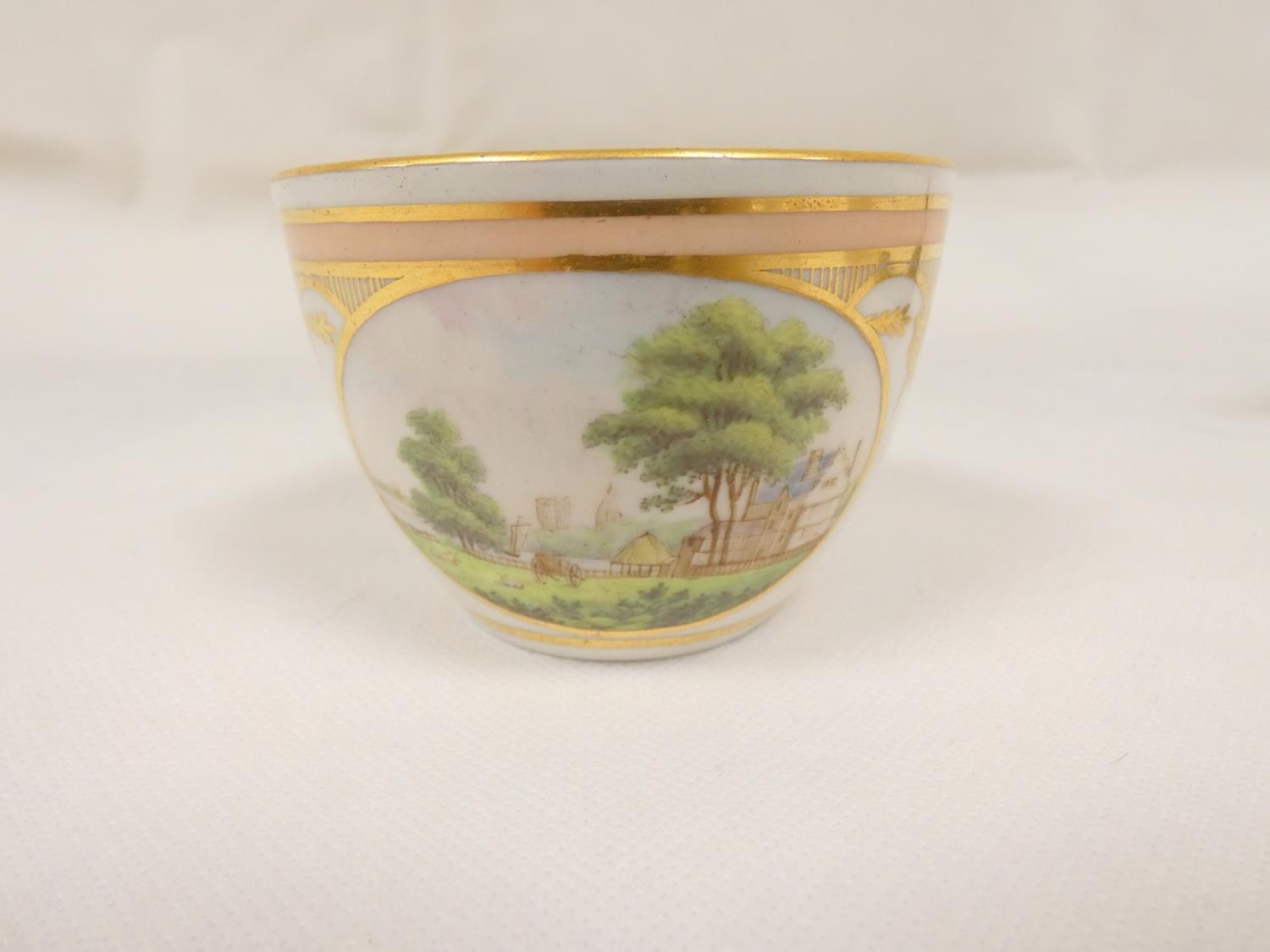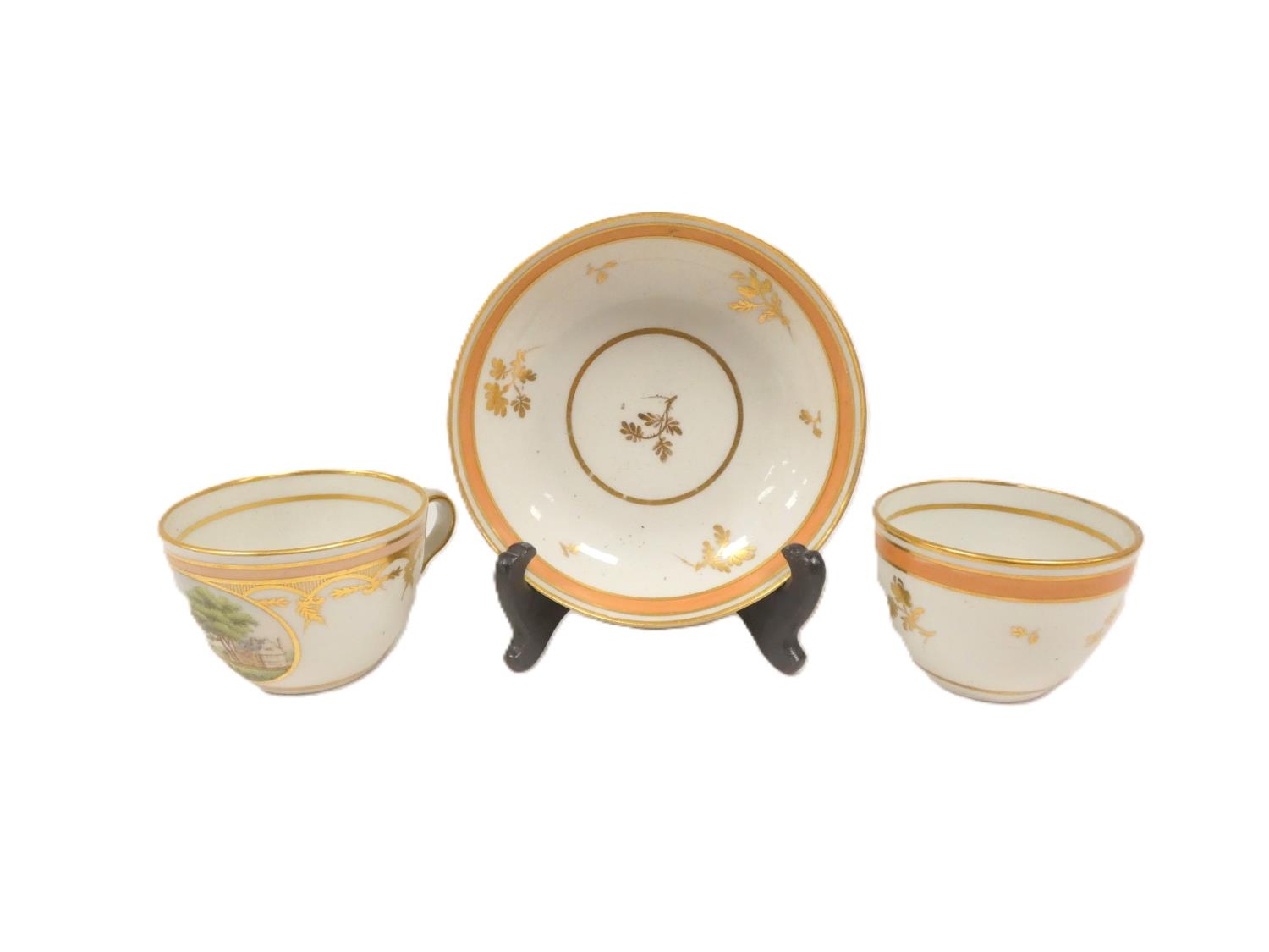 New Hall "Views in Kent" teacup of Bute shape, the handle of rare kinked loop form similar to Spode, pink band and gilt decoration with an oval polychrome vignette depicting Manley House, Kent, c.1795; also teacup and saucer, gilt sprays and pink bands, with a handle to match the previously described cup, this from the Herrick collection. The teapot from this Views in Kent service is illustrated as colour plate 32 in Godden, New Hall Porcelains. (This sold in 2012 for £5,000). The views are based on Samuel Ireland's book Picturesque Views on the River Medway, published in 1793.