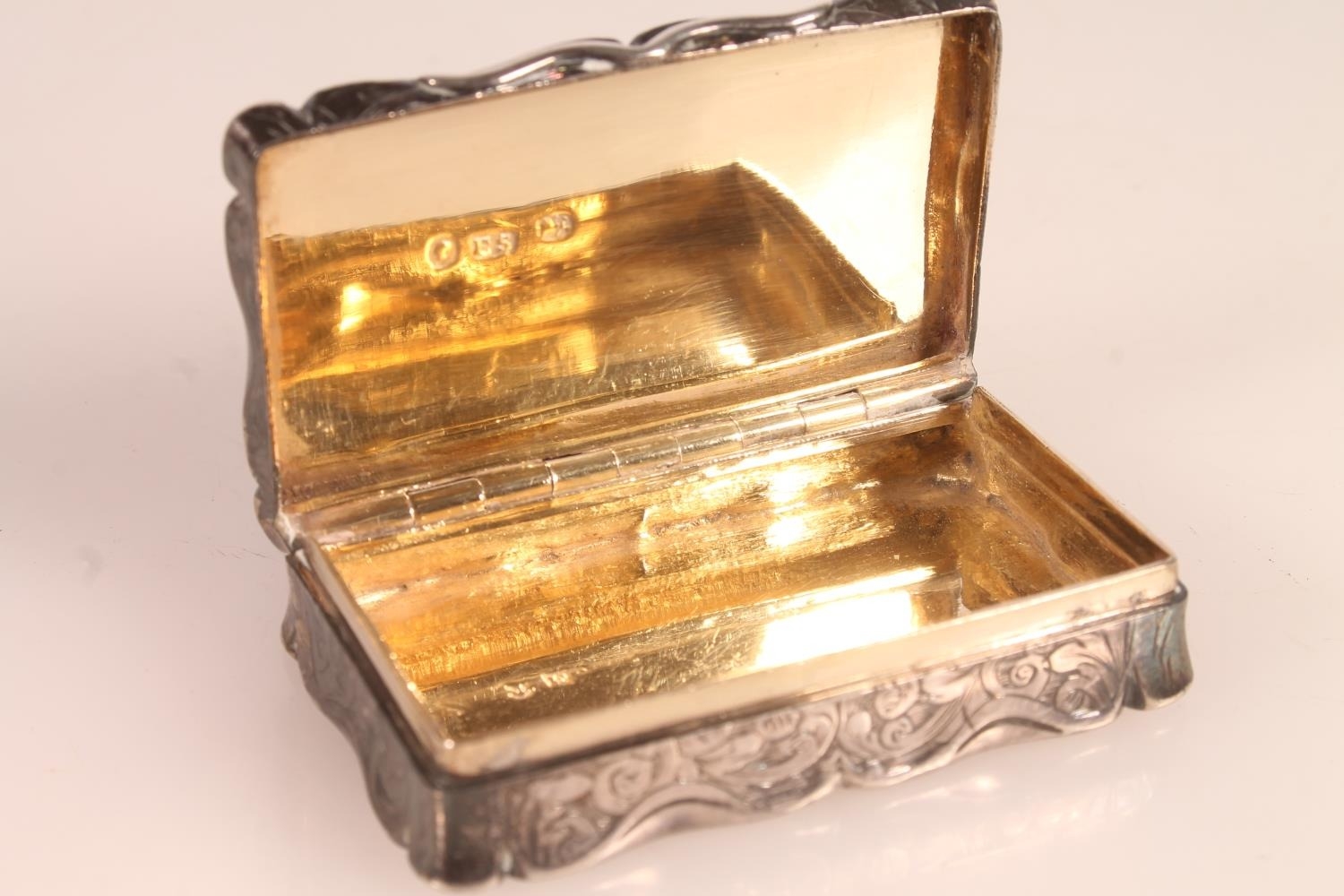 Victorian silver snuff box. with shaped edges and scrolling acanthus engraved body, opening to reveal gilt interior, Edward Smith, Birmingham date mark rubbed, W6.5cm.
