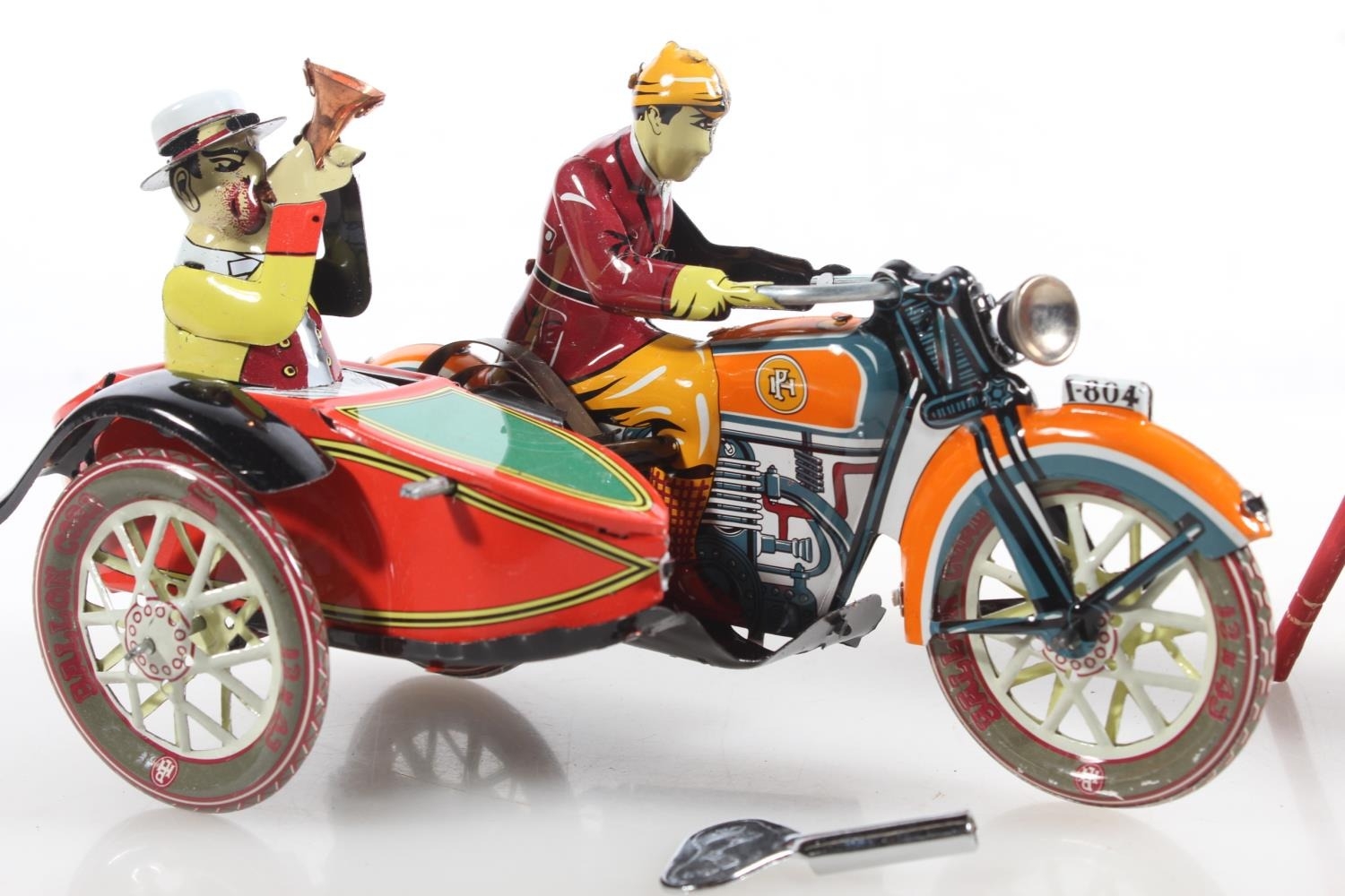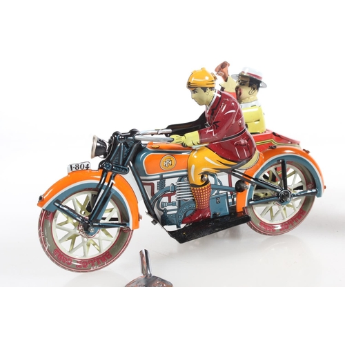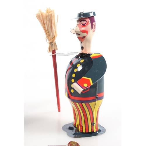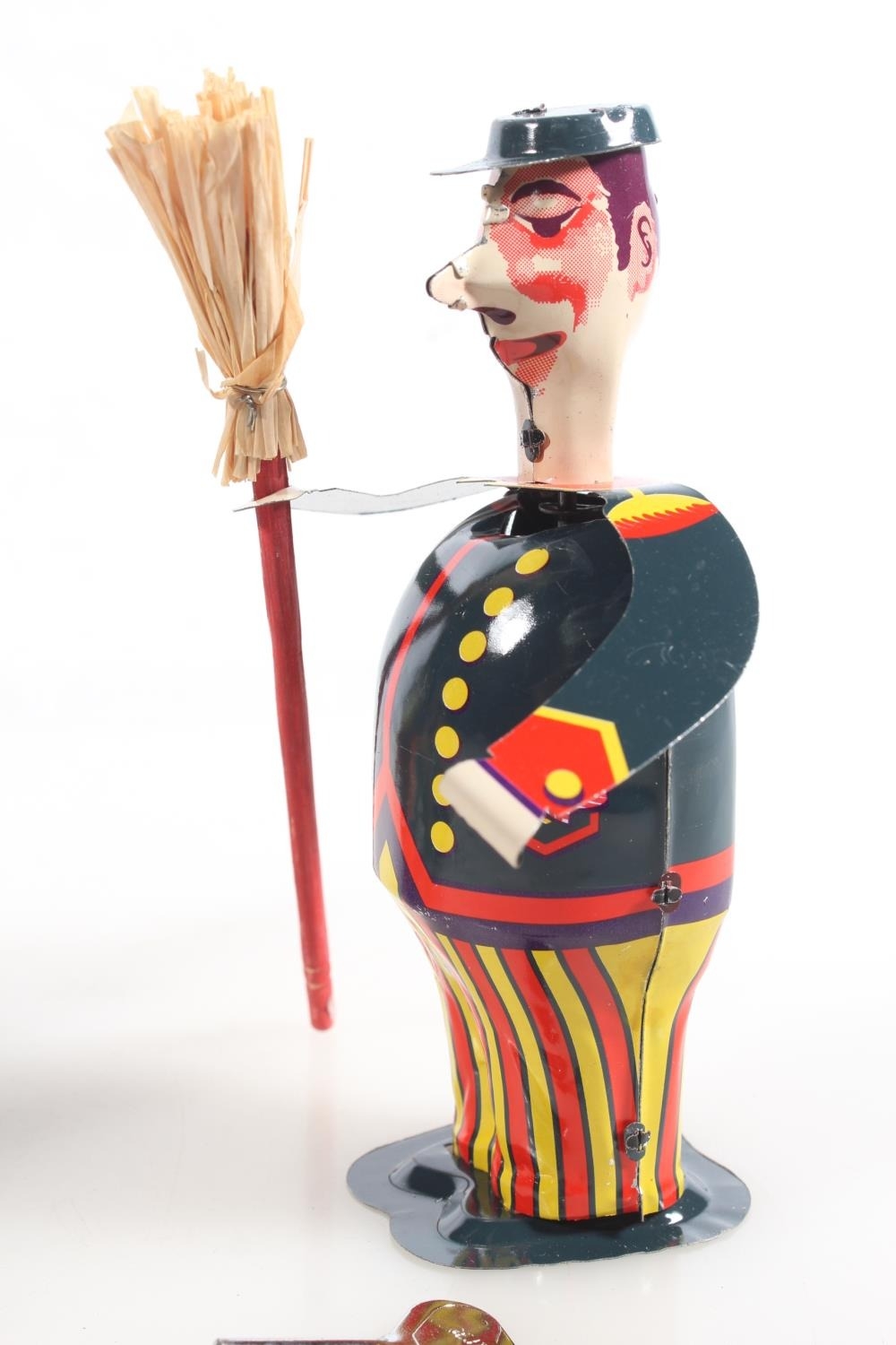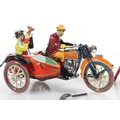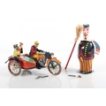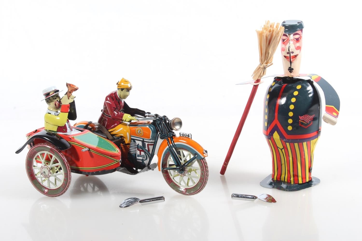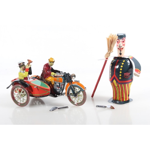 Two metal clockwork automatons, one in the form of a motorcycle and sidecar, the other modelled as man holding broom, 16cm tall. (2)