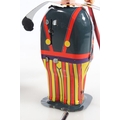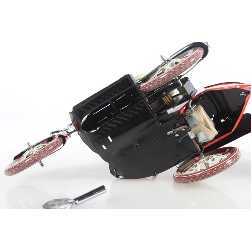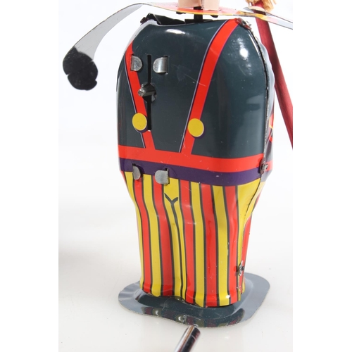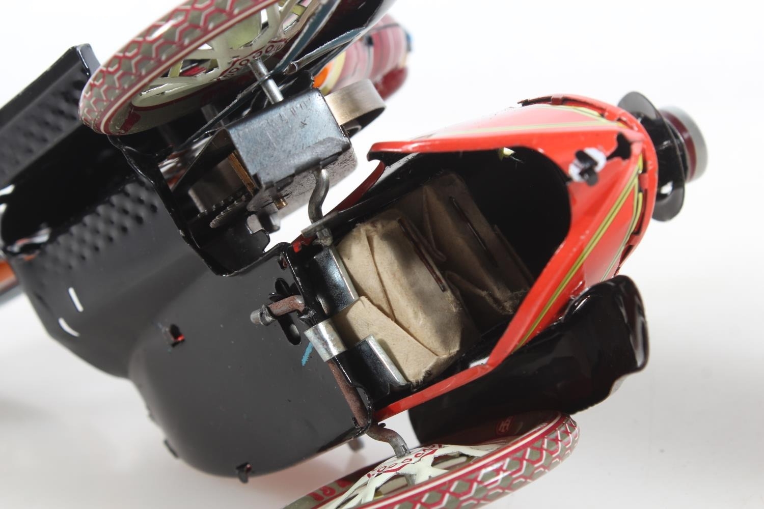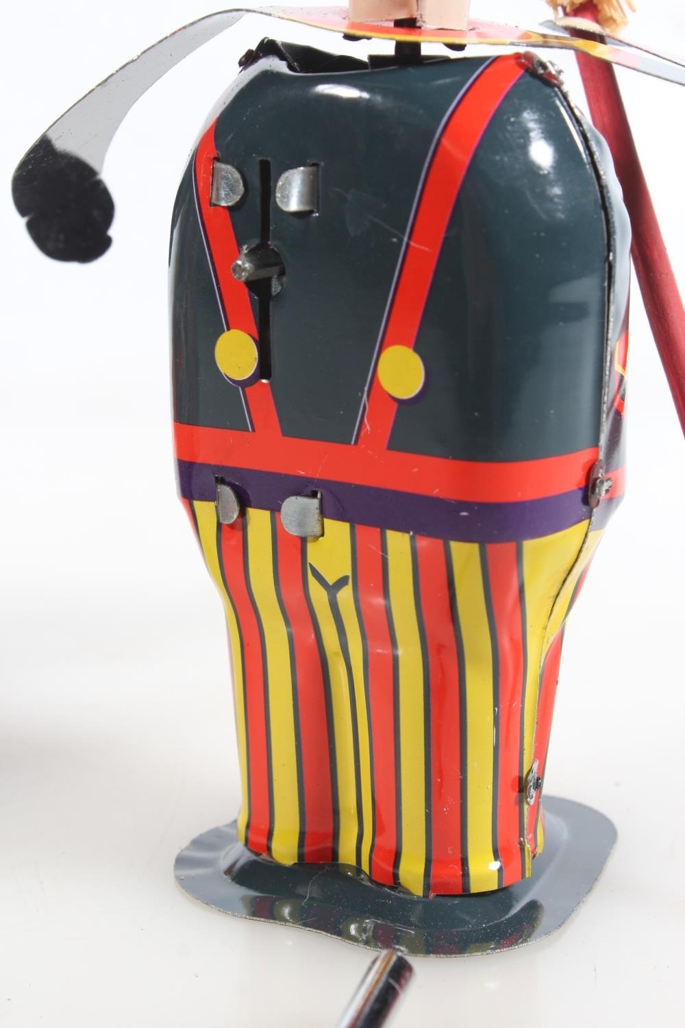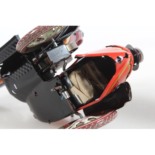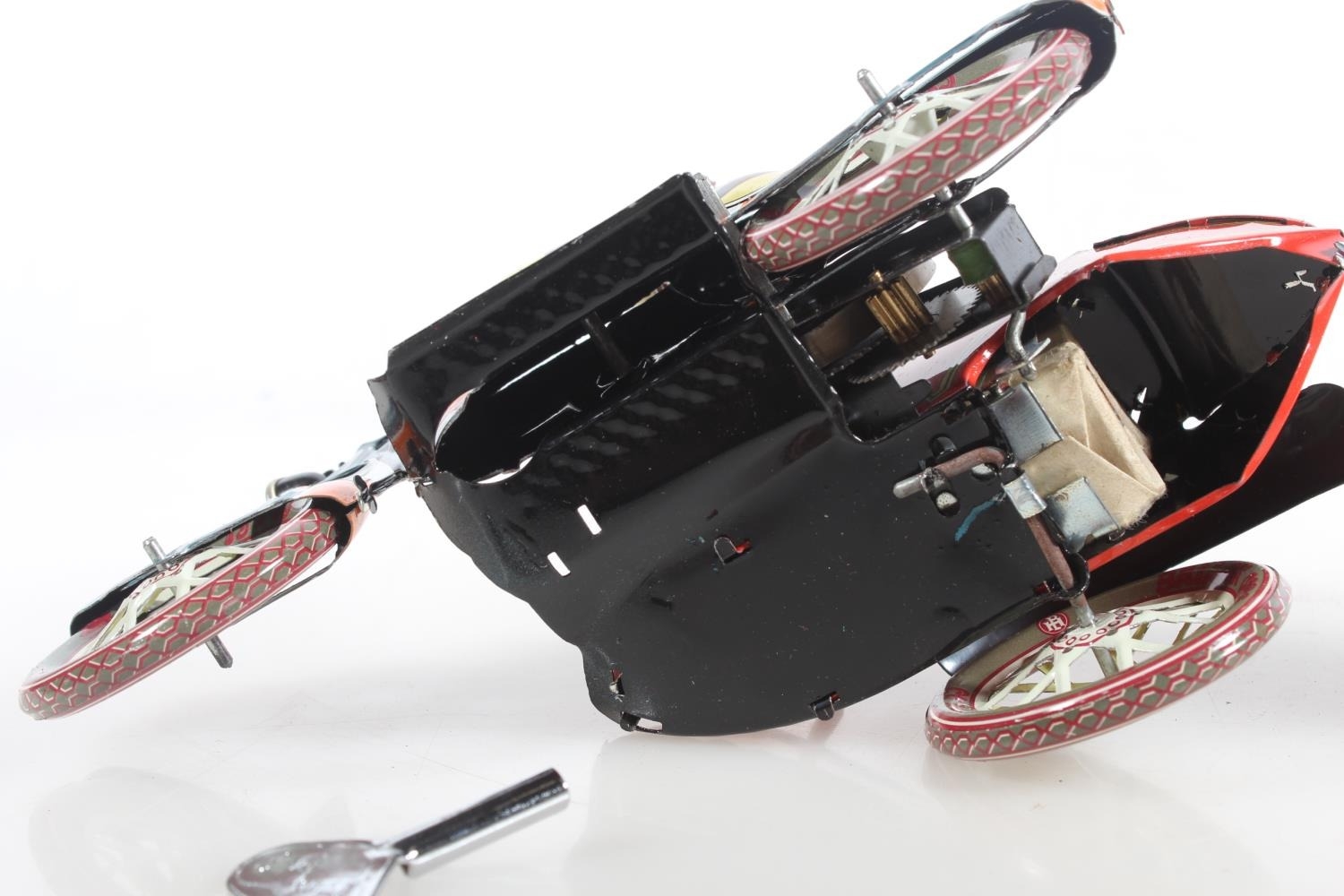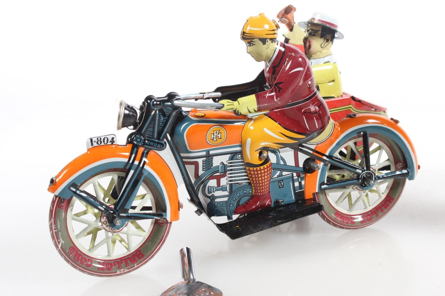 Two metal clockwork automatons, one in the form of a motorcycle and sidecar, the other modelled as man holding broom, 16cm tall. (2)