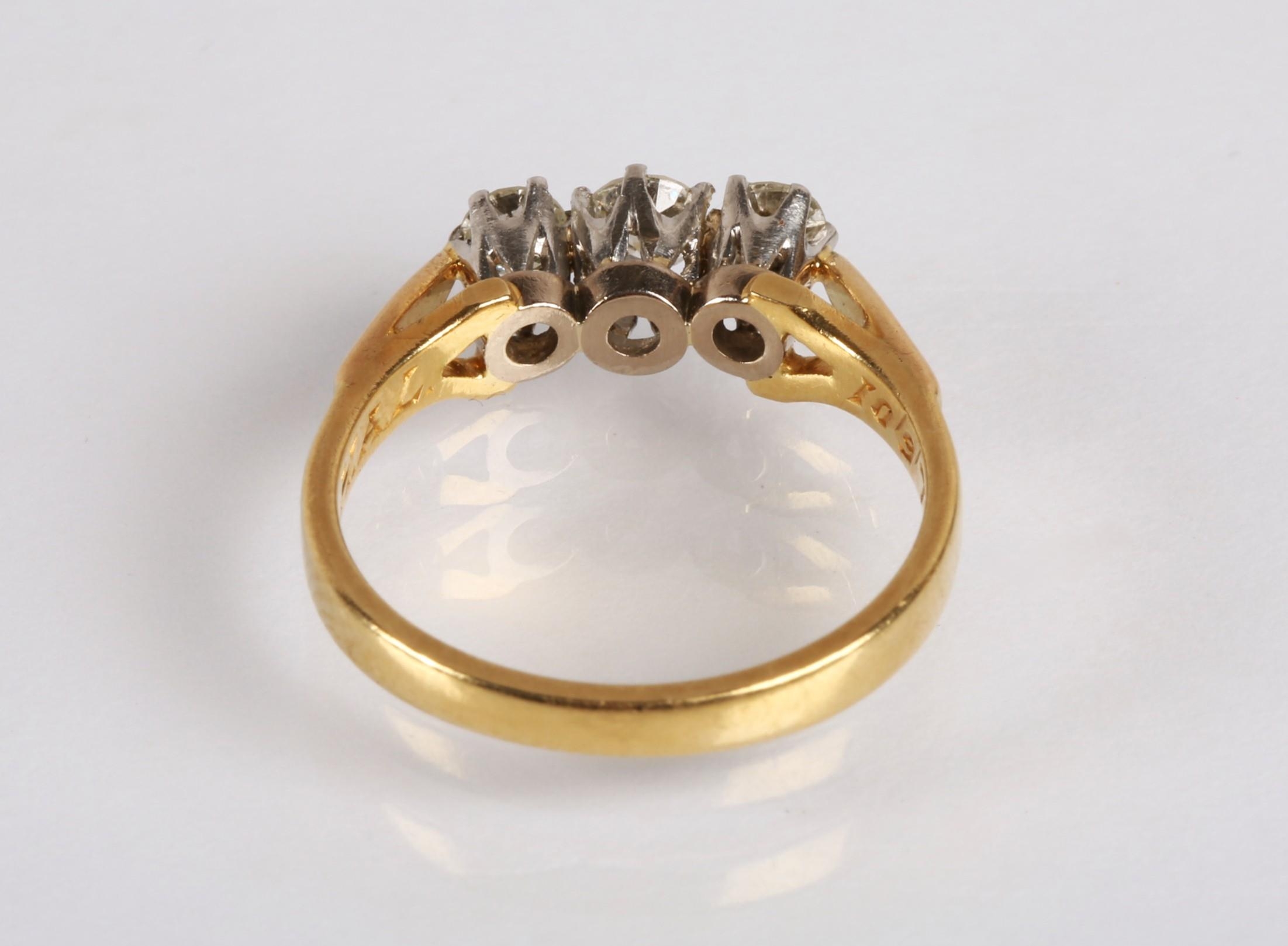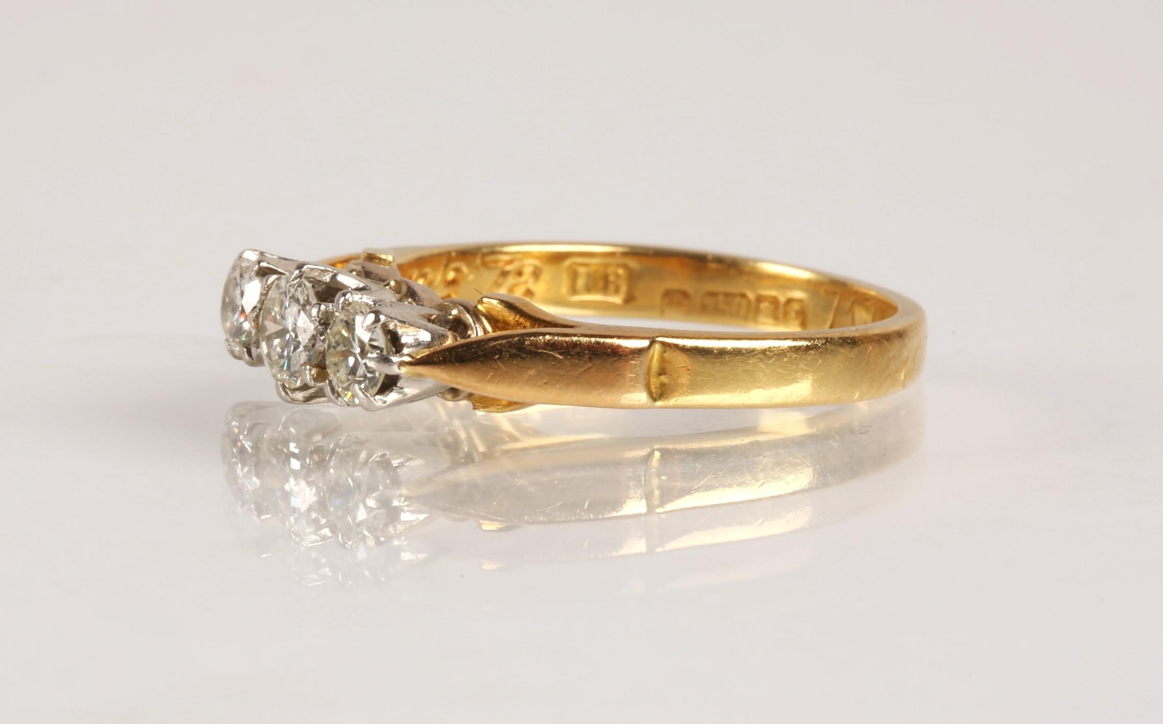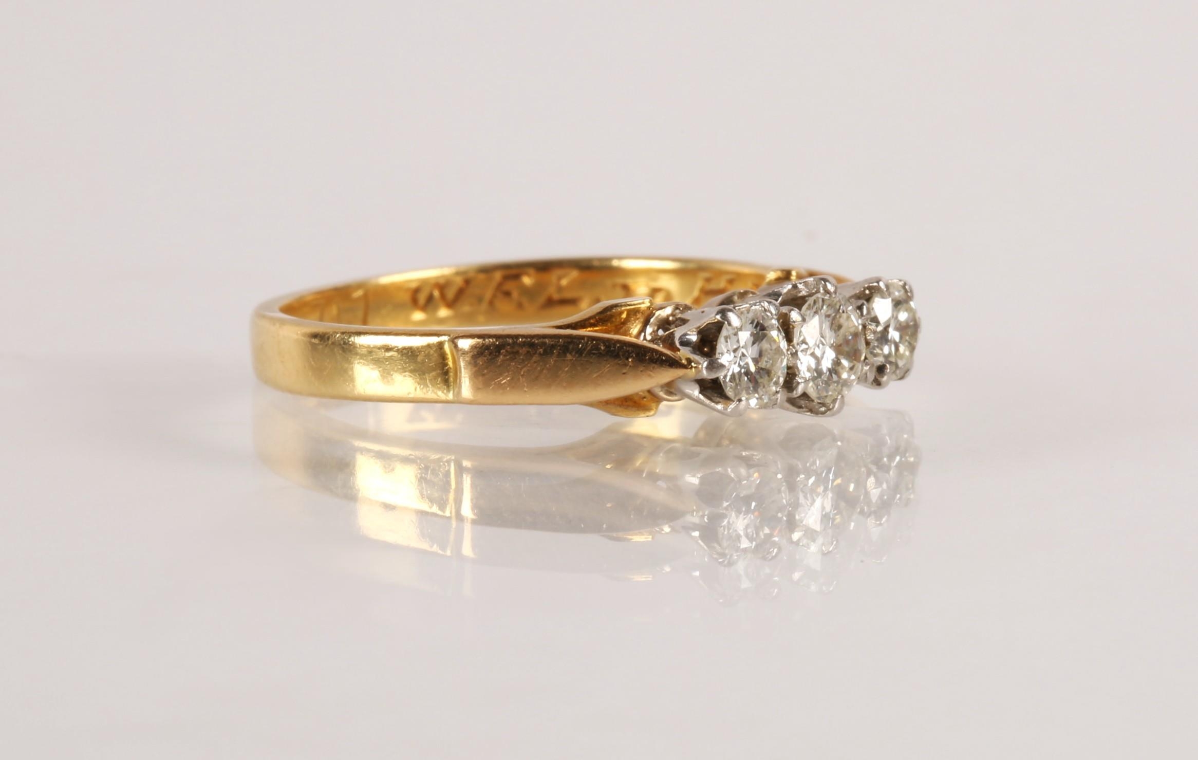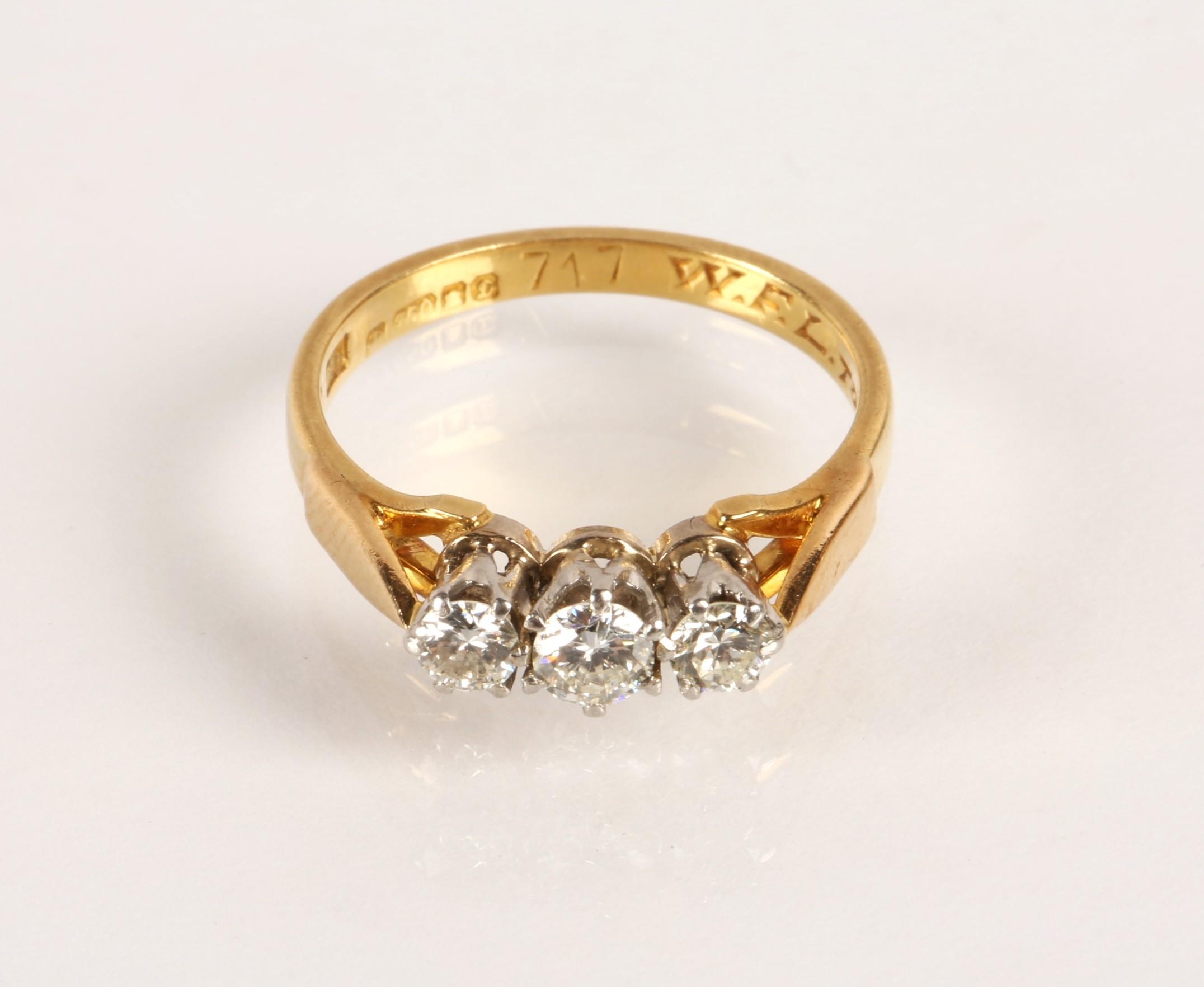 Ladies 18ct yellow gold diamond three stone ring, set with three graduated brilliant cut stones in a claw setting, central stone 0.2 carat flanked by 0.2 carat stones, engraved to the band, ring size O, gross weight 3.9 grams