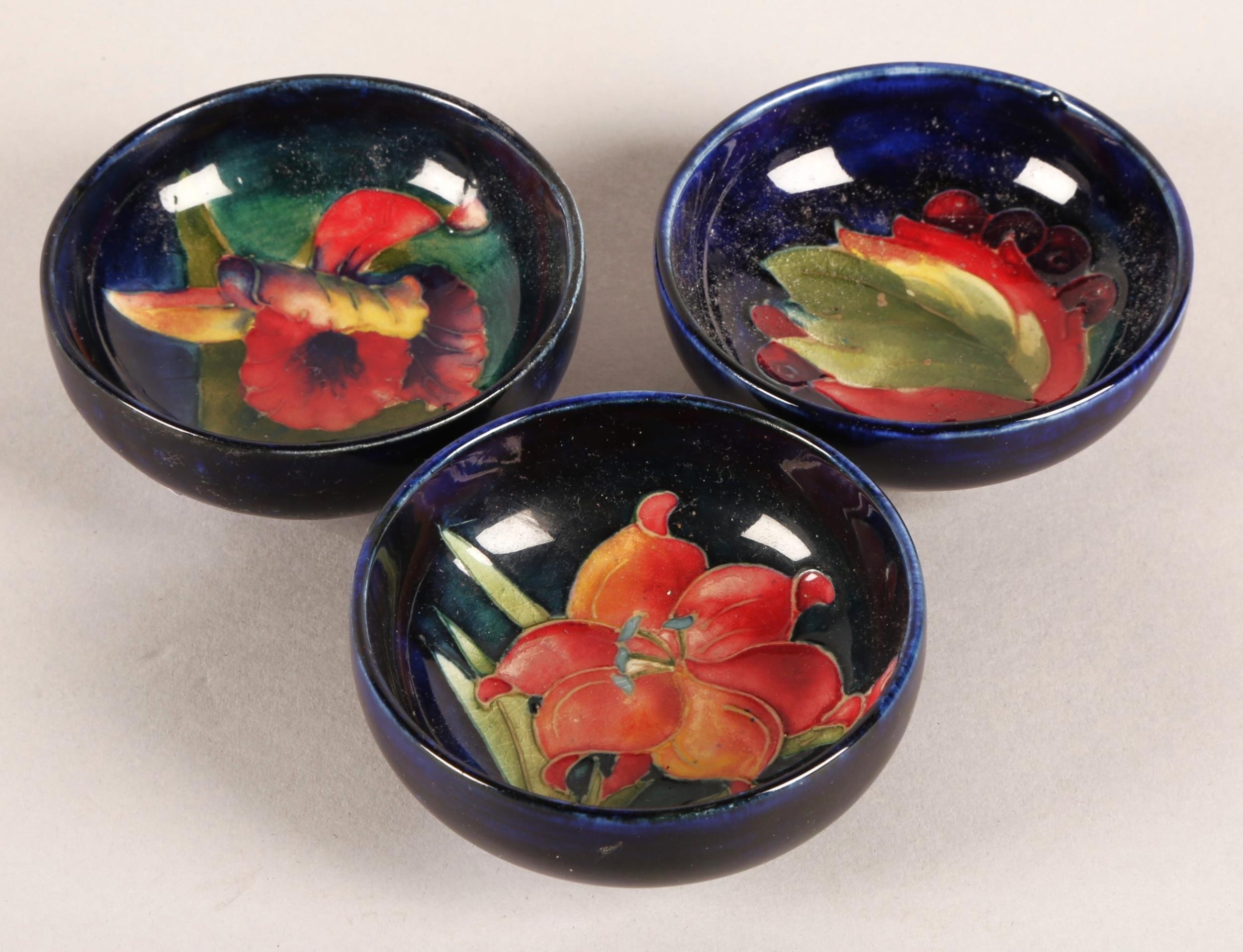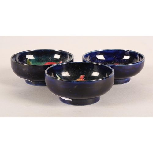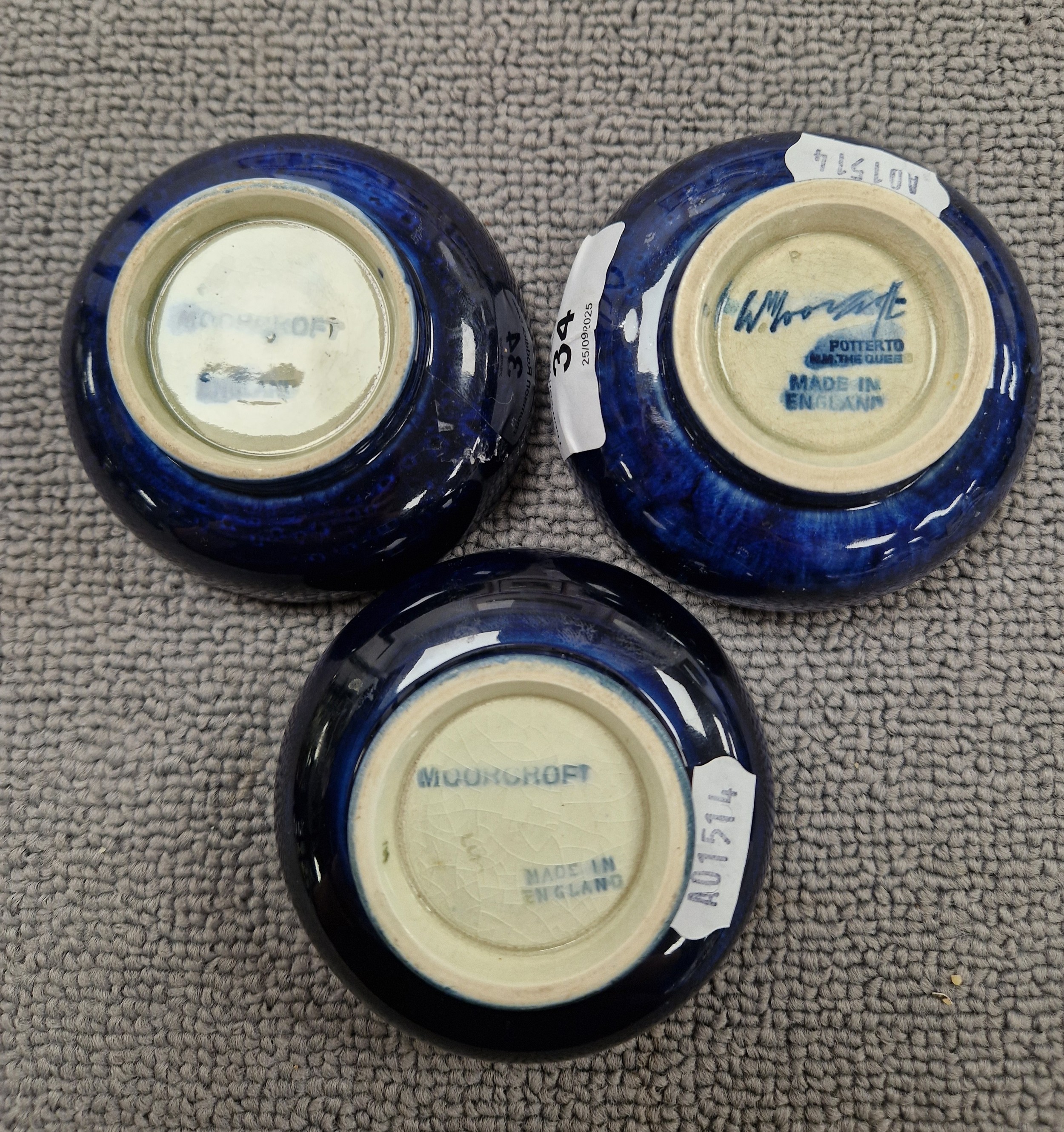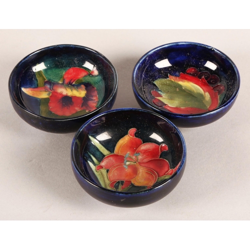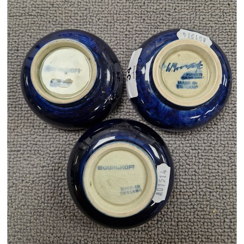 Three Moorcroft pottery small pinch pot bowls, blue ground, each approx. 8cm diameter