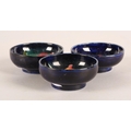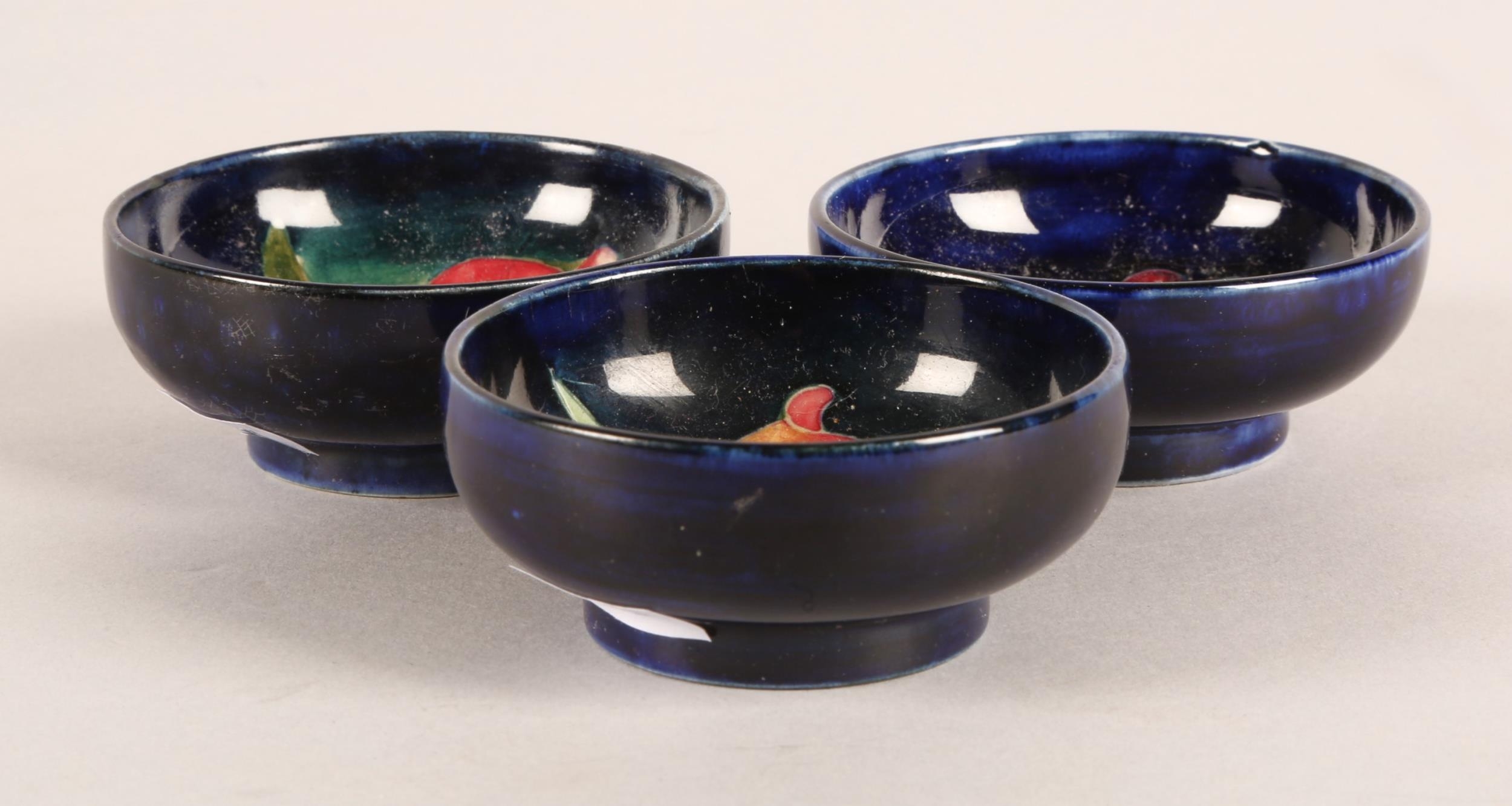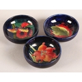 Three Moorcroft pottery small pinch pot bowls, blue ground, ...