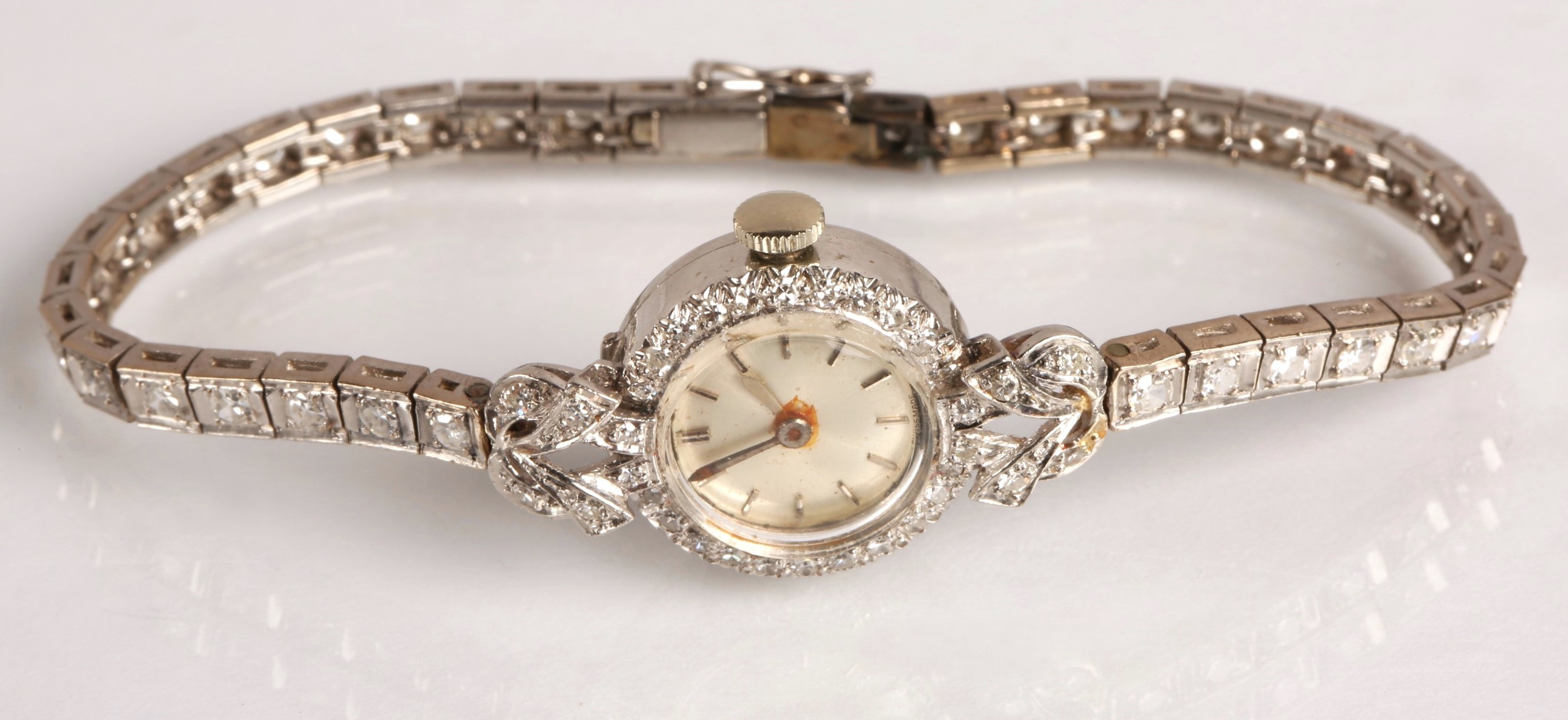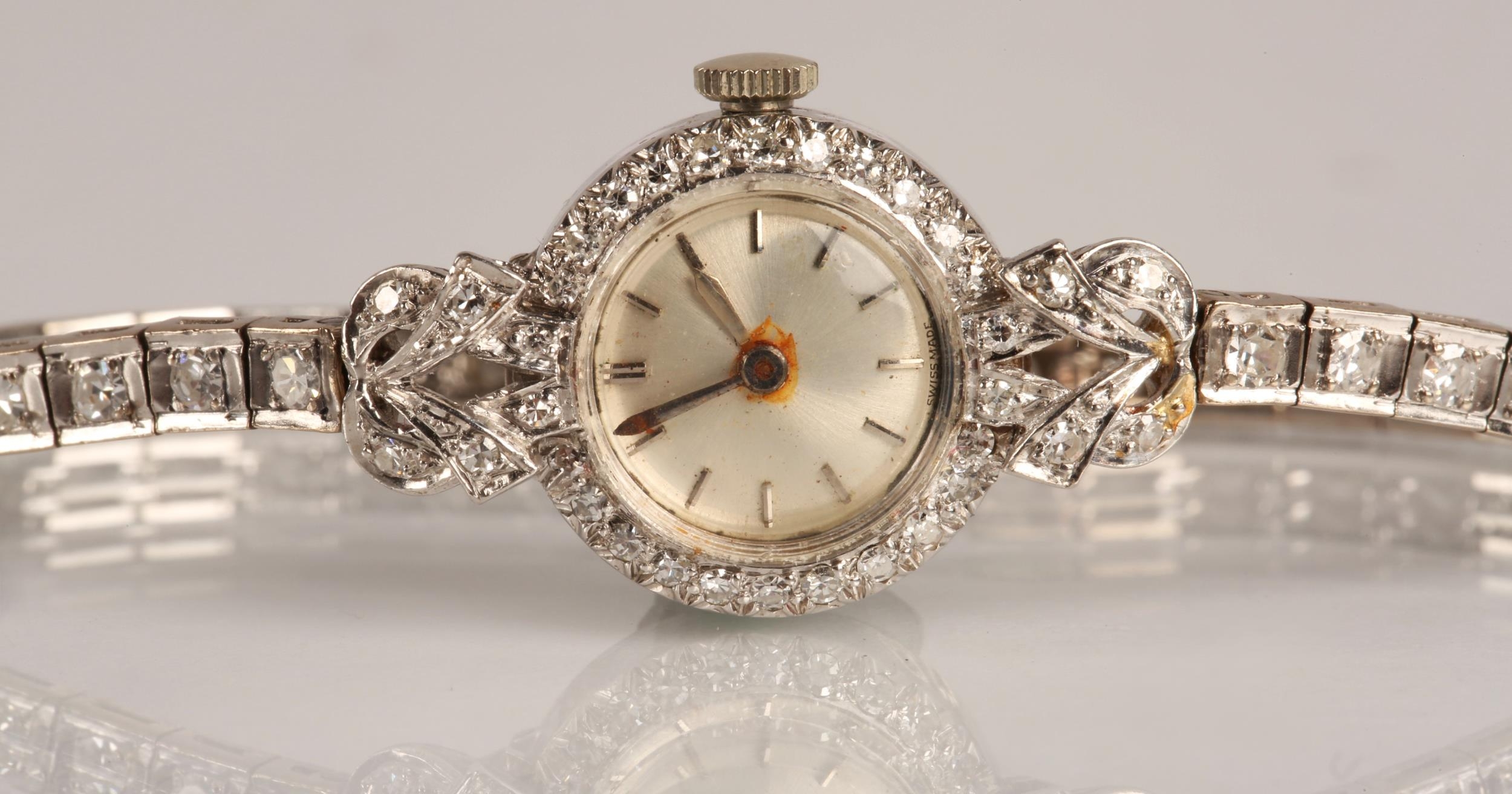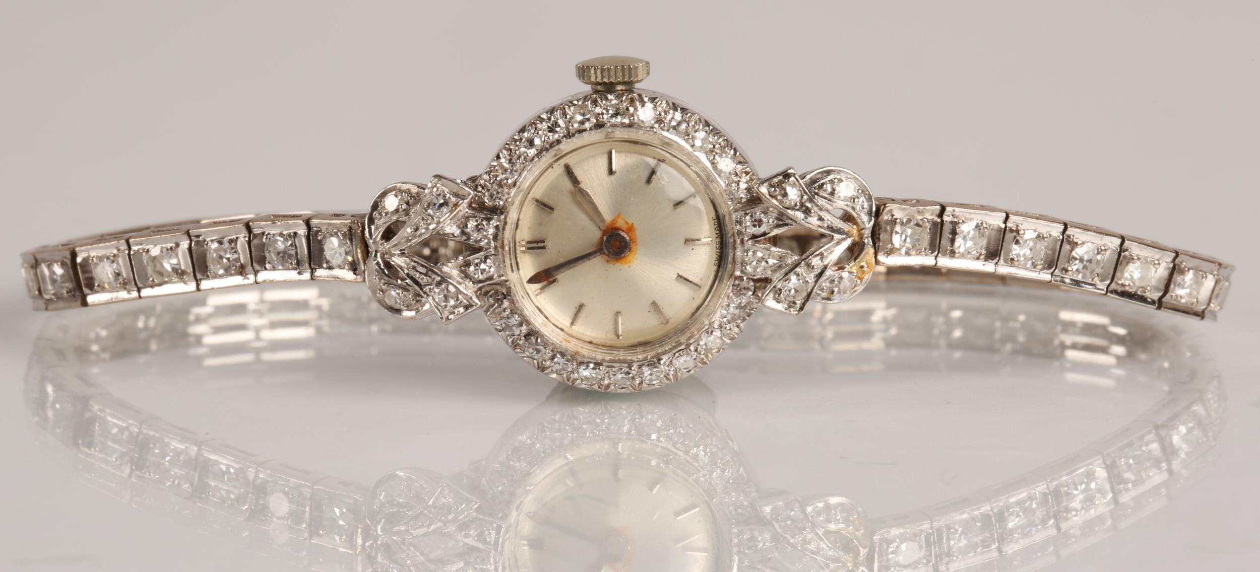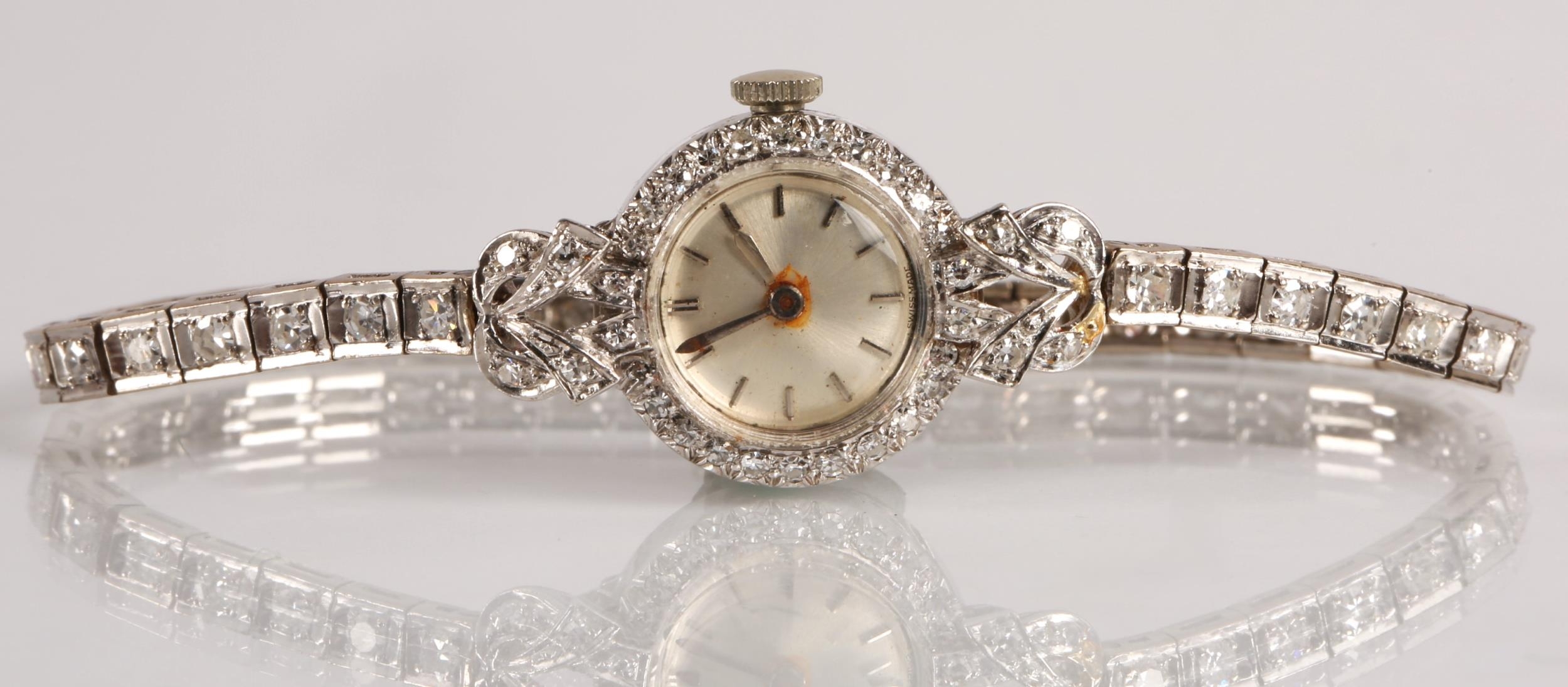Ladies platinum and diamond cocktail wrist watch, the dial with hour marker batons surround by diamond bezel, with a diamond encrusted strap, gross weight 21.8 grams