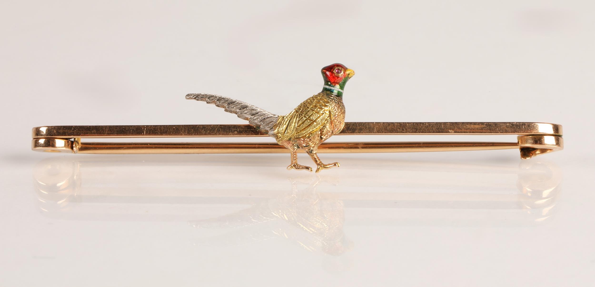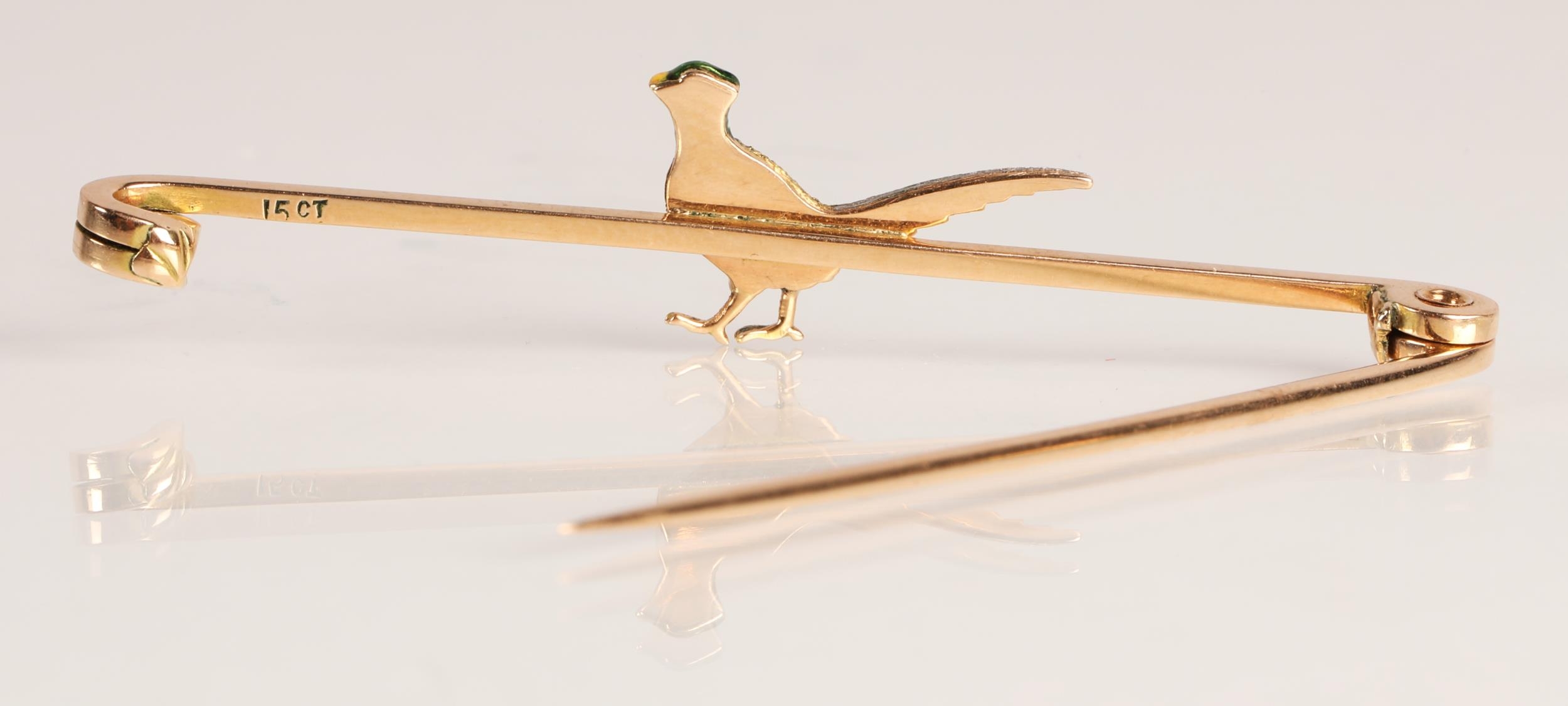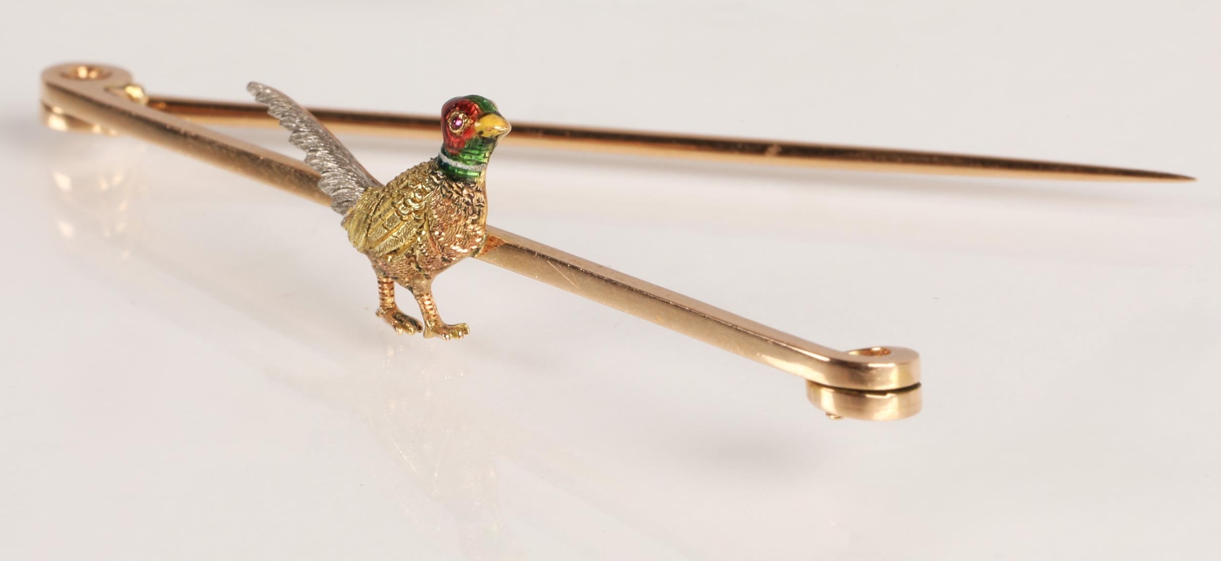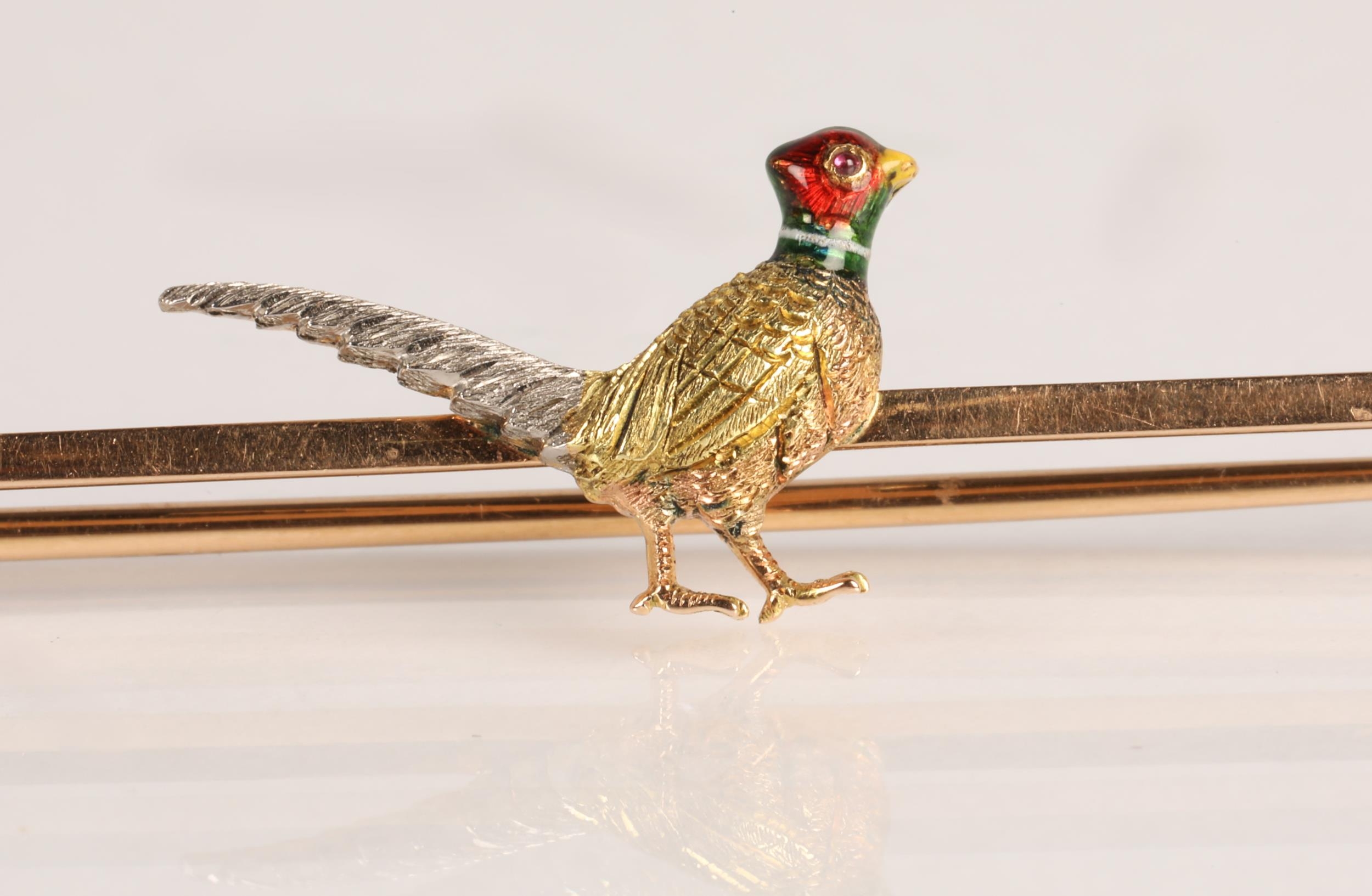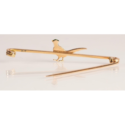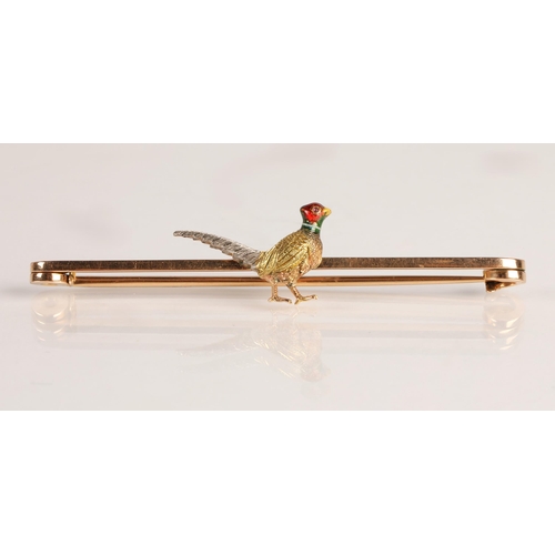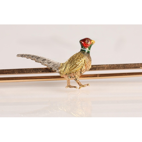 15ct gold bar brooch in the form of a pheasant with tri-colour gold and enamel detail, 4.5g