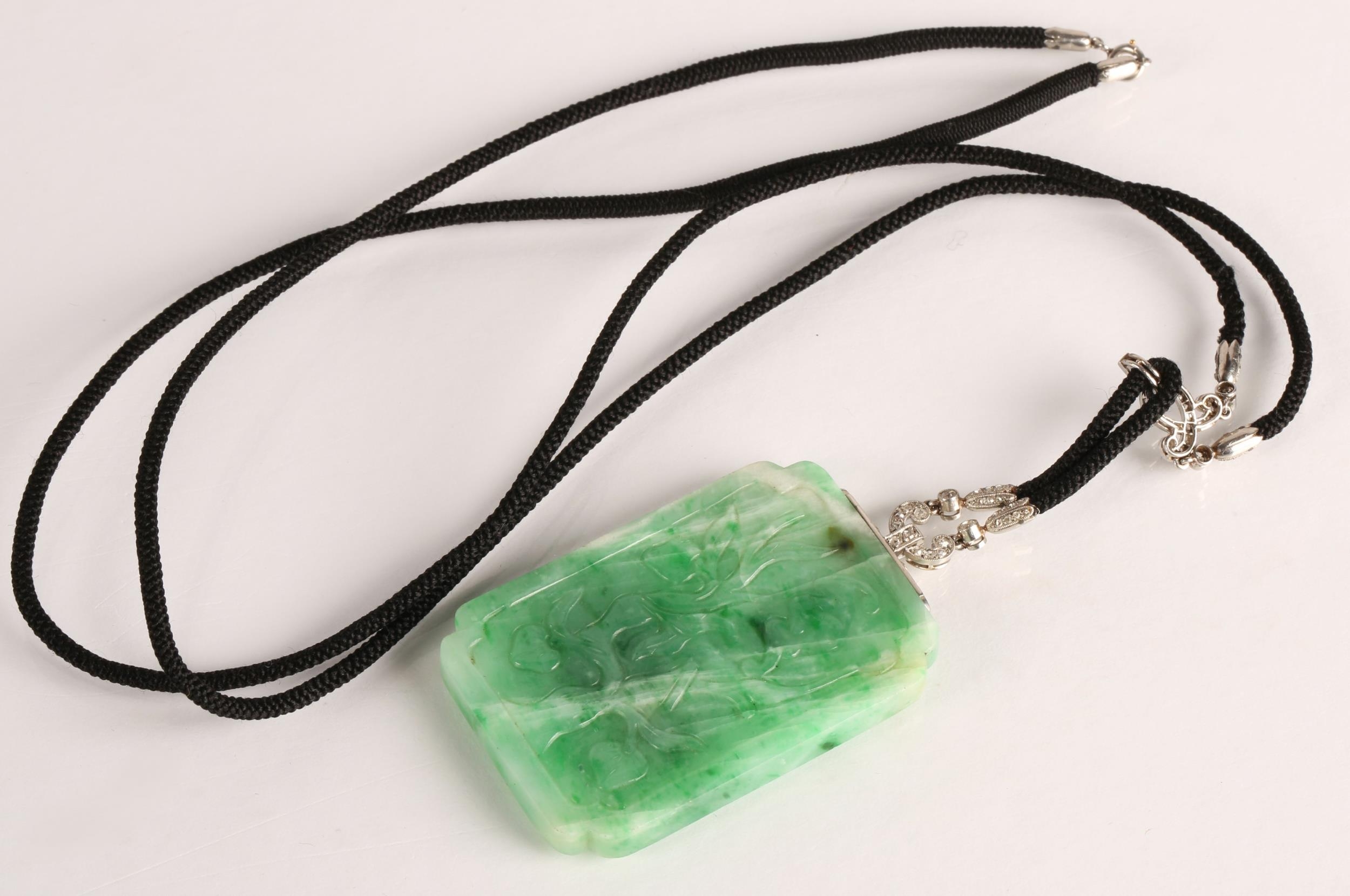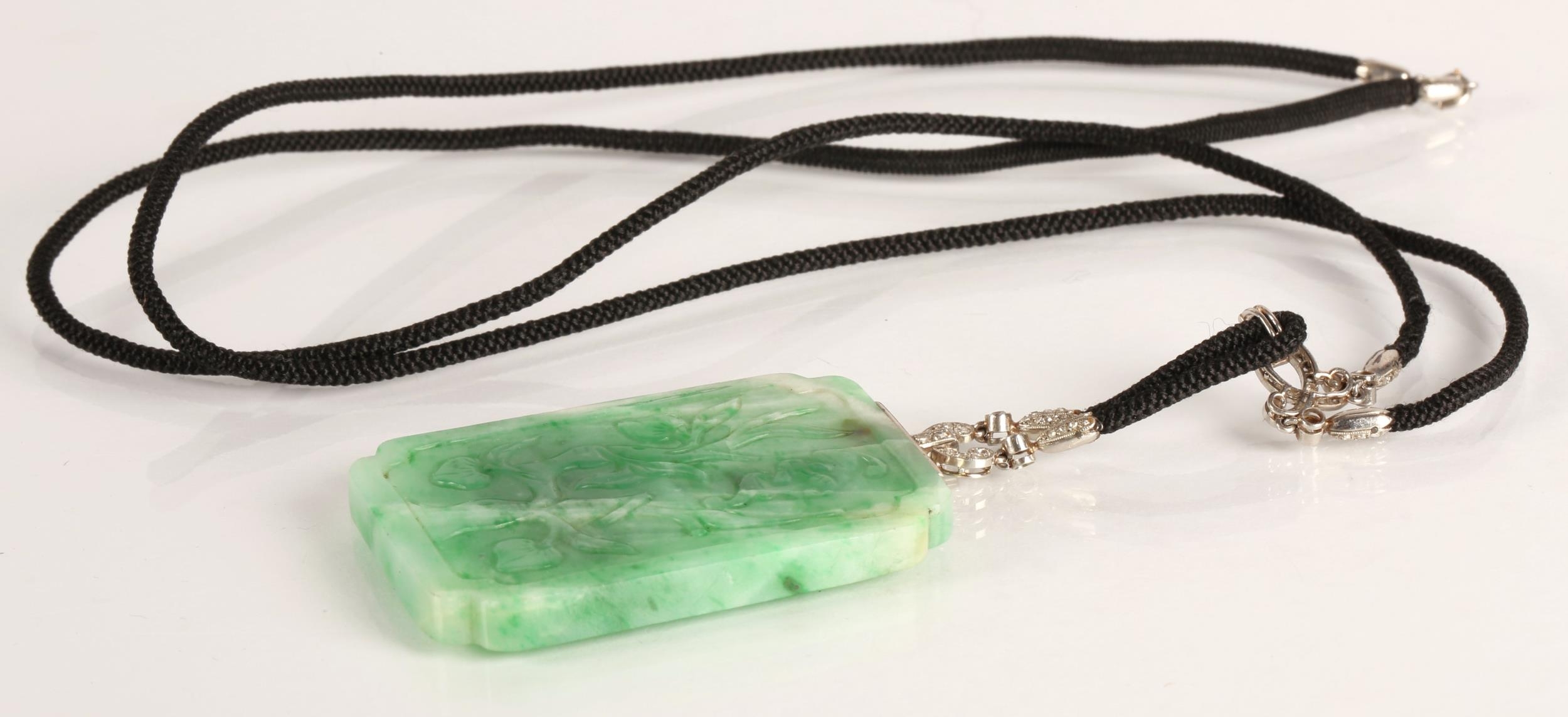 Carved rectangular green jade pendant with diamond set white metal mounts with further diamond set white metal mounts on a cord twist necklace, 5cm x 2.5cm