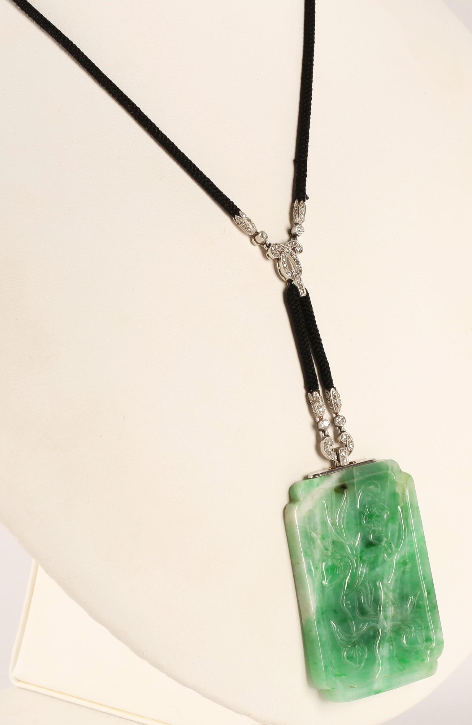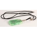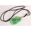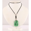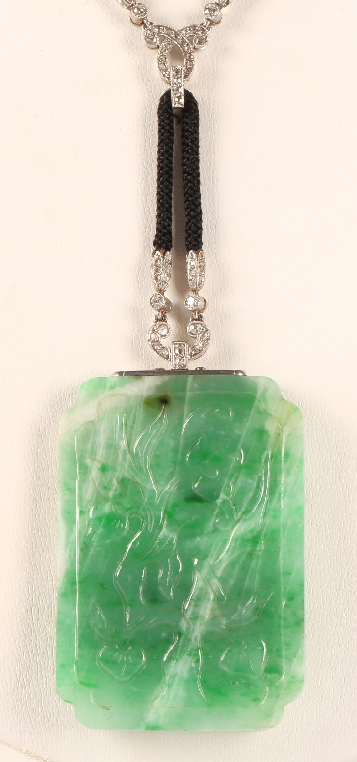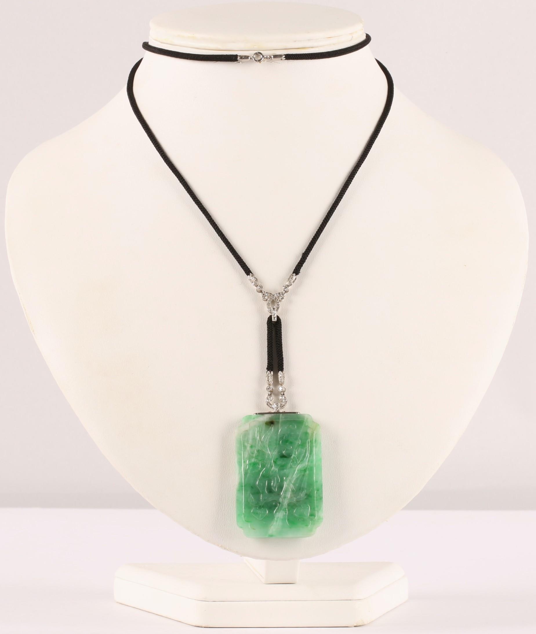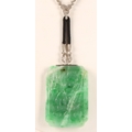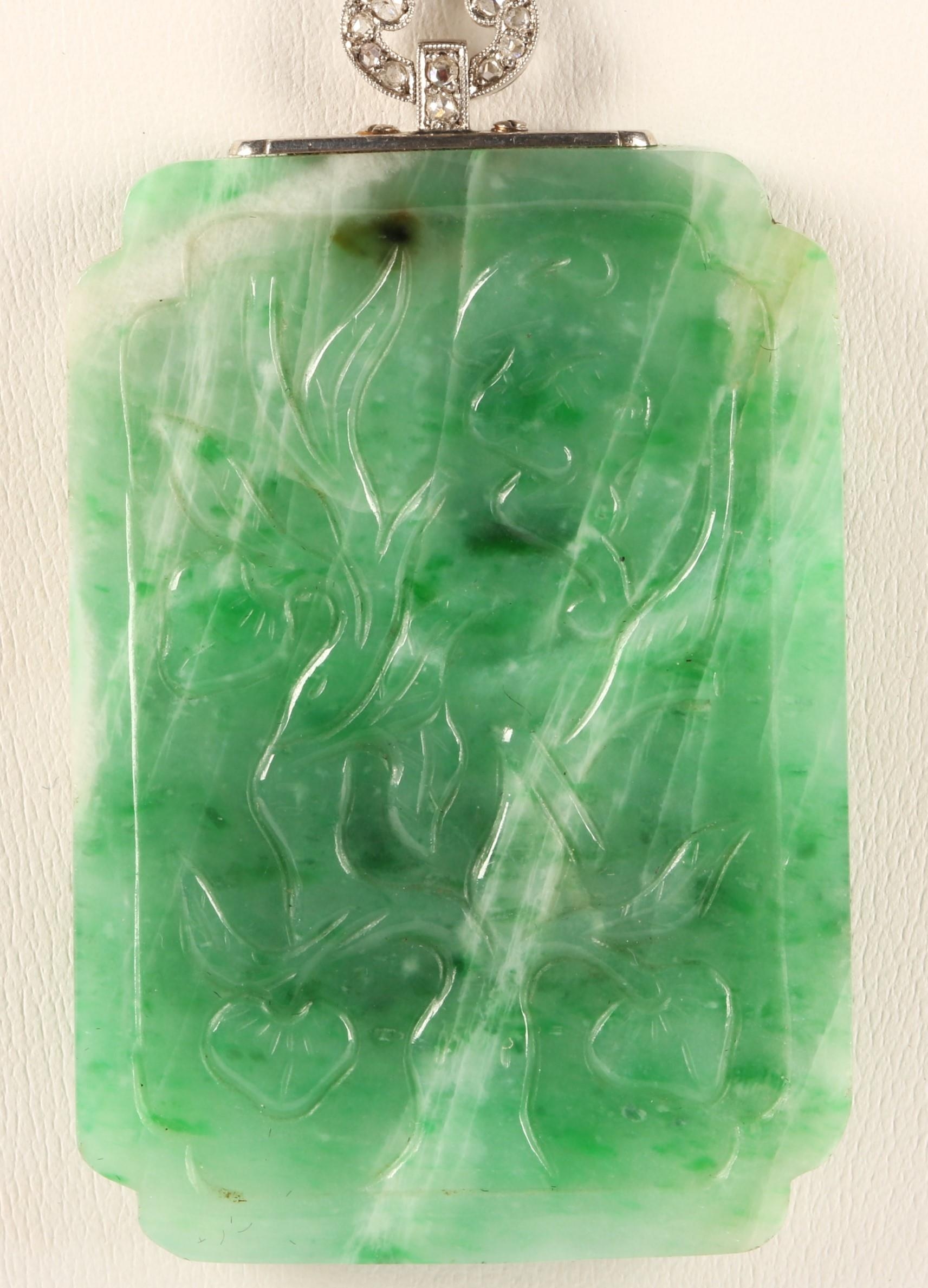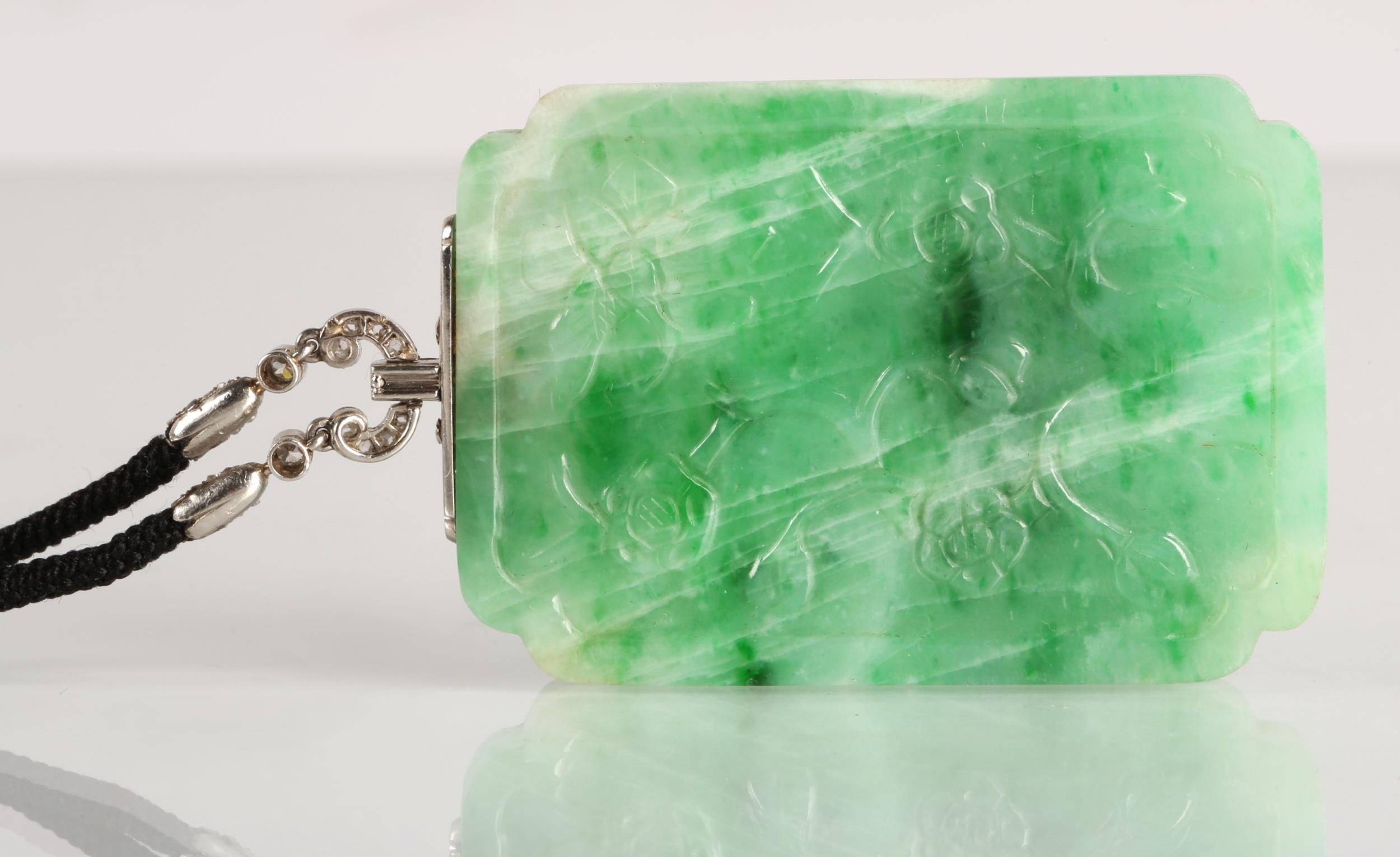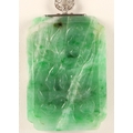 Carved rectangular green jade pendant with diamond set white...