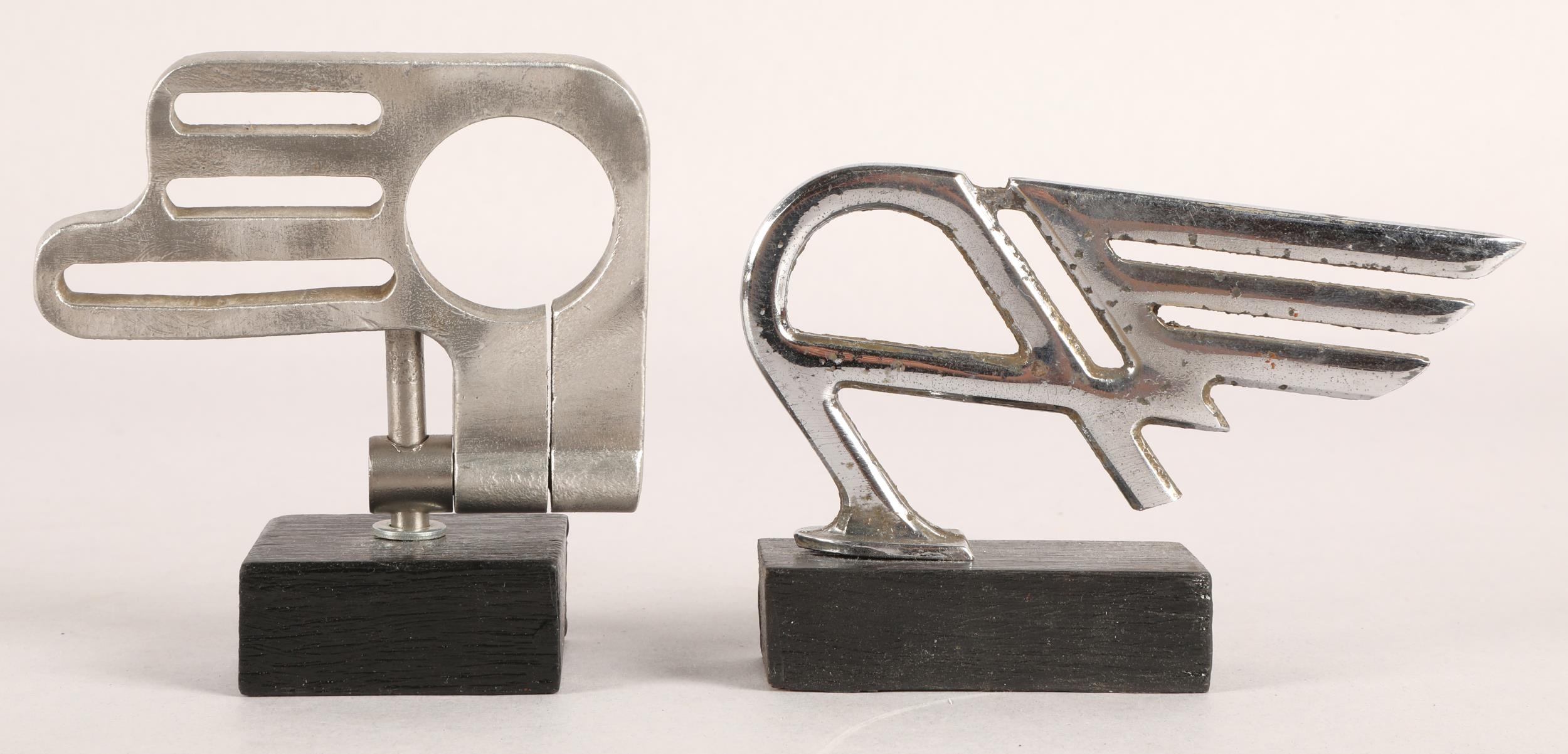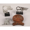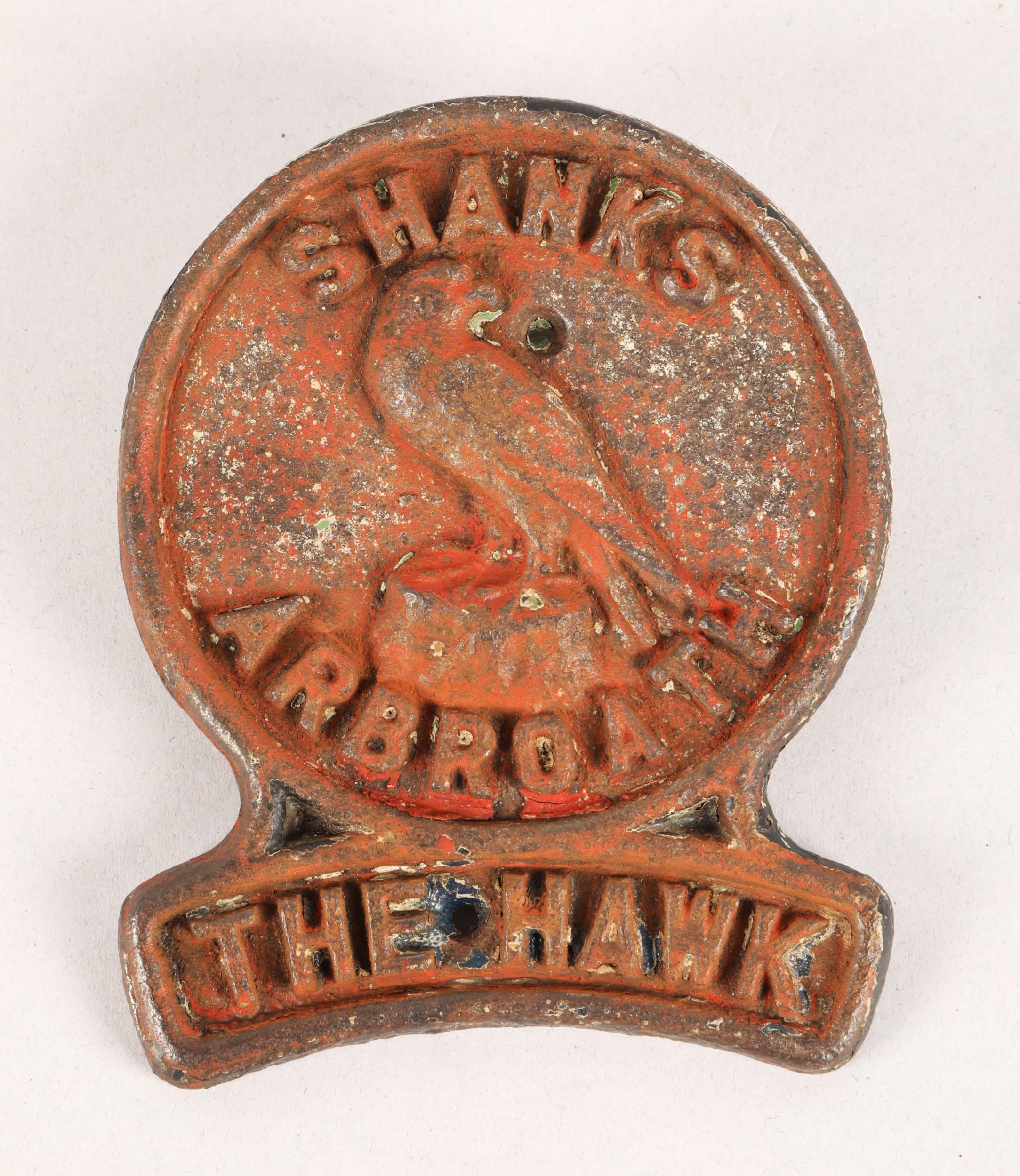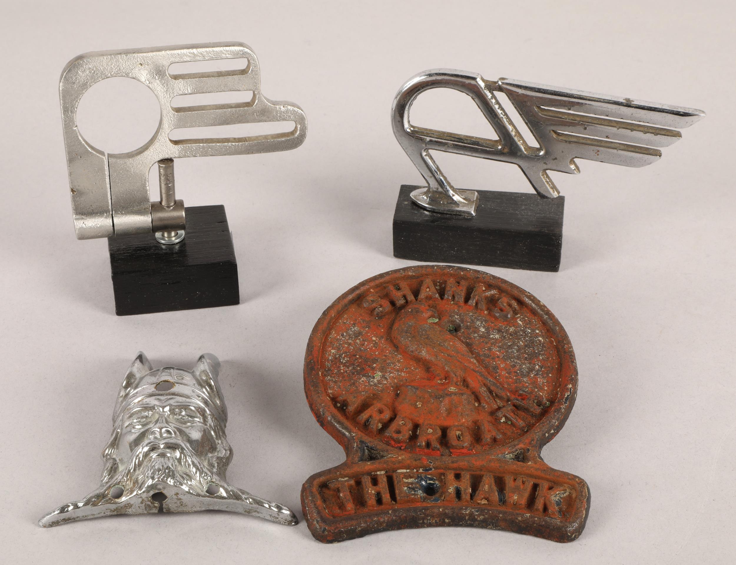 Car mascots and badges and a Shanks Arbroath 'The Hawk' mowe...