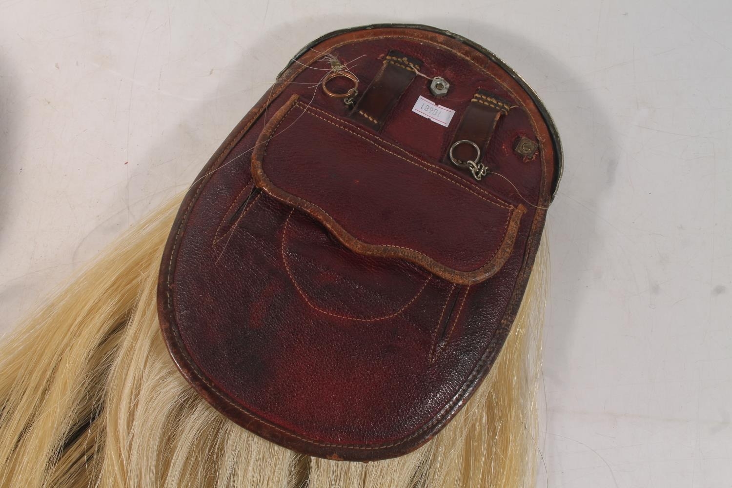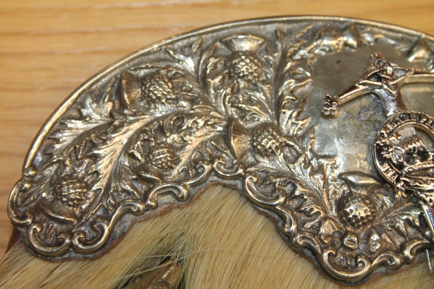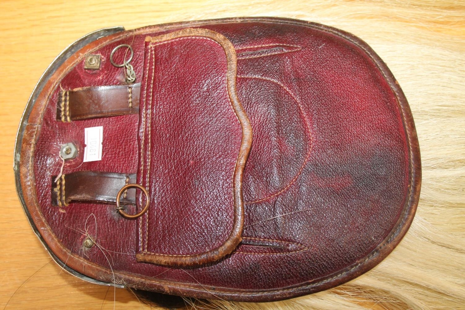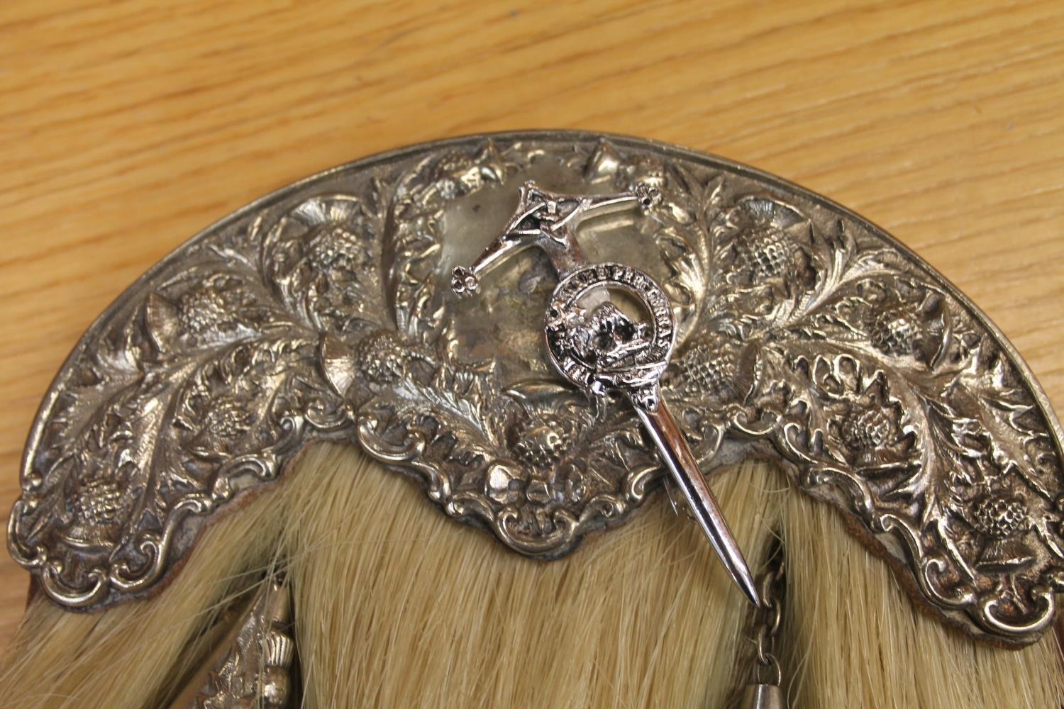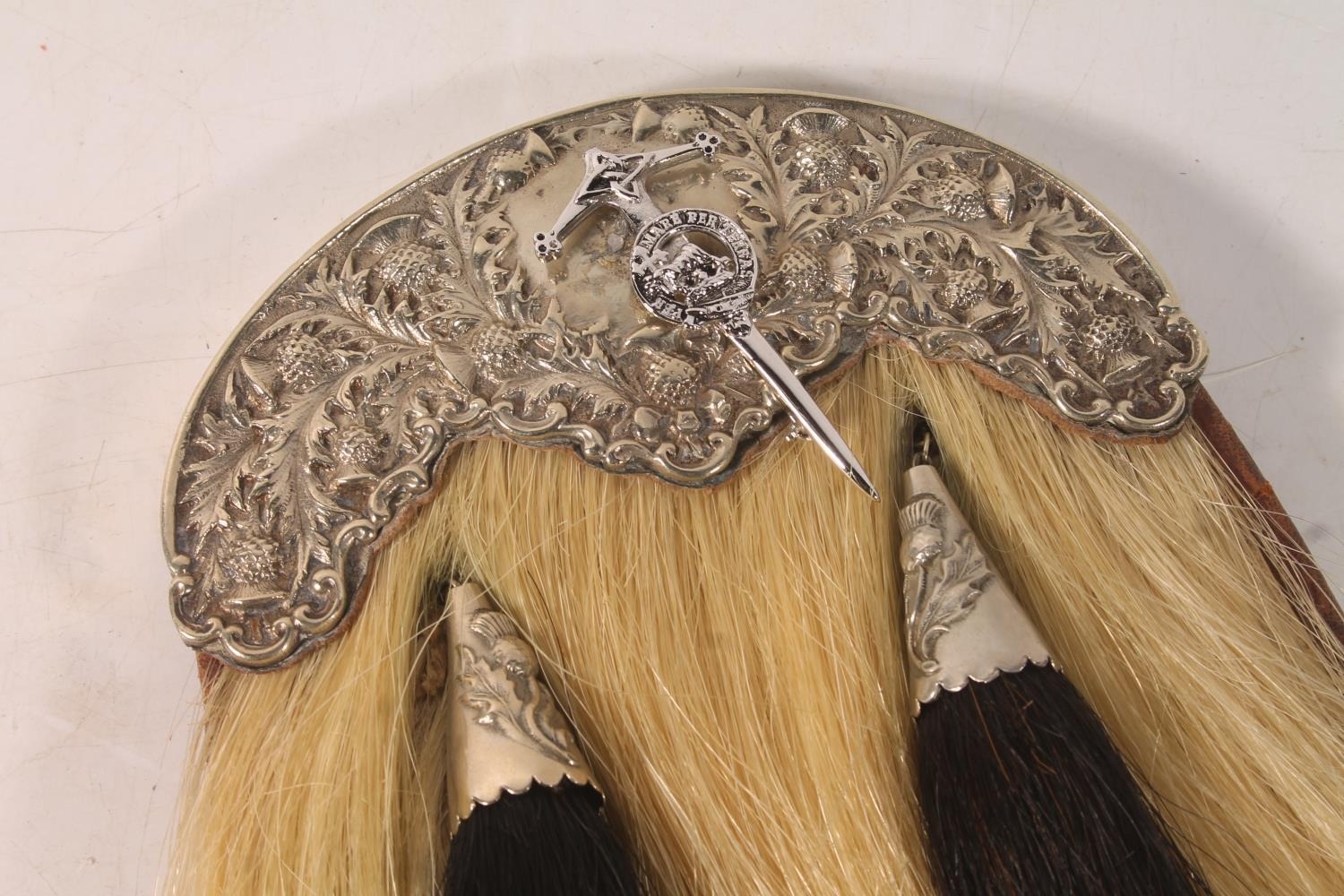 We were unable to remove the kiltpin without risk of damaging the pin or sporran. The sword handle on the kiltpin is broken off. Square nut missing from the back of the sporran at the cantle. No obvious significant damage to the stitching.