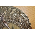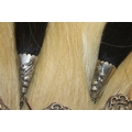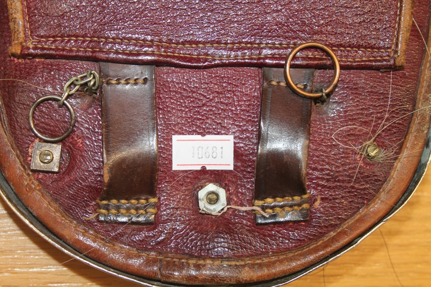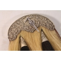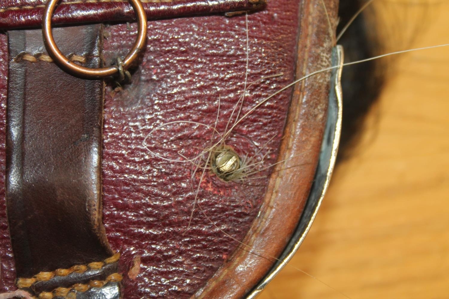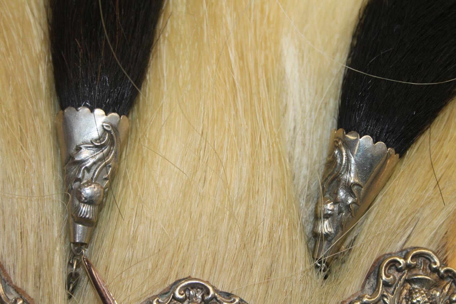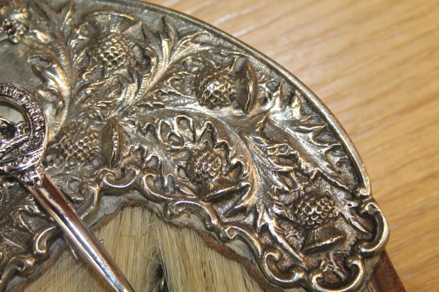 We were unable to remove the kiltpin without risk of damaging the pin or sporran. The sword handle on the kiltpin is broken off. Square nut missing from the back of the sporran at the cantle. No obvious significant damage to the stitching.